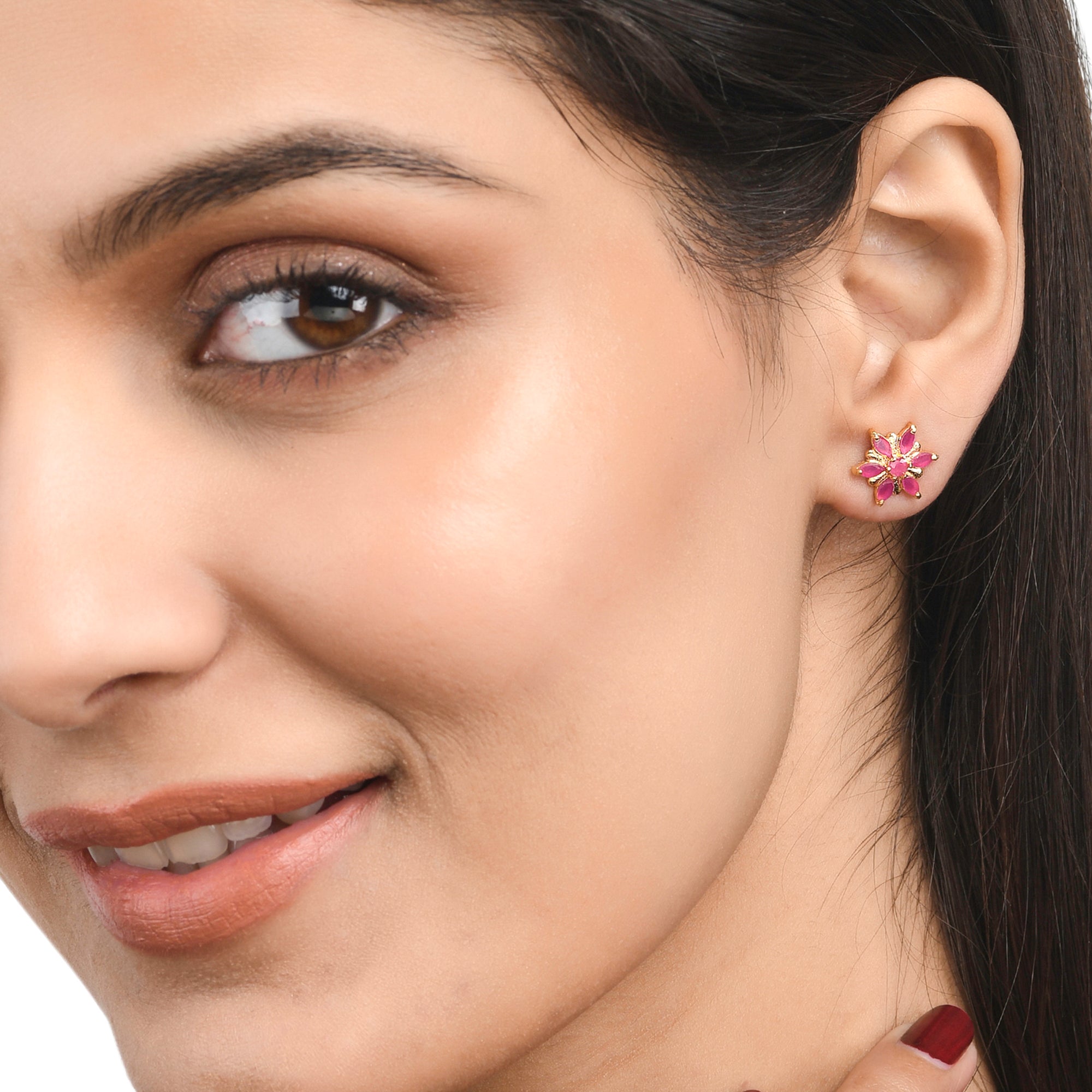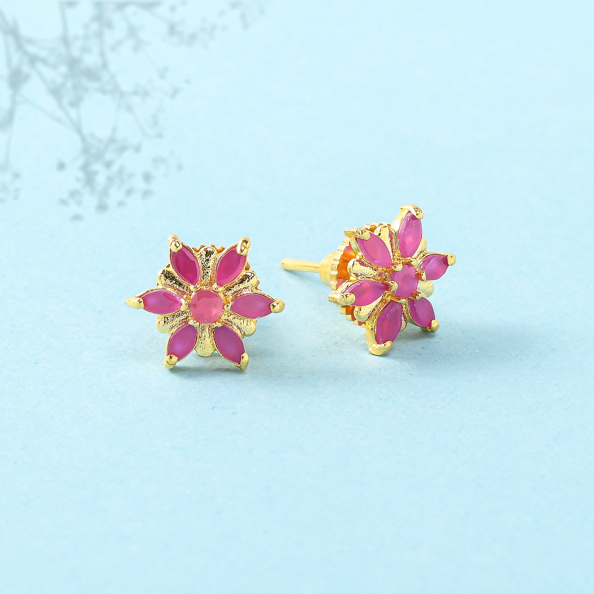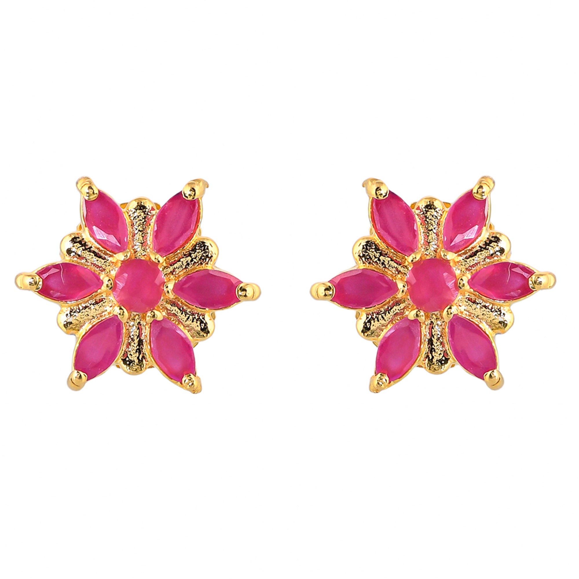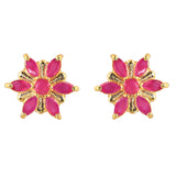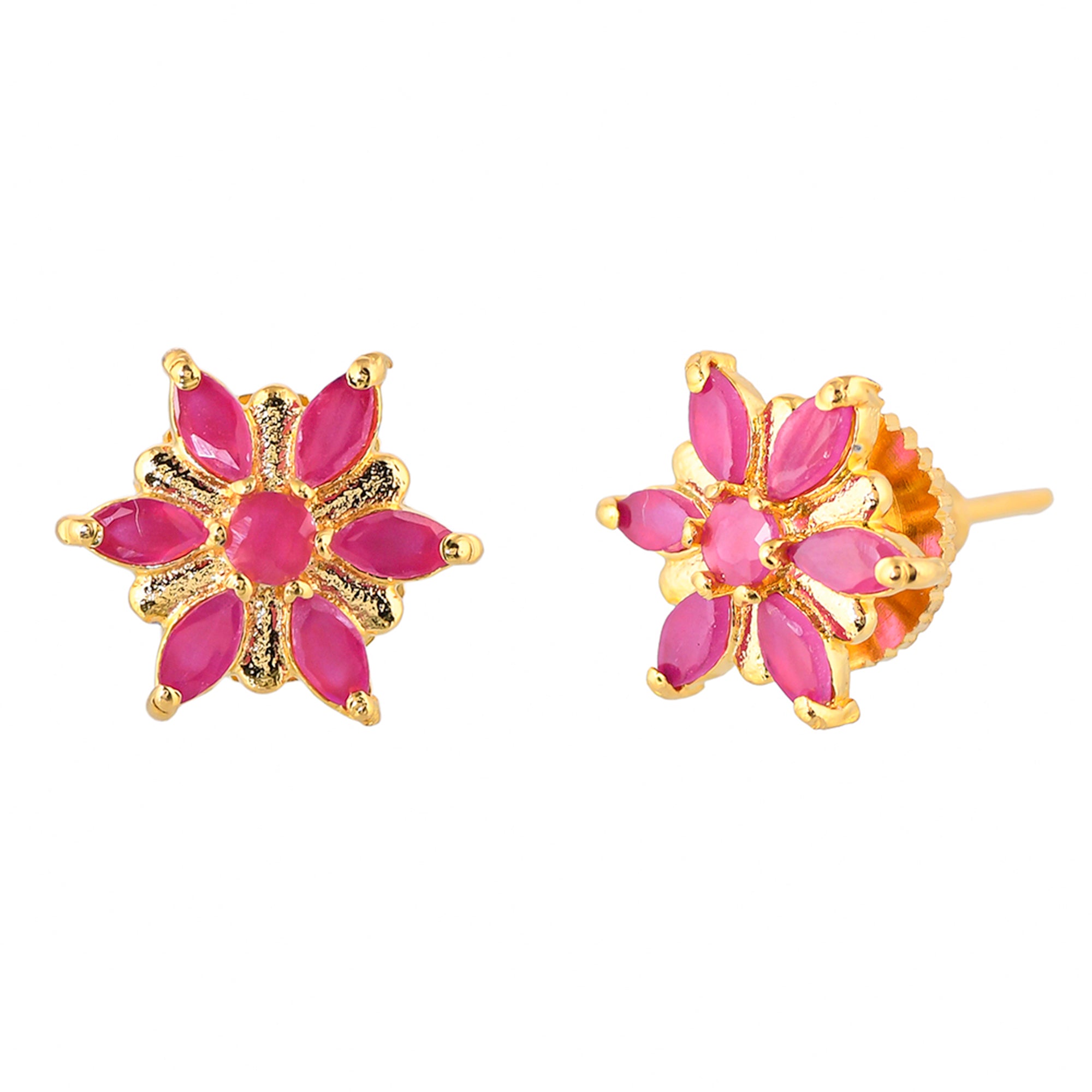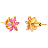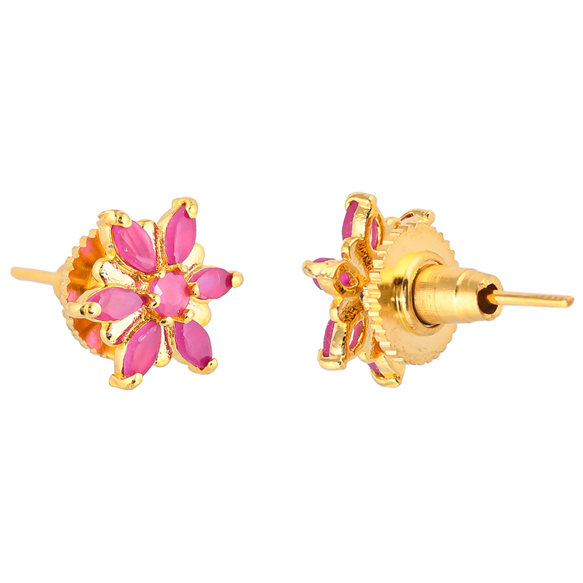 Brass stud earrings with yellow gold plating and pink CZ gemstones. Pair with casual looks.
