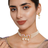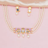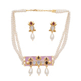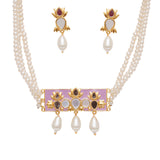 Festive Hues Pink Pearl String Short Necklace with Mirror Work Enameled Motif