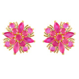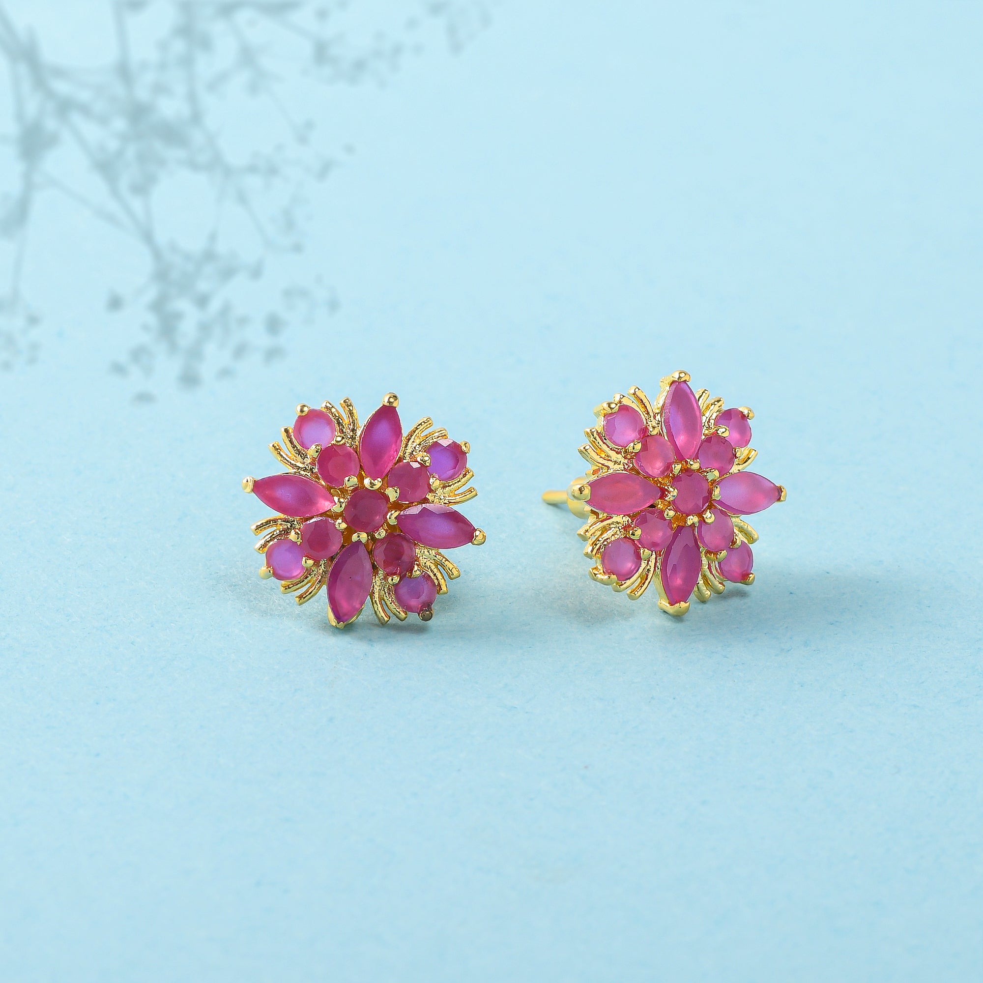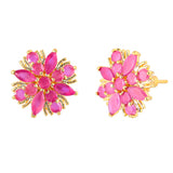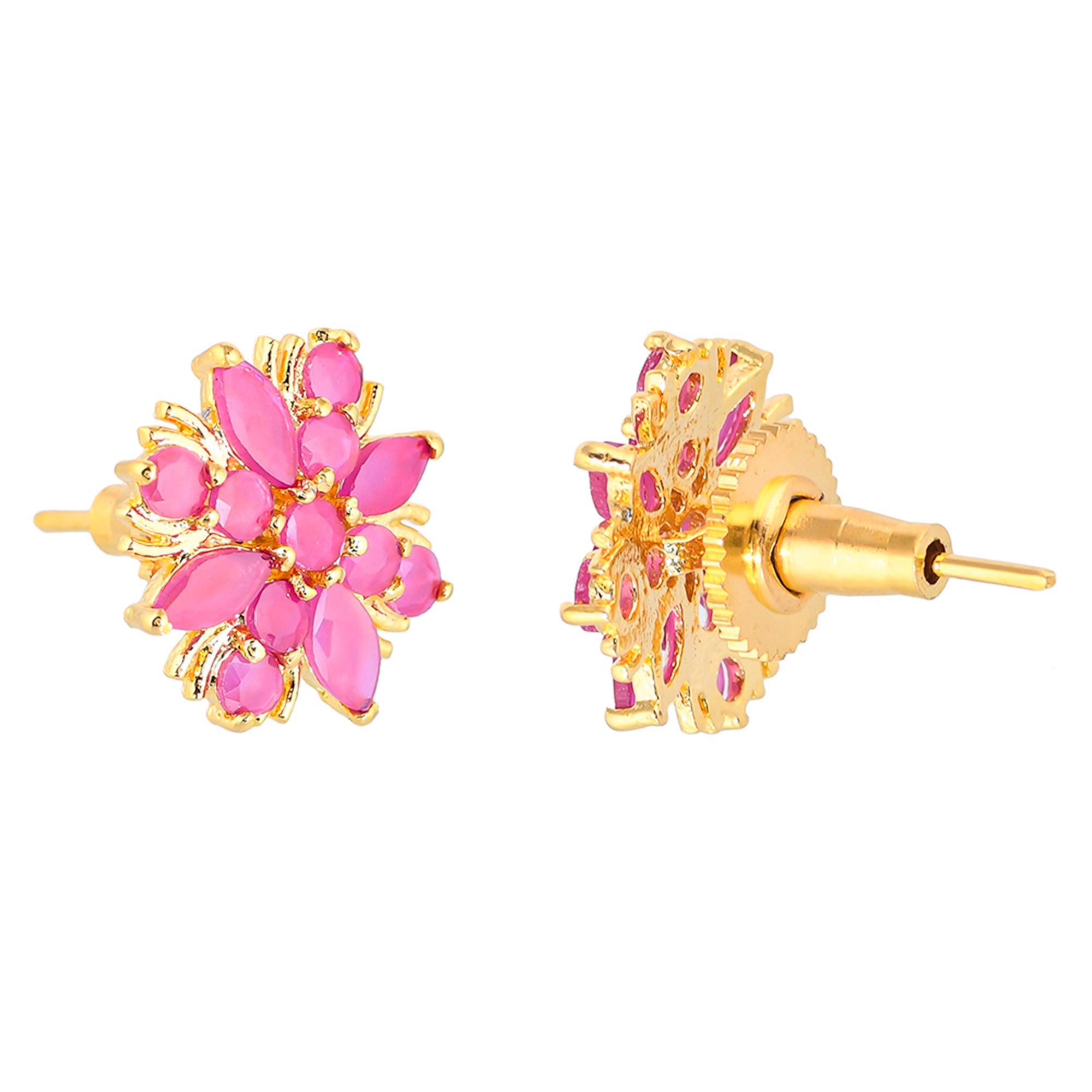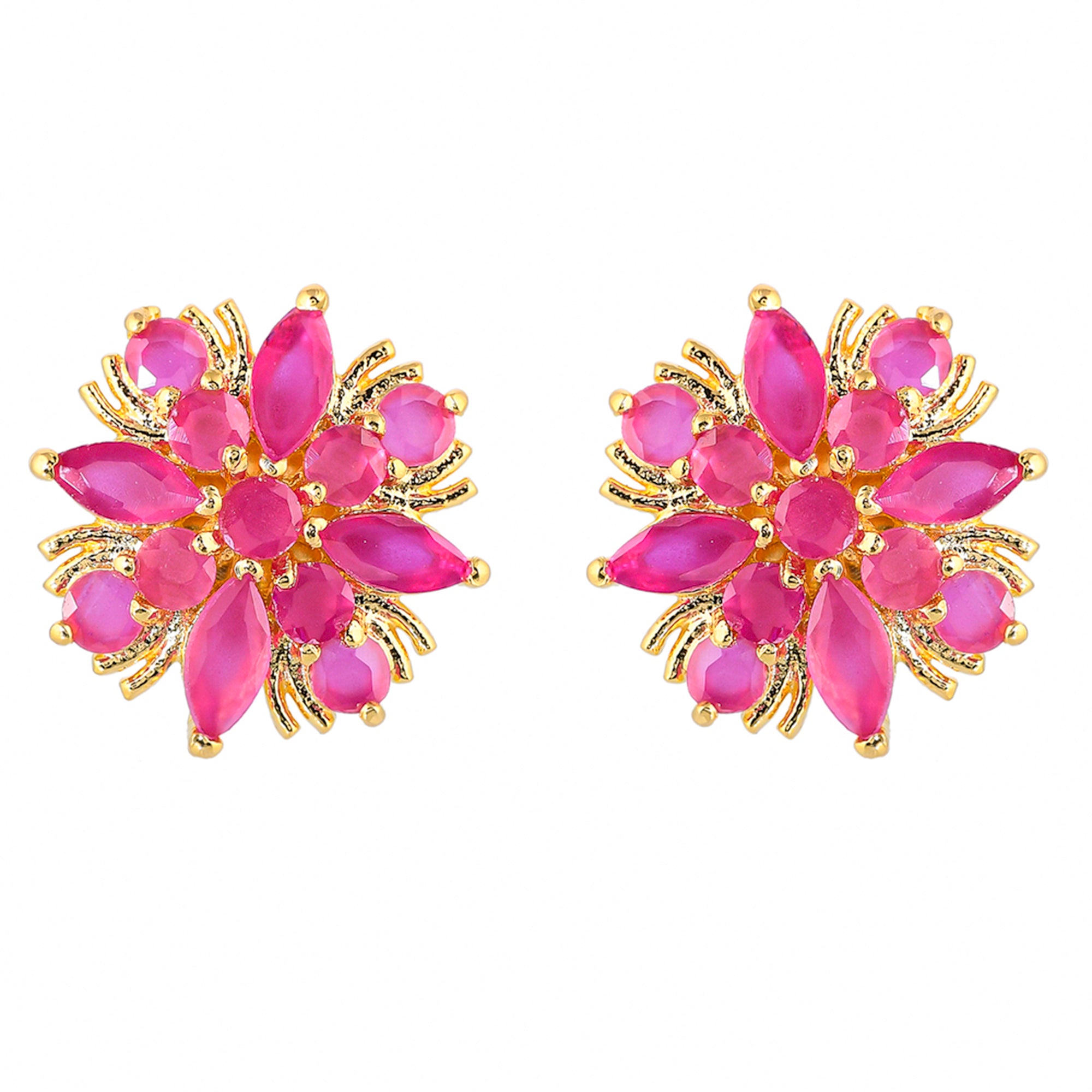 Pink round and marquise cut CZ gems adorned floral motif stud earrings. Fashioned out of brass and gold plated. Wear with casual attire.