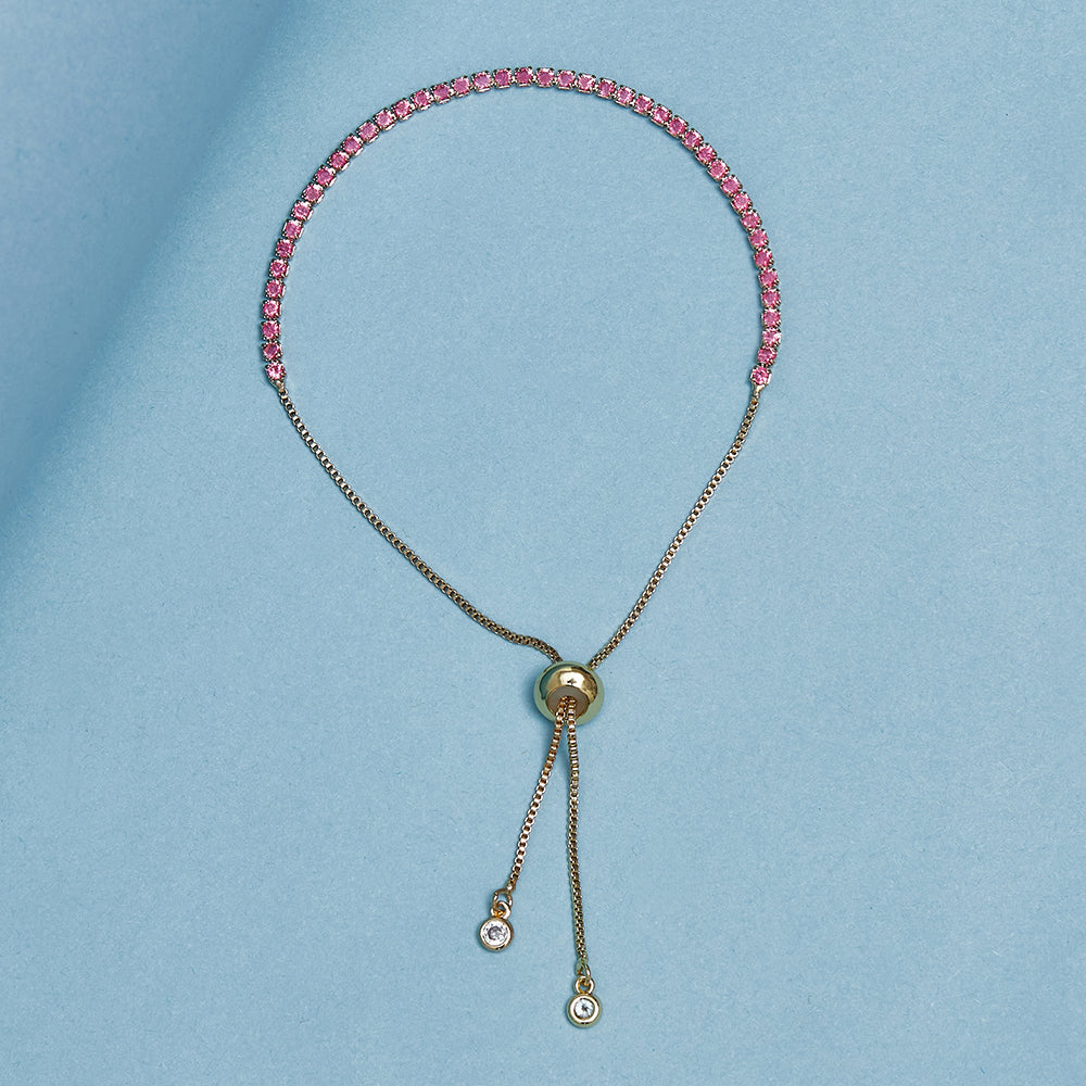 Brass chain style bracelet, featuring a classic yellow gold plating. Embellished with round cut pink CZ gemstones, the slop-on bracelet can be paired with a formal gown, chiffon saree, casual jeans or even work wear.