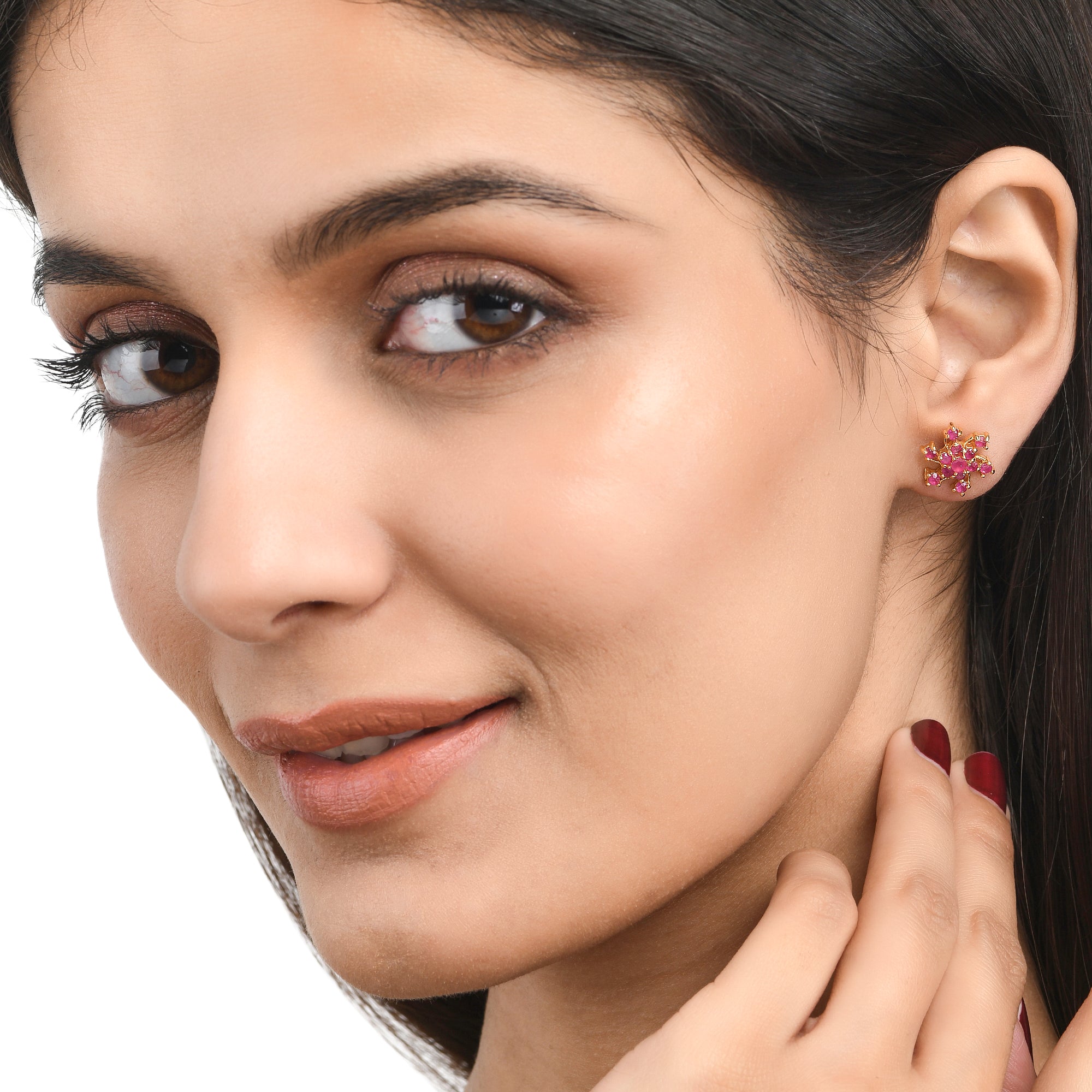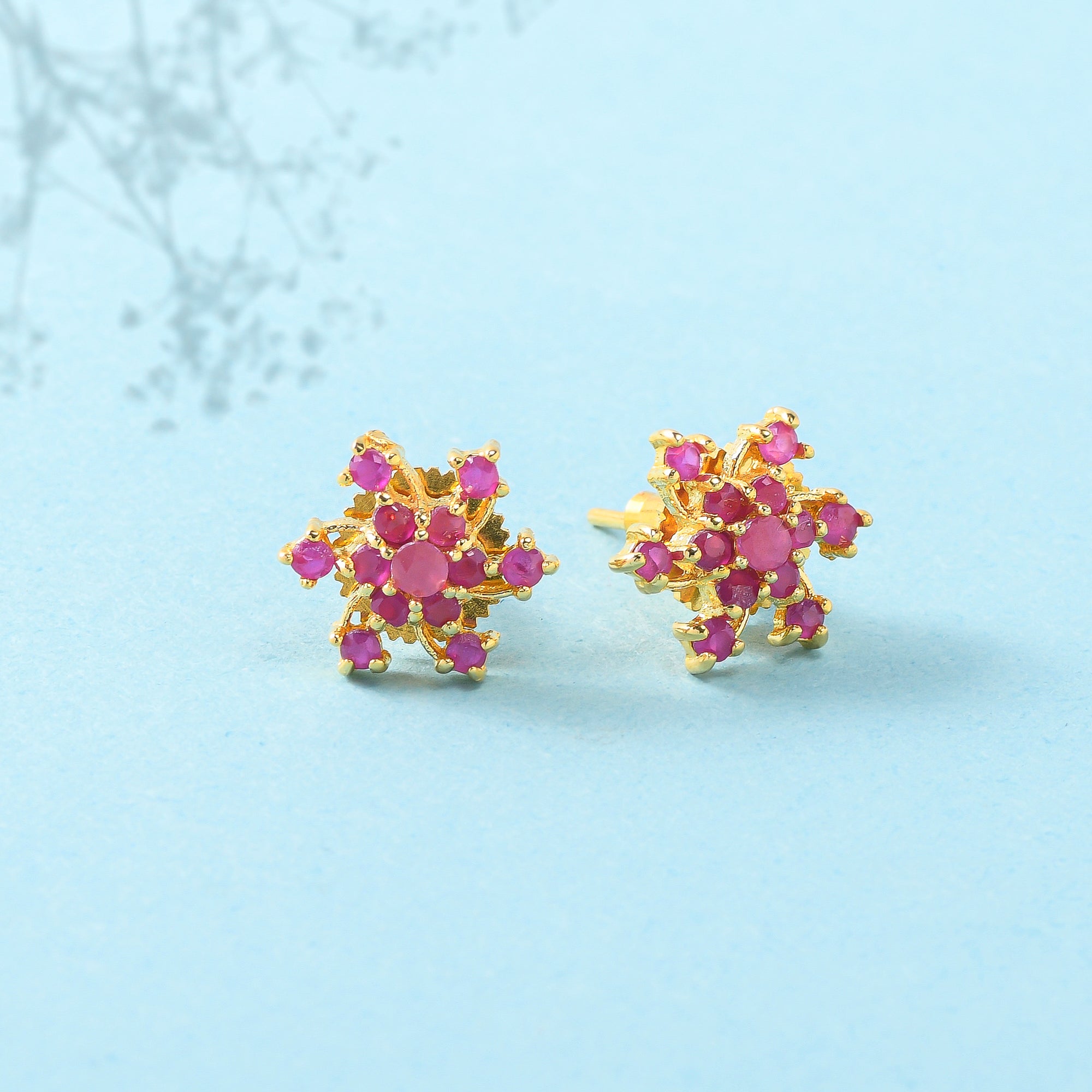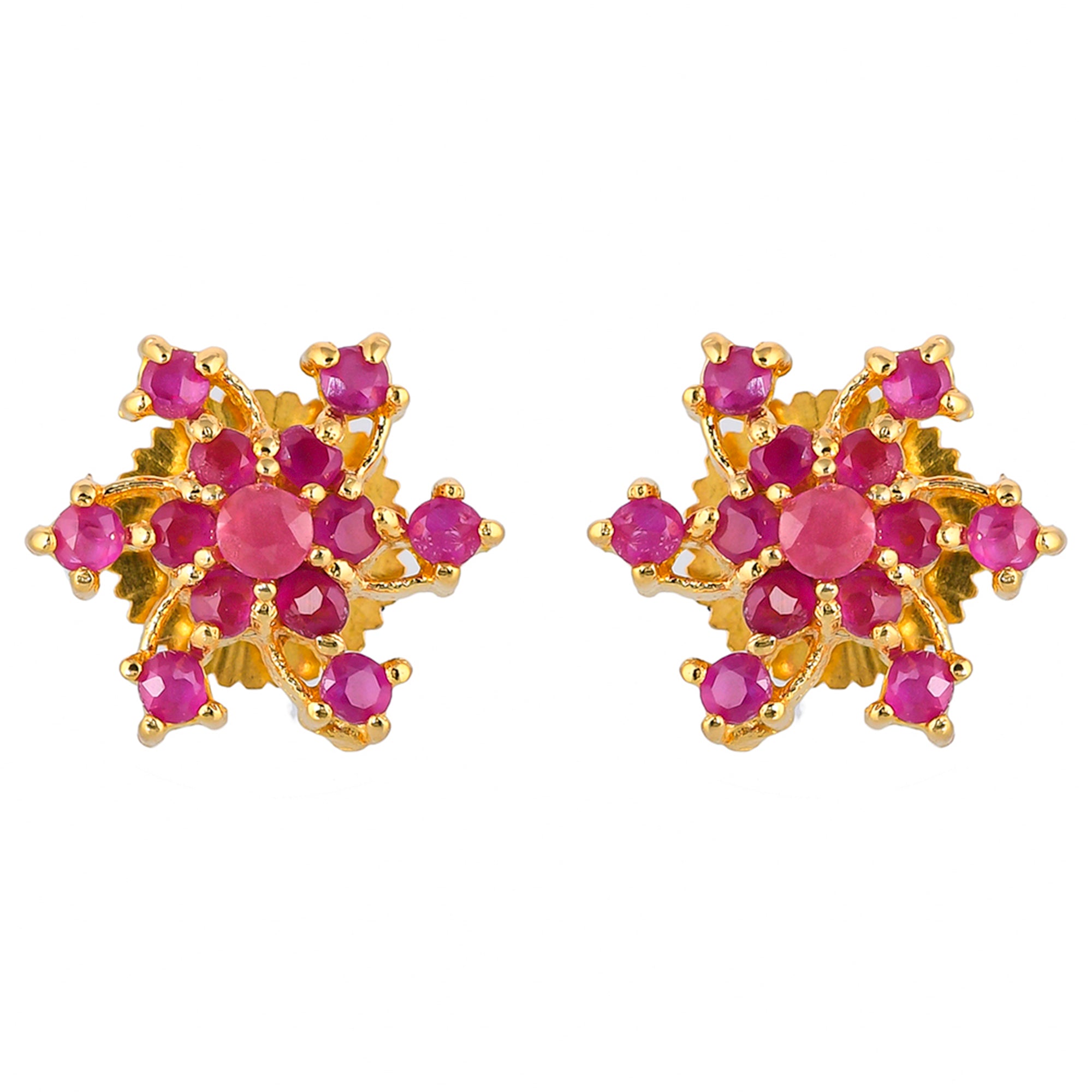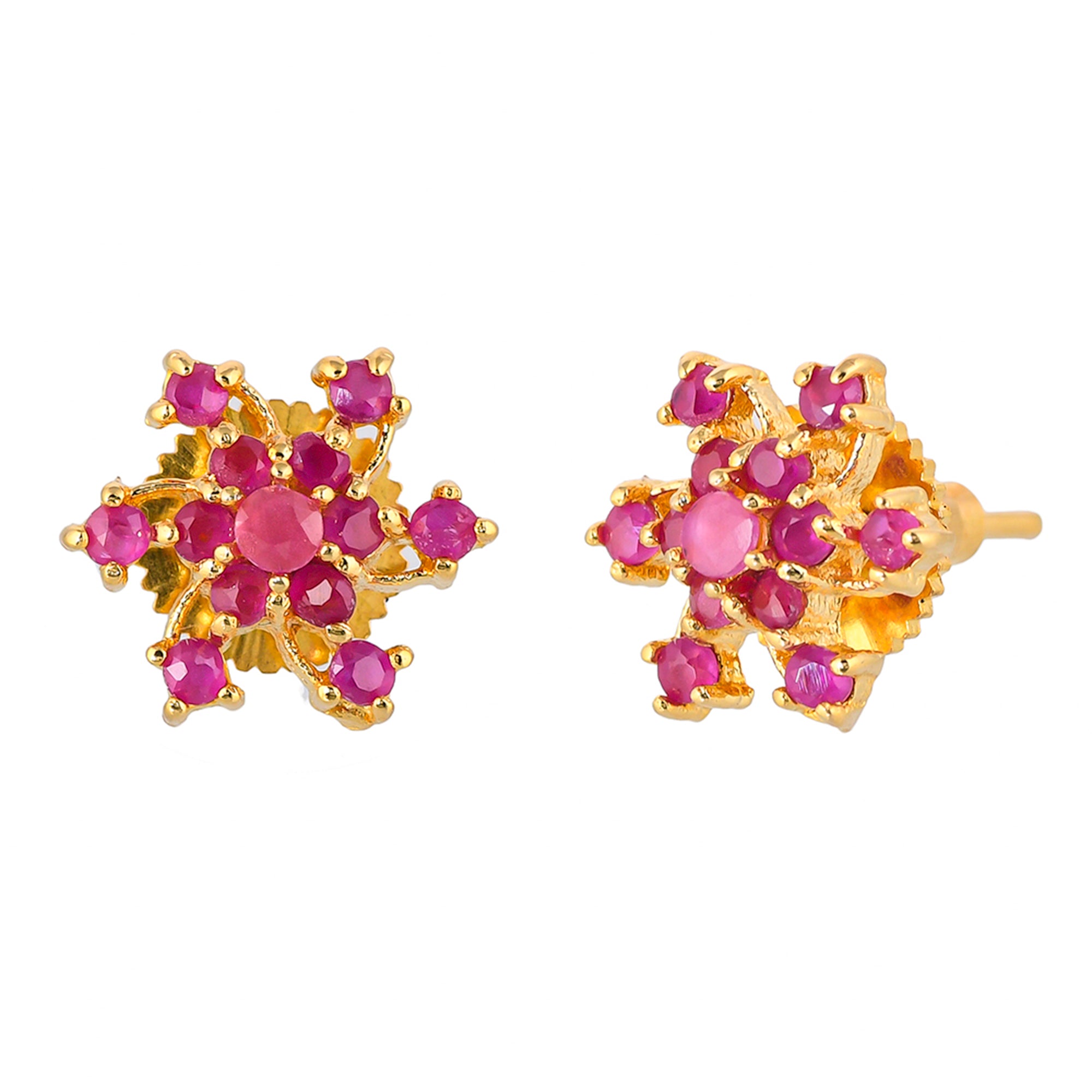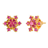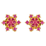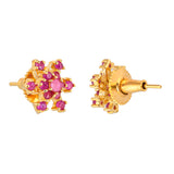 Pink round cut CZ gems adorned brass stud earrings with yellow gold plating. Wear with everyday attire.