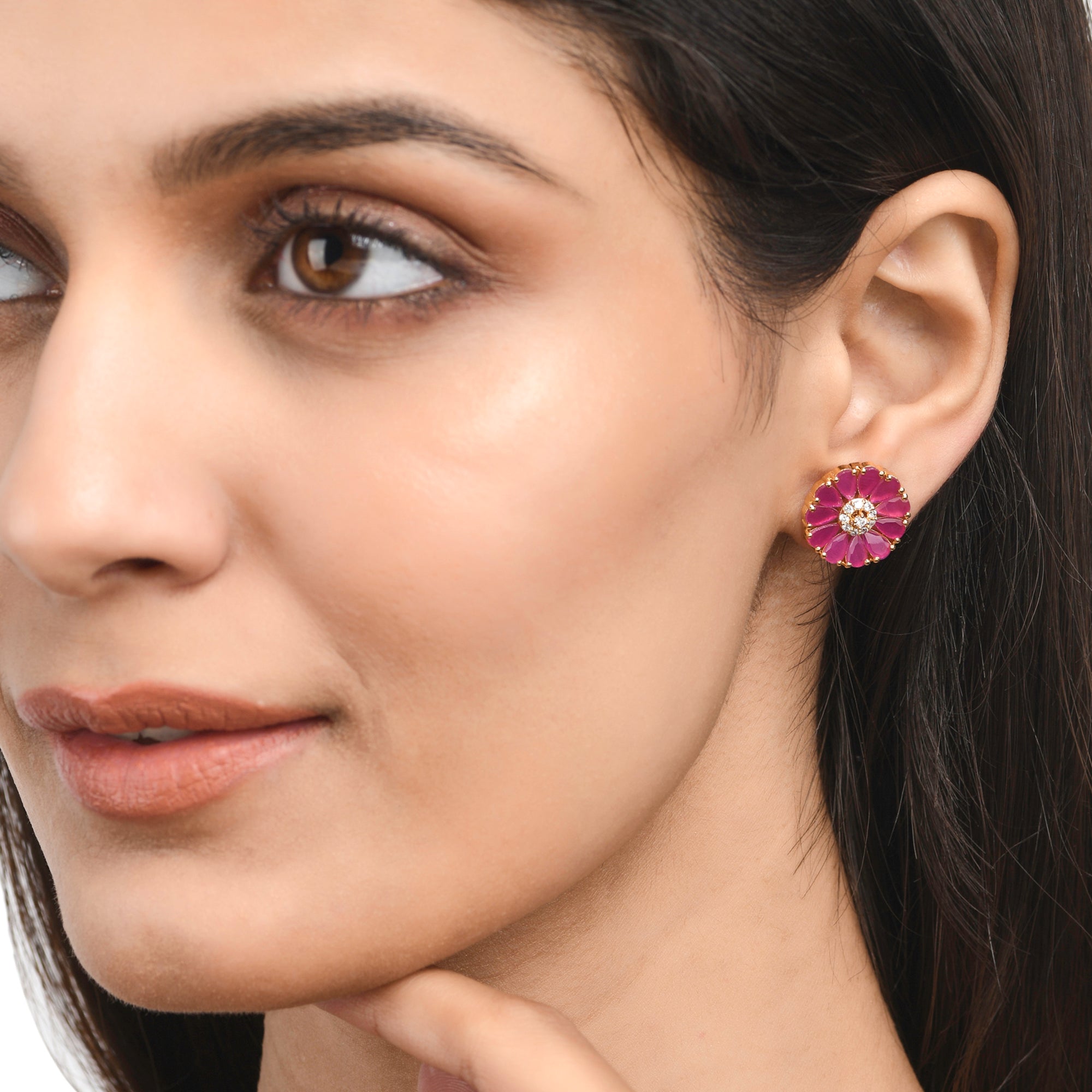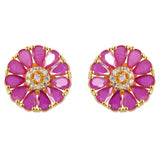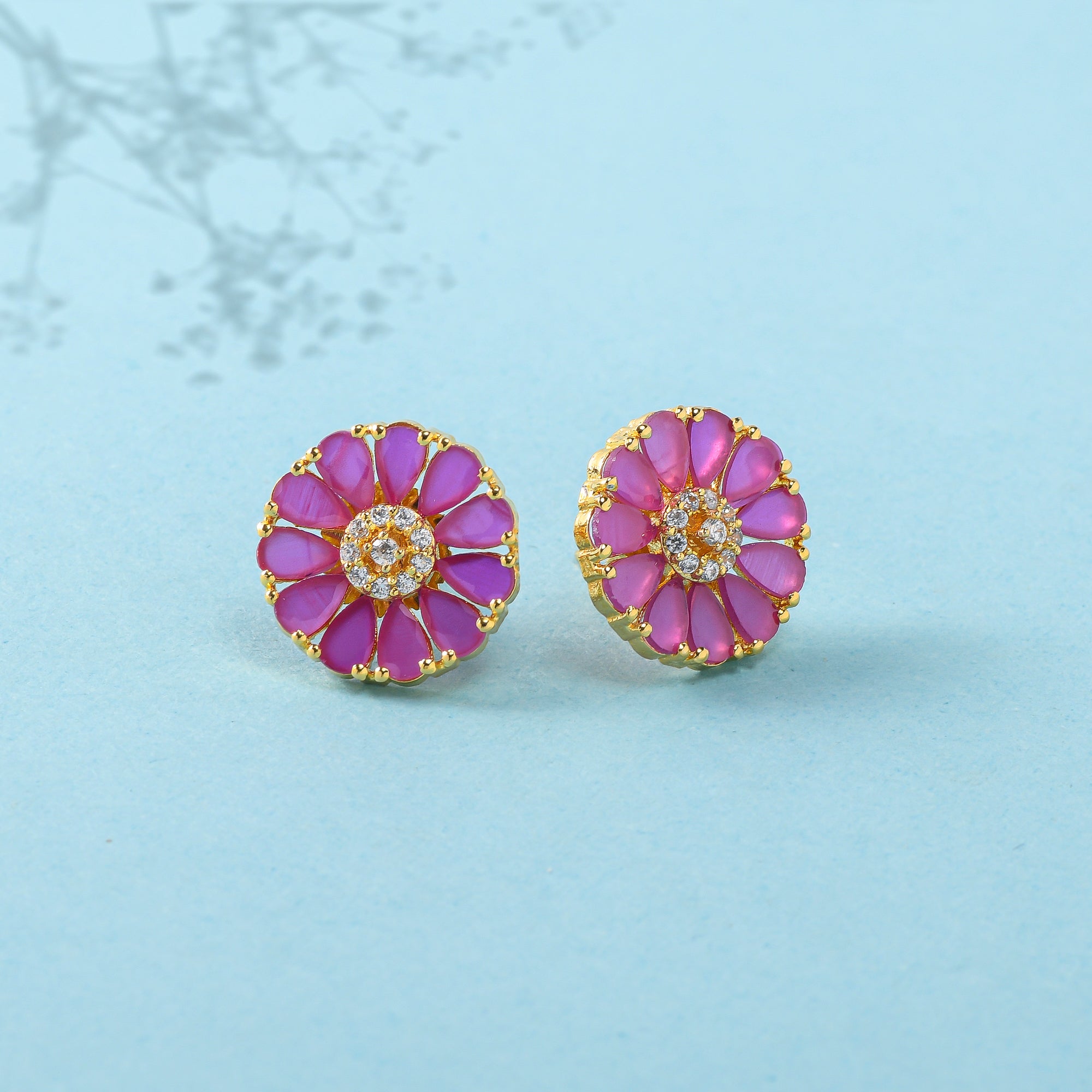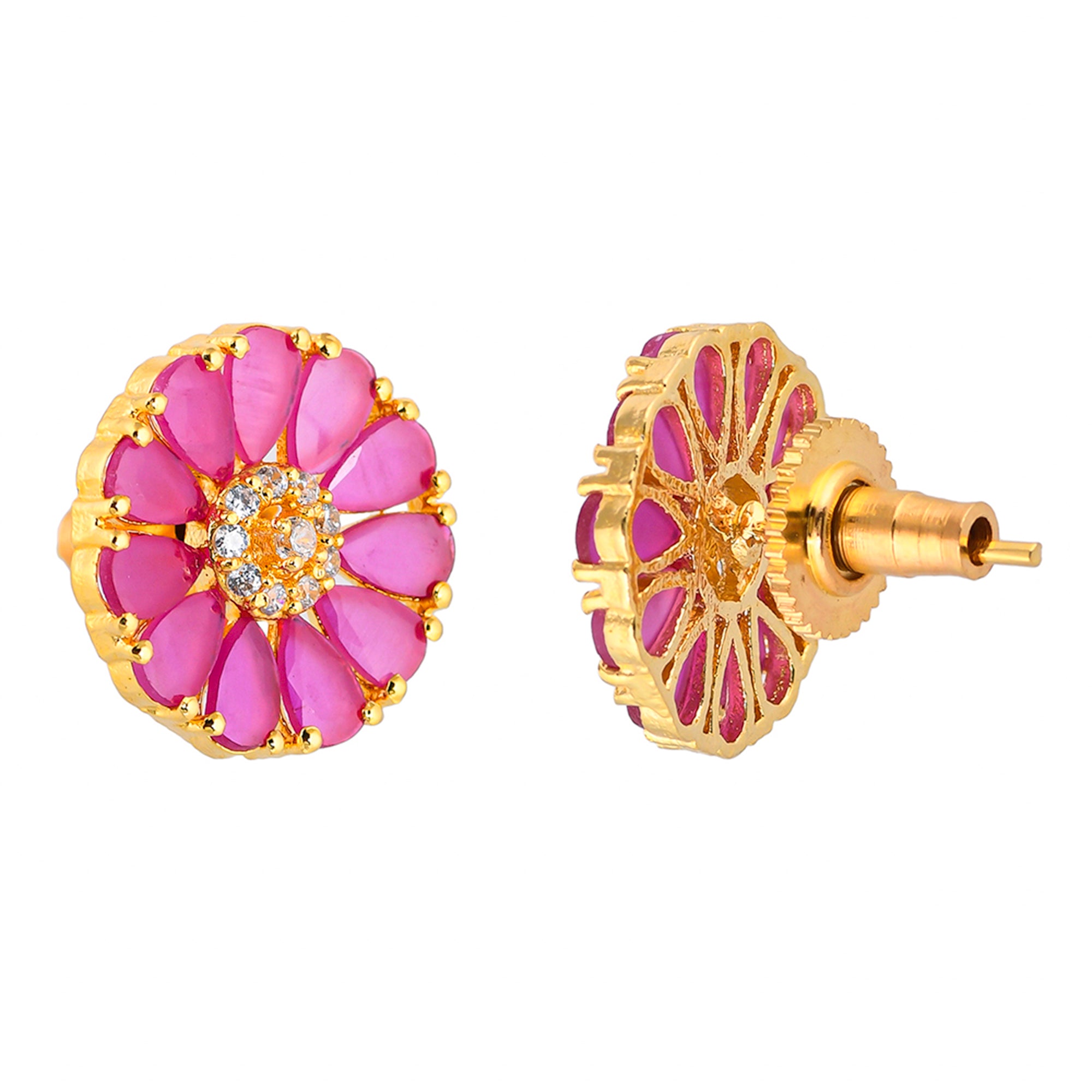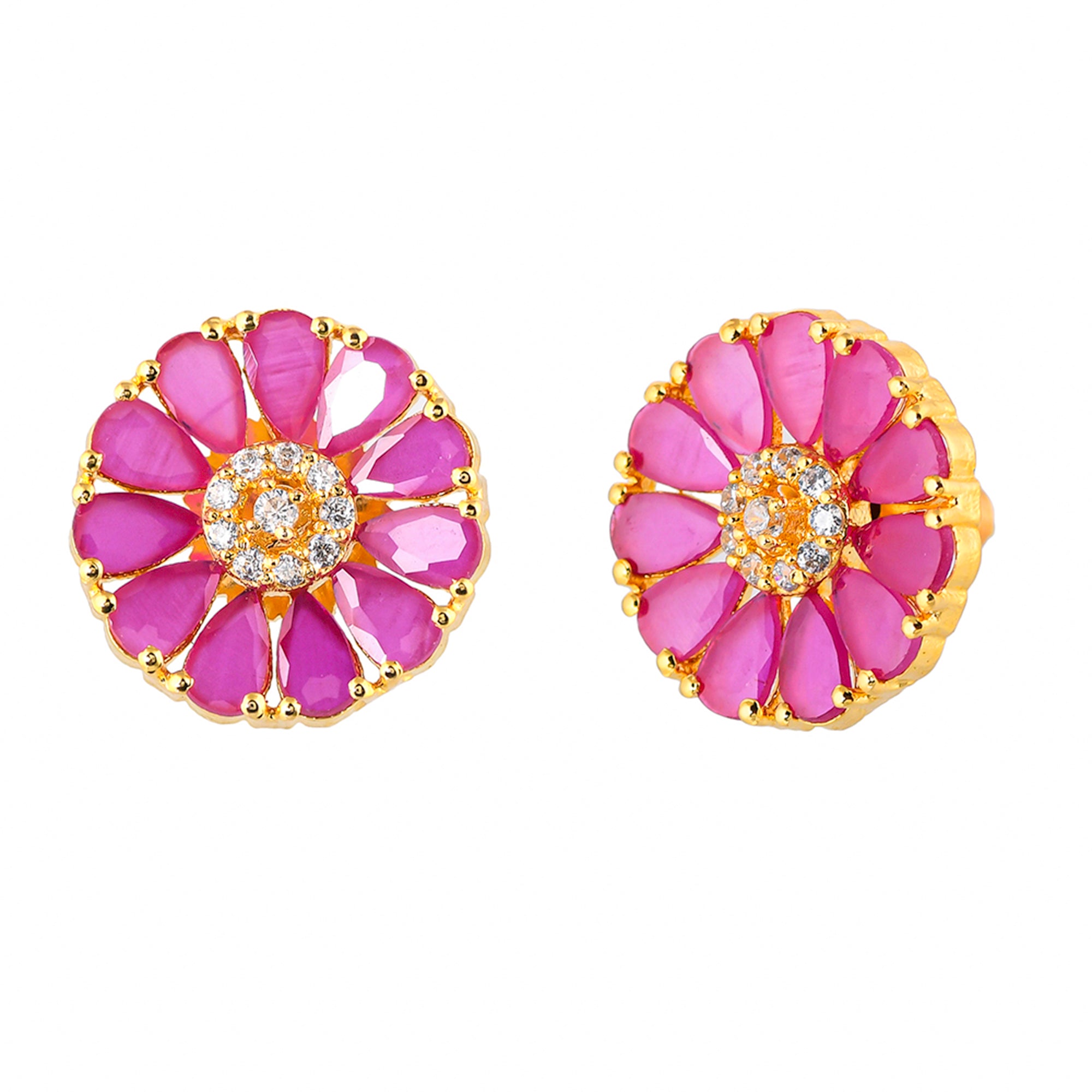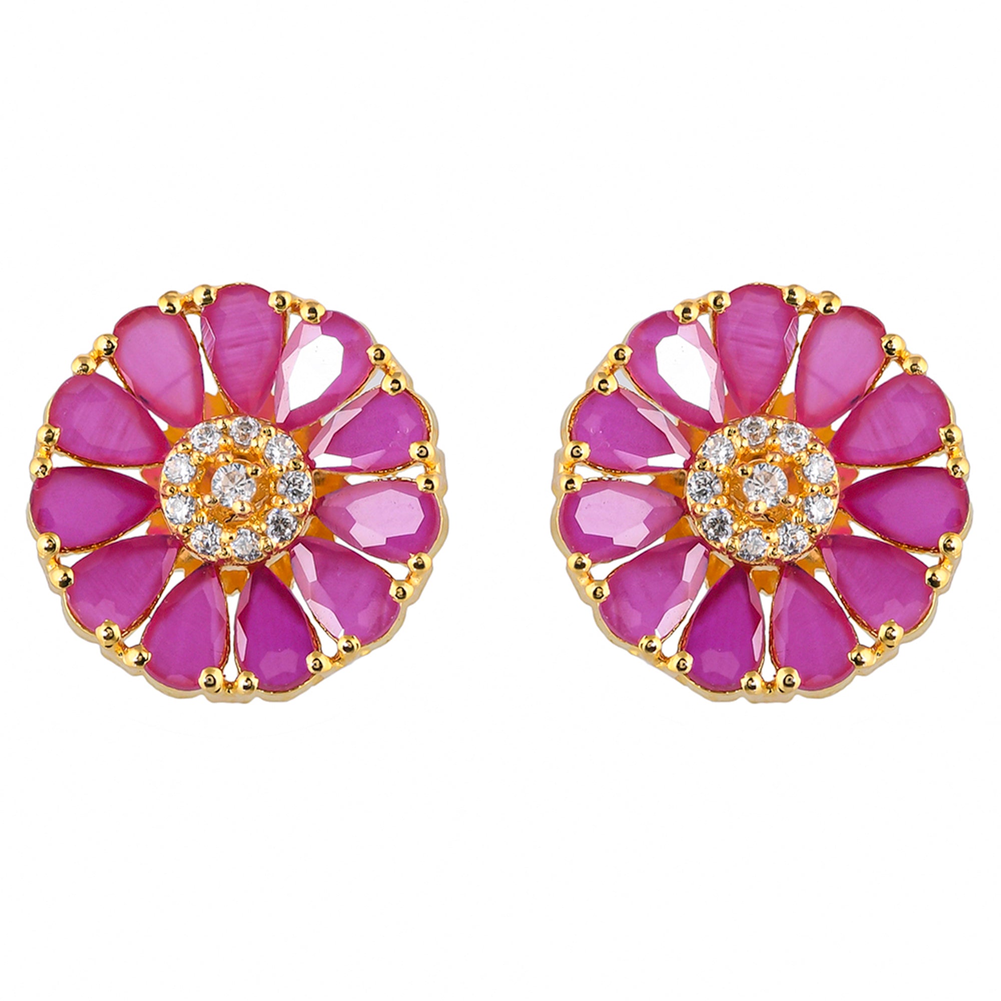 Pink teardrop cut zircons stud earrings. Made from brass and yellow gold plated. Match with everyday looks.