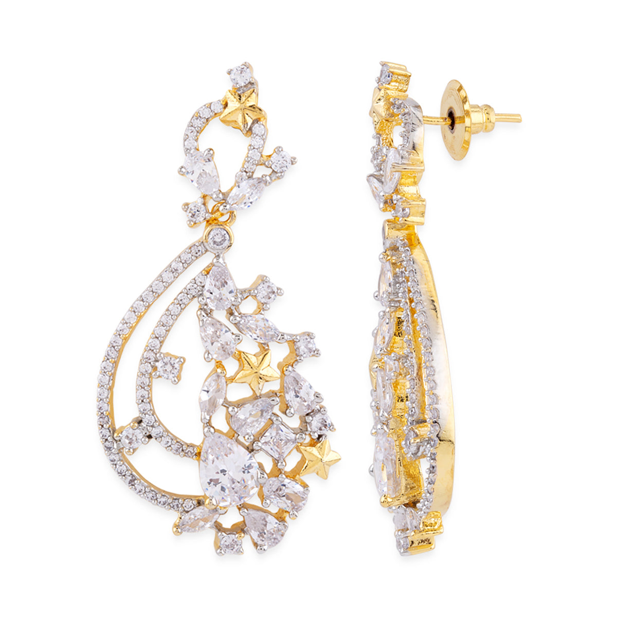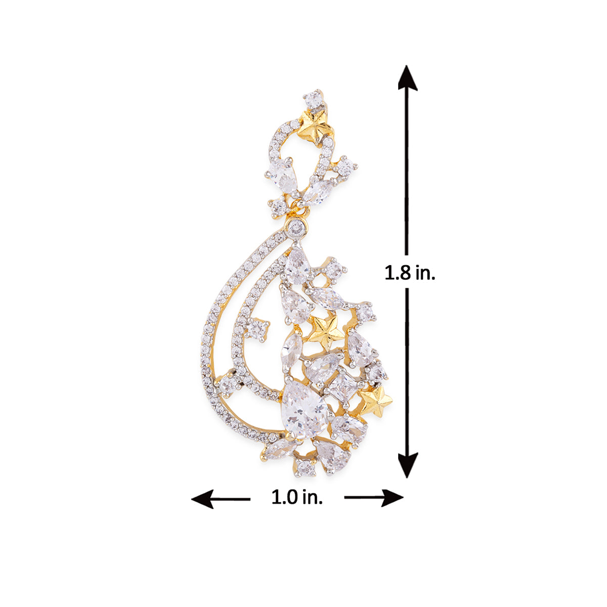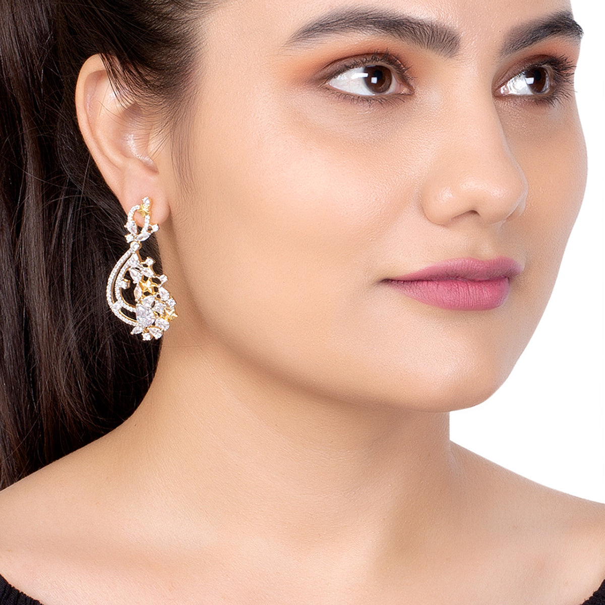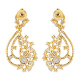 For a classy look, you can ditch your heavy necklace and wear just these earrings. These earrings feature American Diamond sparkling stones for a nice shine and are made out of brass with a dual tone finish. They are best adorned with evening gowns, floor length Anarkalis, and even long Kurtis.