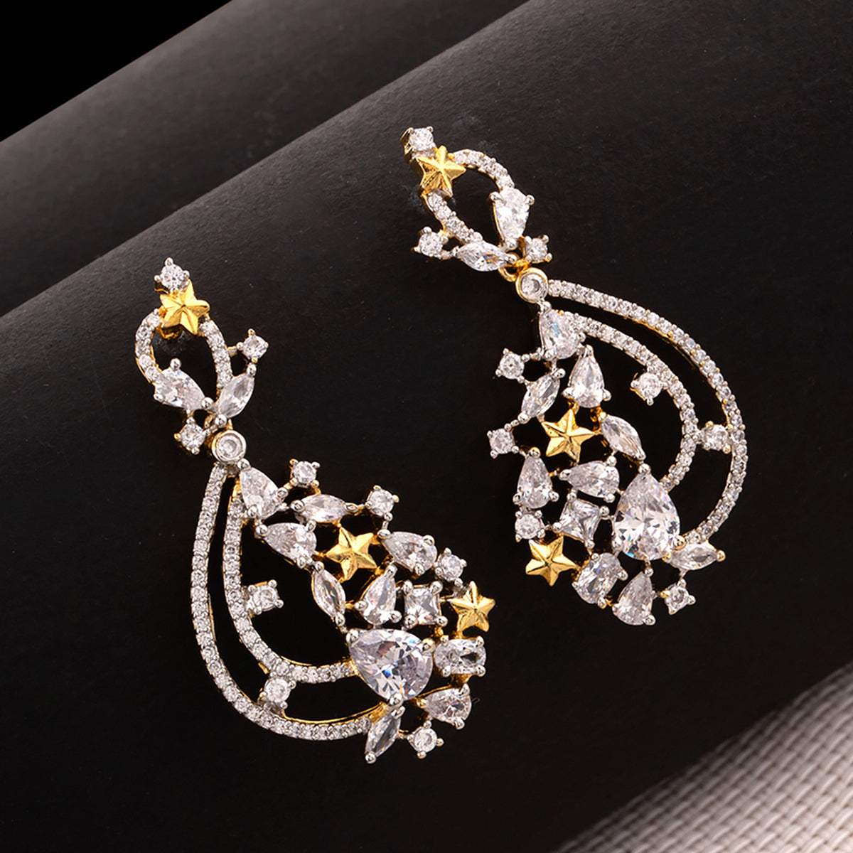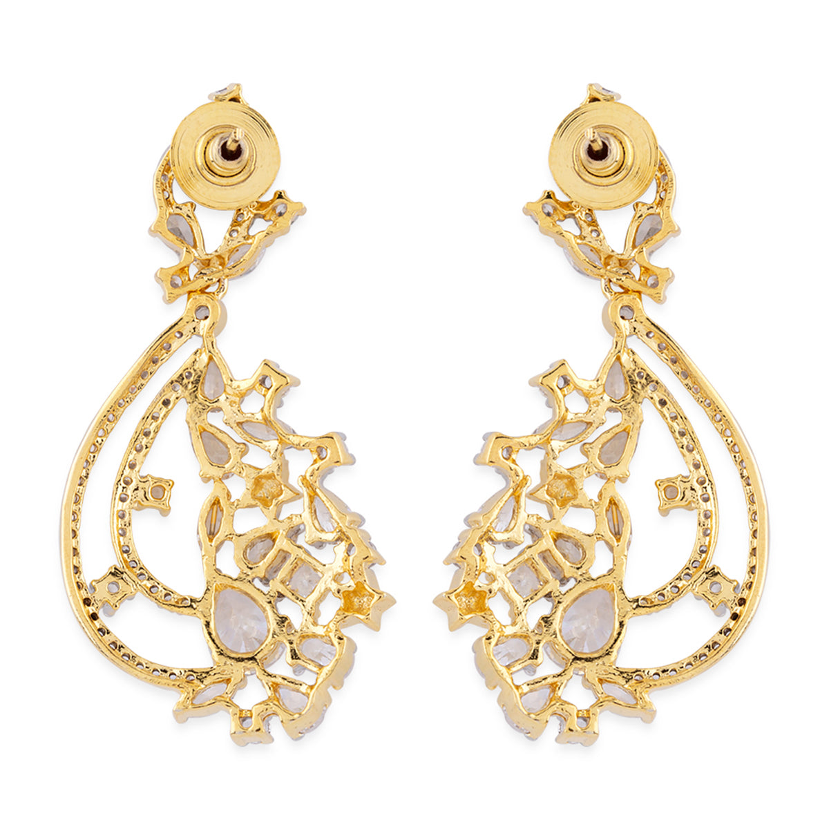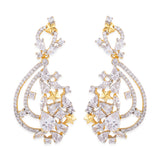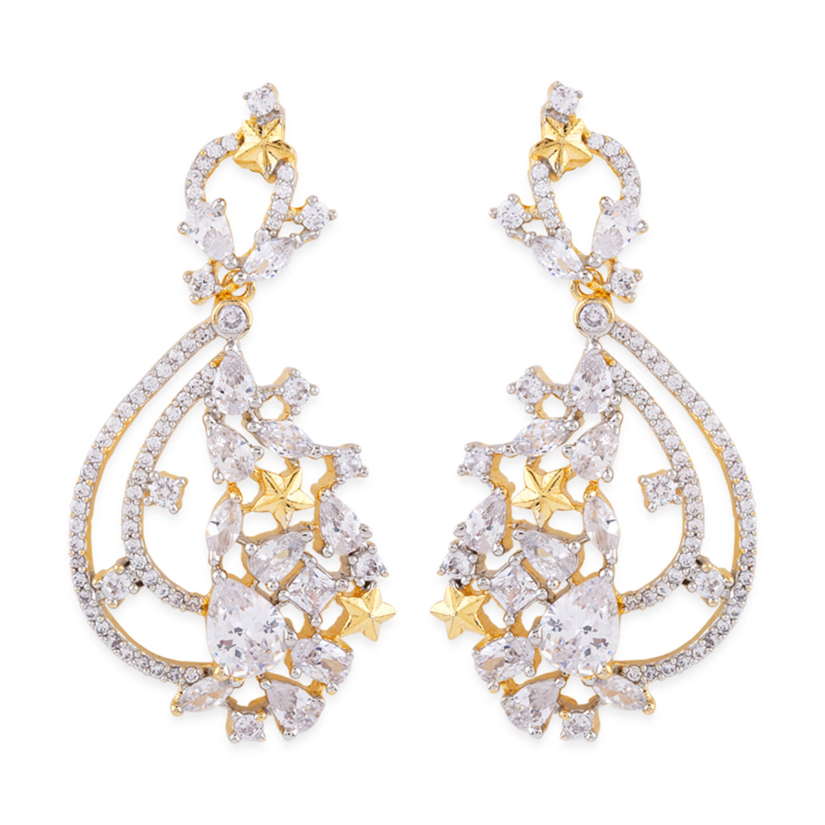 For a classy look, you can ditch your heavy necklace and wear just these earrings. These earrings feature American Diamond sparkling stones for a nice shine and are made out of brass with a dual tone finish. They are best adorned with evening gowns, floor length Anarkalis, and even long Kurtis.