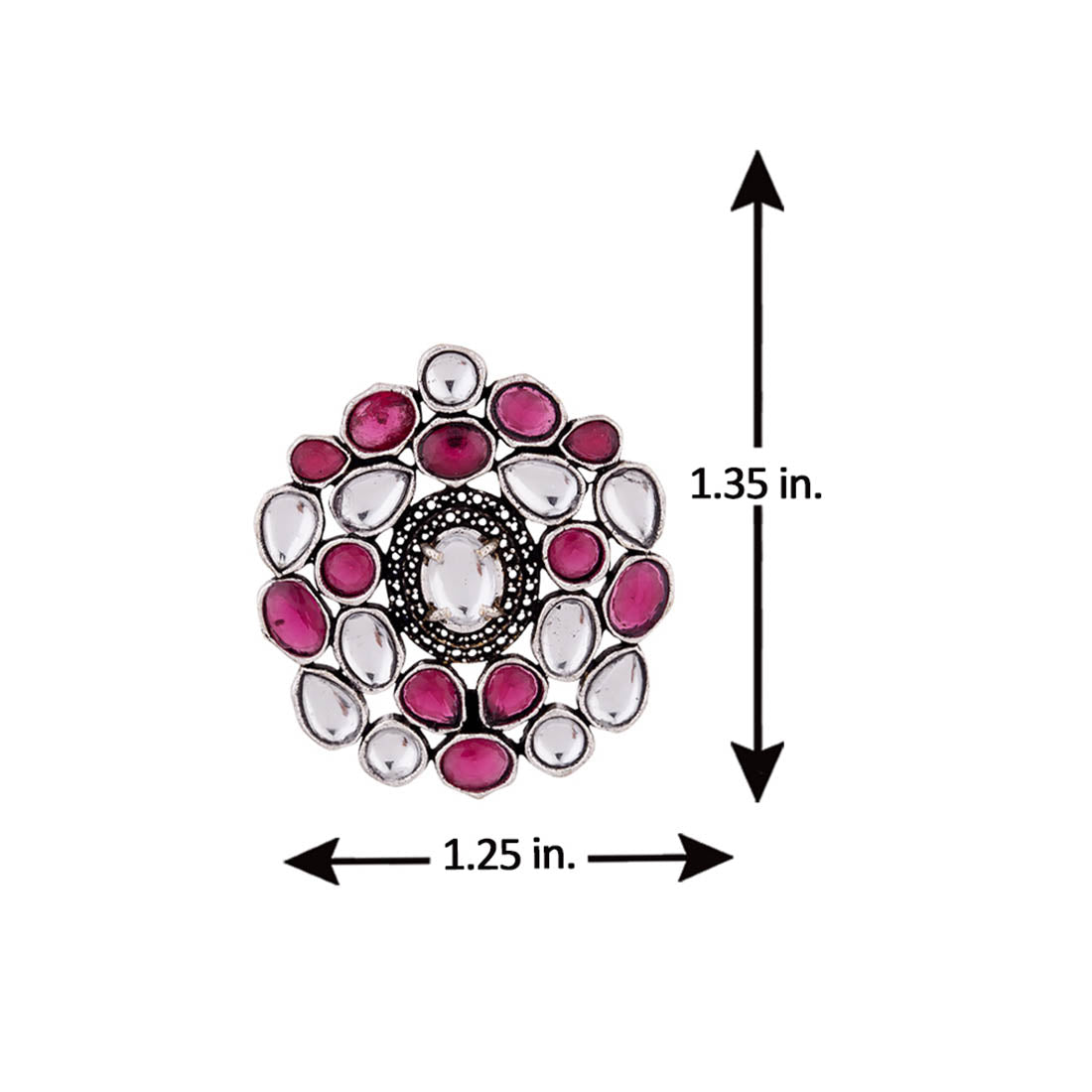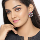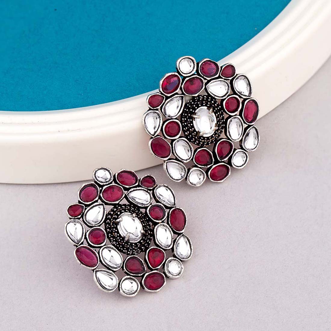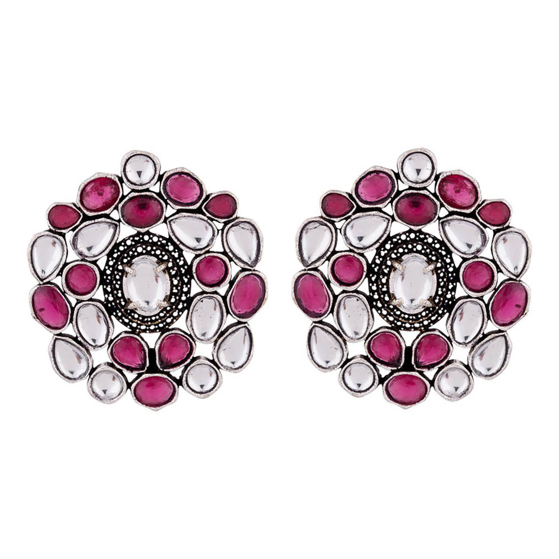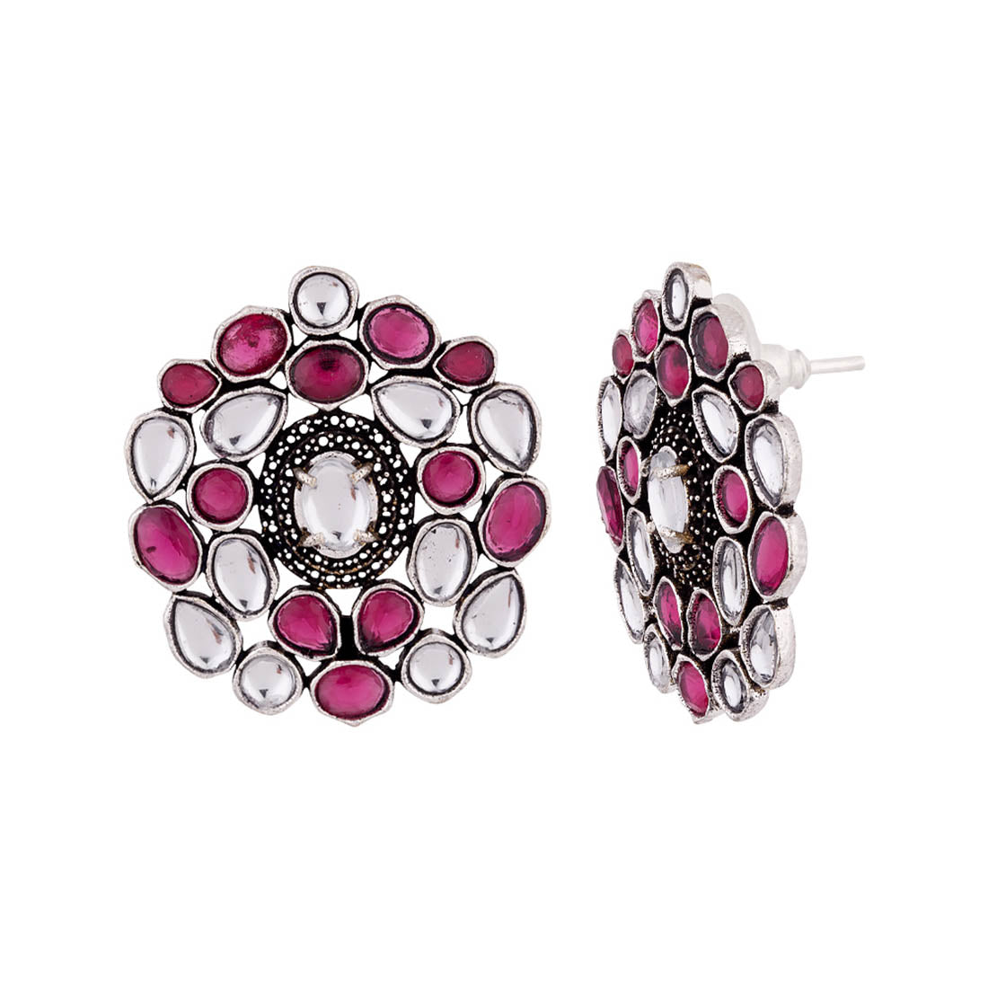 Stud earrings fashioned into a floral motif. Made from brass and oxidised silver plated. Embellished with faux gems. Good for formal looks.
