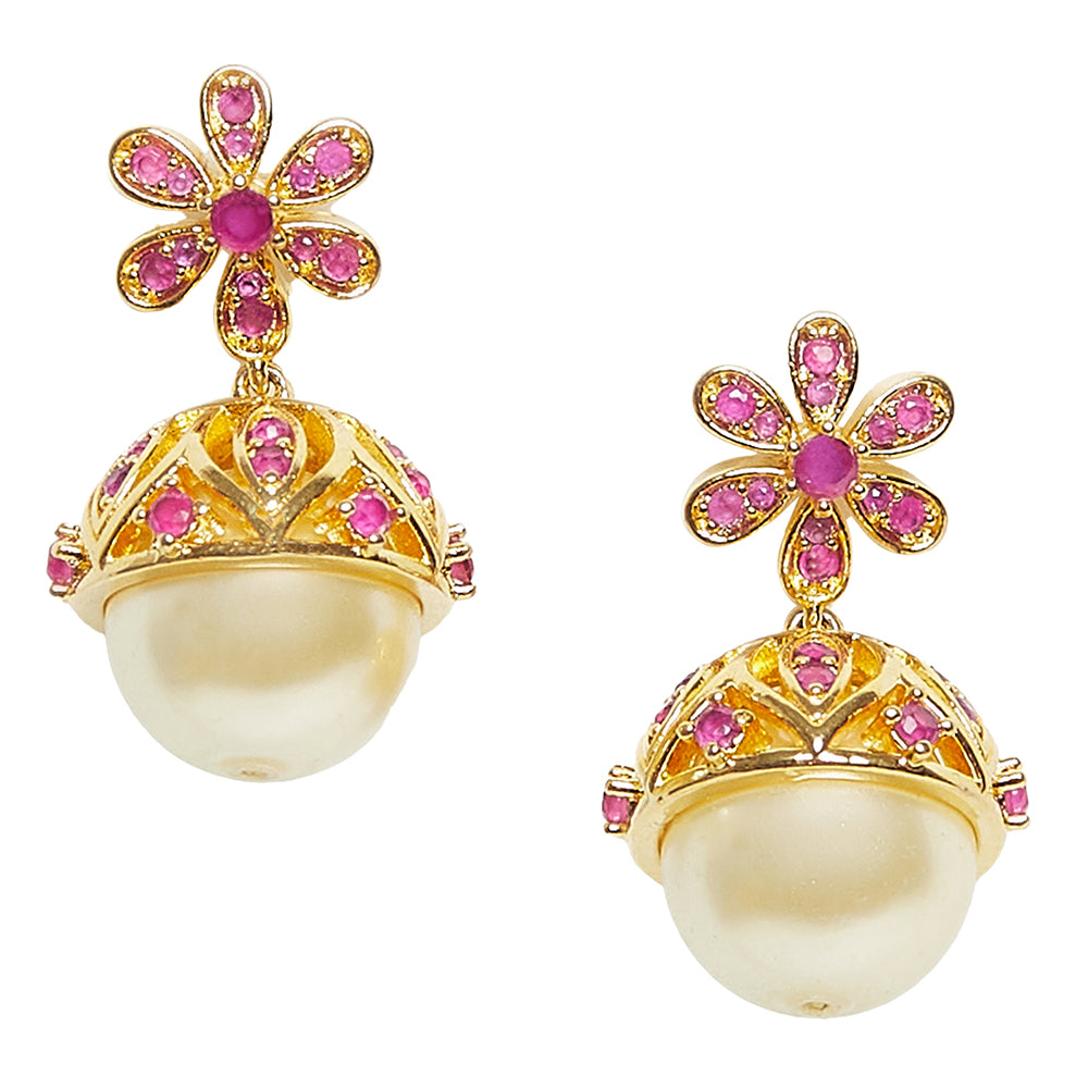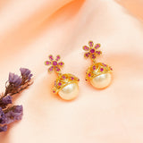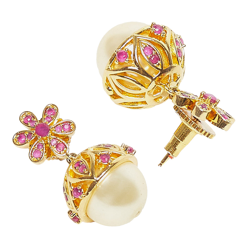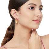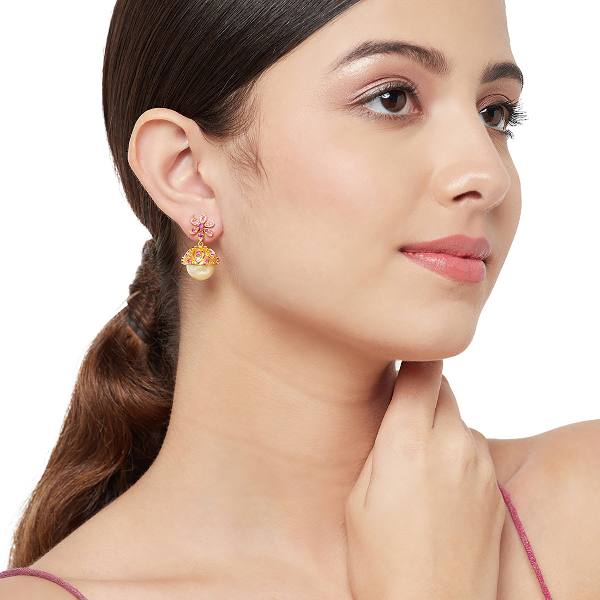 Adorn your ears with these splendid earrings that have been crafted into a super gorgeous, traditional design that is reminiscent of vintage jewelry pieces. Carved from the best quality brass and embellished with intricate, flawless patterns, these earrings have been studded with sparkly stones and given a brilliant yellow gold plating. Pearl droppings add to the grace of these beauties, which will compliment all your favourite ethnic and fusion outfits.