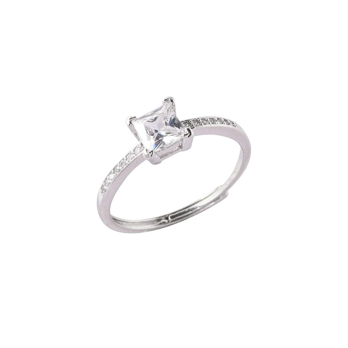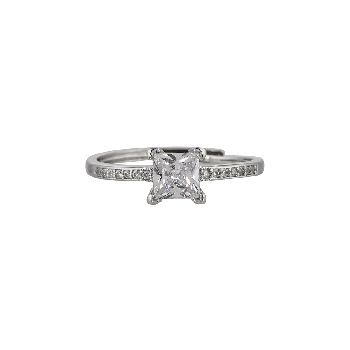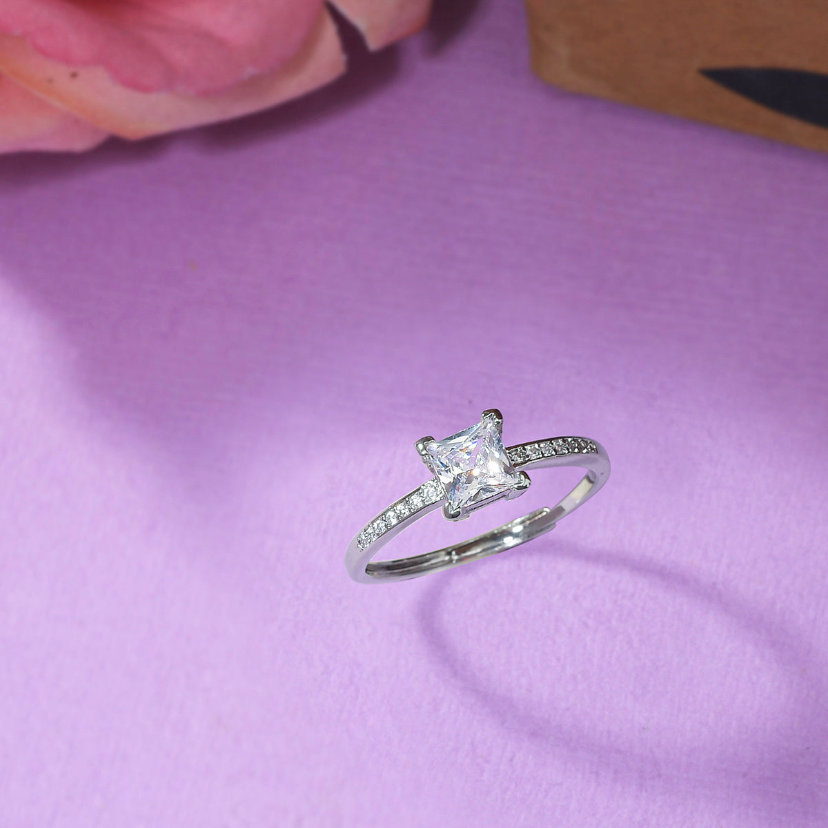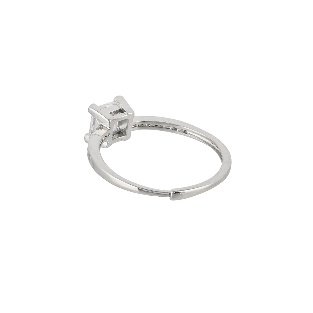 Silver plated finger ring for women, fashioned out of brass. Embellished with a princess cut zircon gemstone, the ring promises to be a comfortable wear at all times. Wear with just about everything.
