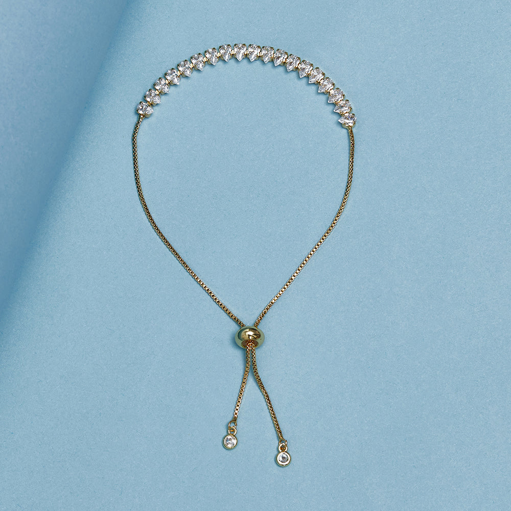 Gold plated chain bracelet, fashioned out of brass and embellished with cubic zirconia gemstones in a classic Princess cut. The slip-on bracelet can be paired with a wide variety of looks and outfits, and it promises to be a comfortable wear at all times.