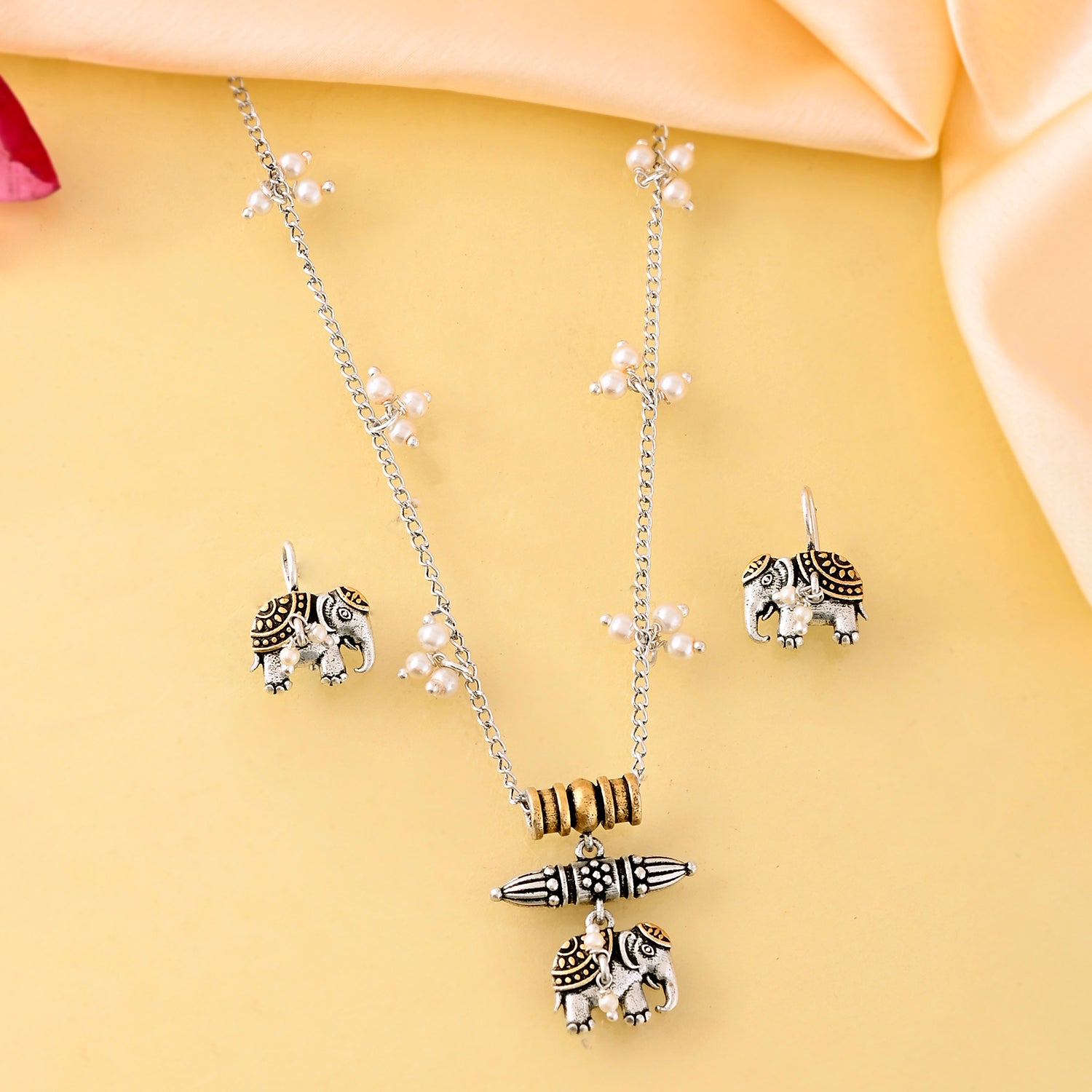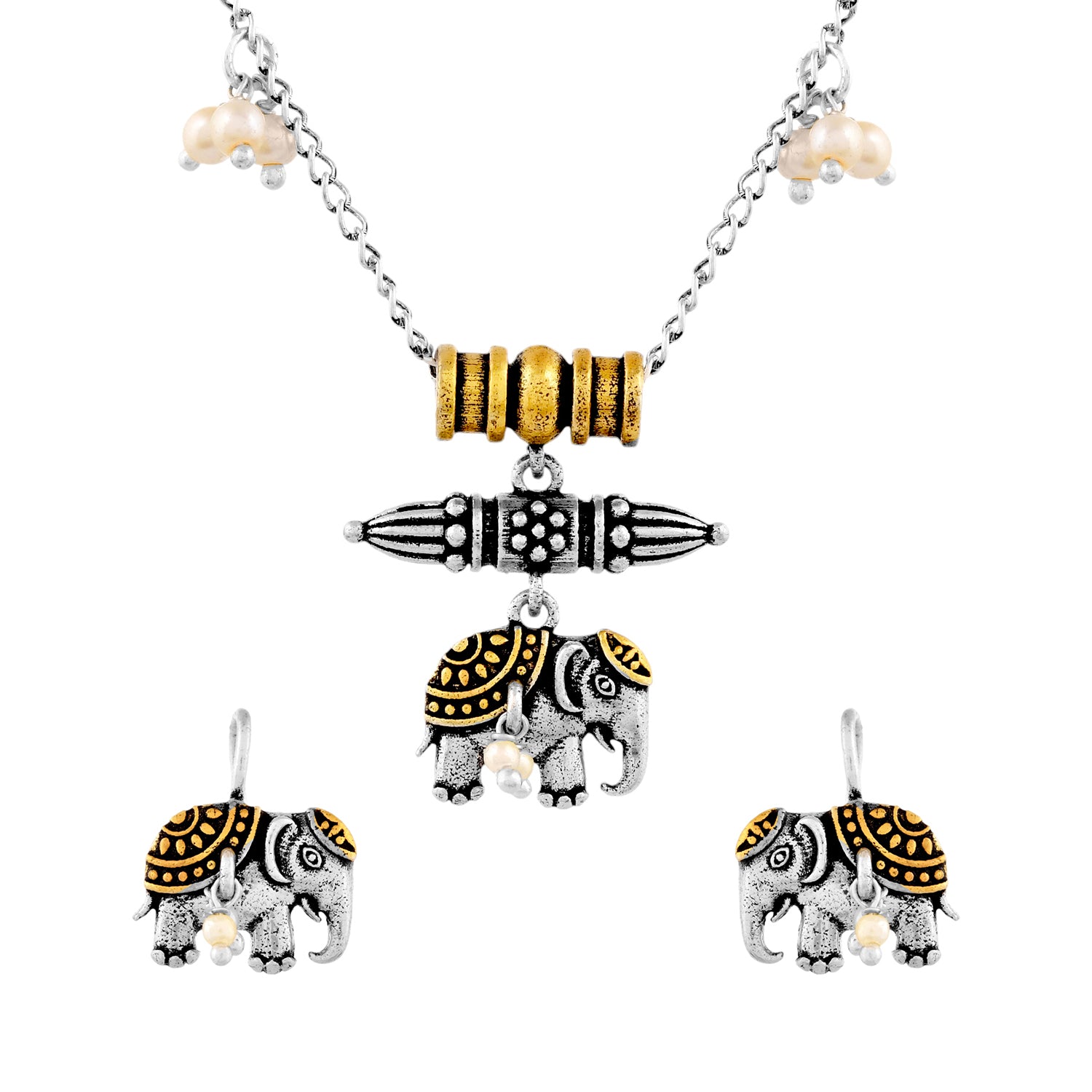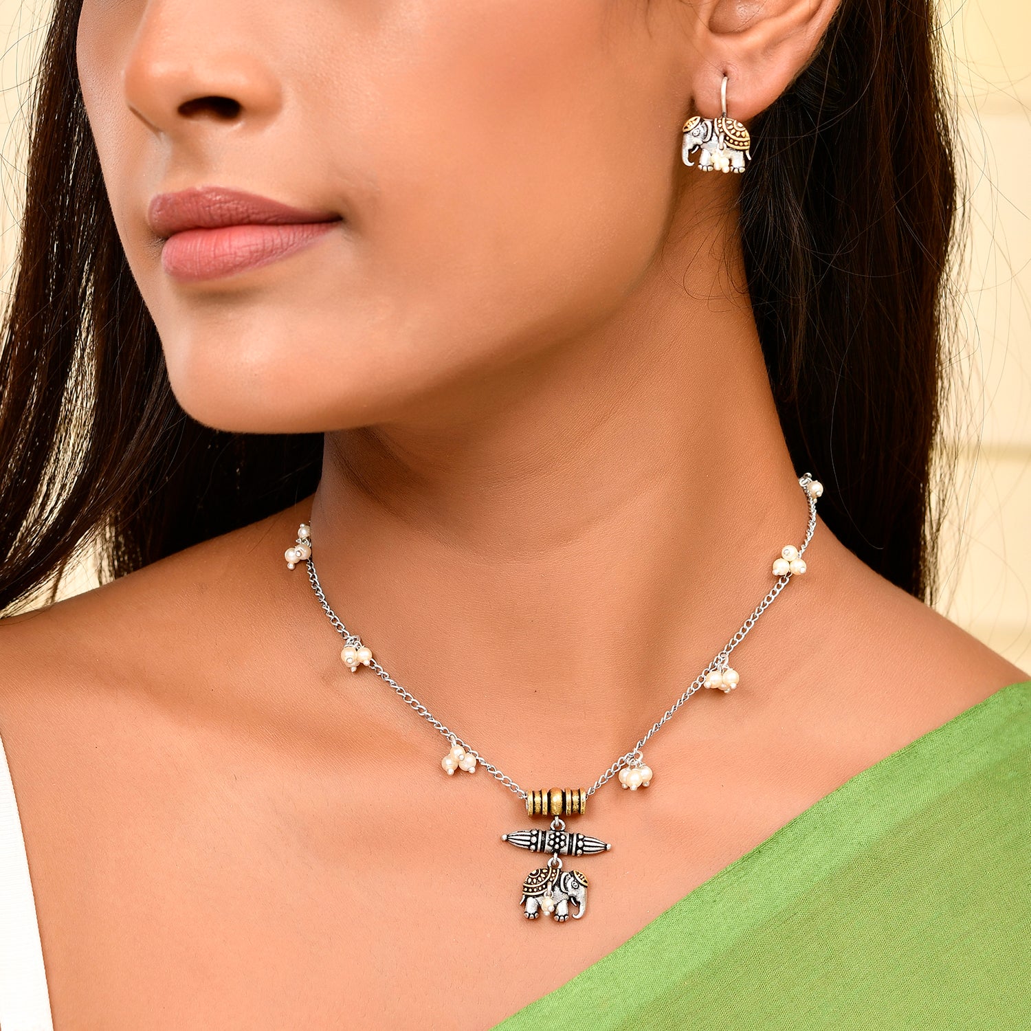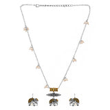 Celebrate your heritage with this exquisite Oxidised Necklace Set for Women, featuring a timeless elephant motif that symbolizes strength and wisdom in Indian culture. This set includes a beautifully crafted necklace and matching earrings, both adorned with intricate designs that reflect the rich traditions of Indian textiles.The necklace and earrings showcase a luxurious blend of silver and gold mixed plating, giving them an antique oxidized look that adds a touch of elegance to any outfit. Perfect for everyday wear, pooja, festivals, or special occasions, this set is a versatile addition to your jewelry collection. Whether you’re looking for the perfect Gift for Women – be it your sister, wife, girlfriend, mother, or friend – or treating yourself to something meaningful for Rakshabandhan, Diwali, or any other celebration, this Necklace Set is more than just jewelry; it’s a piece of wearable heritage.