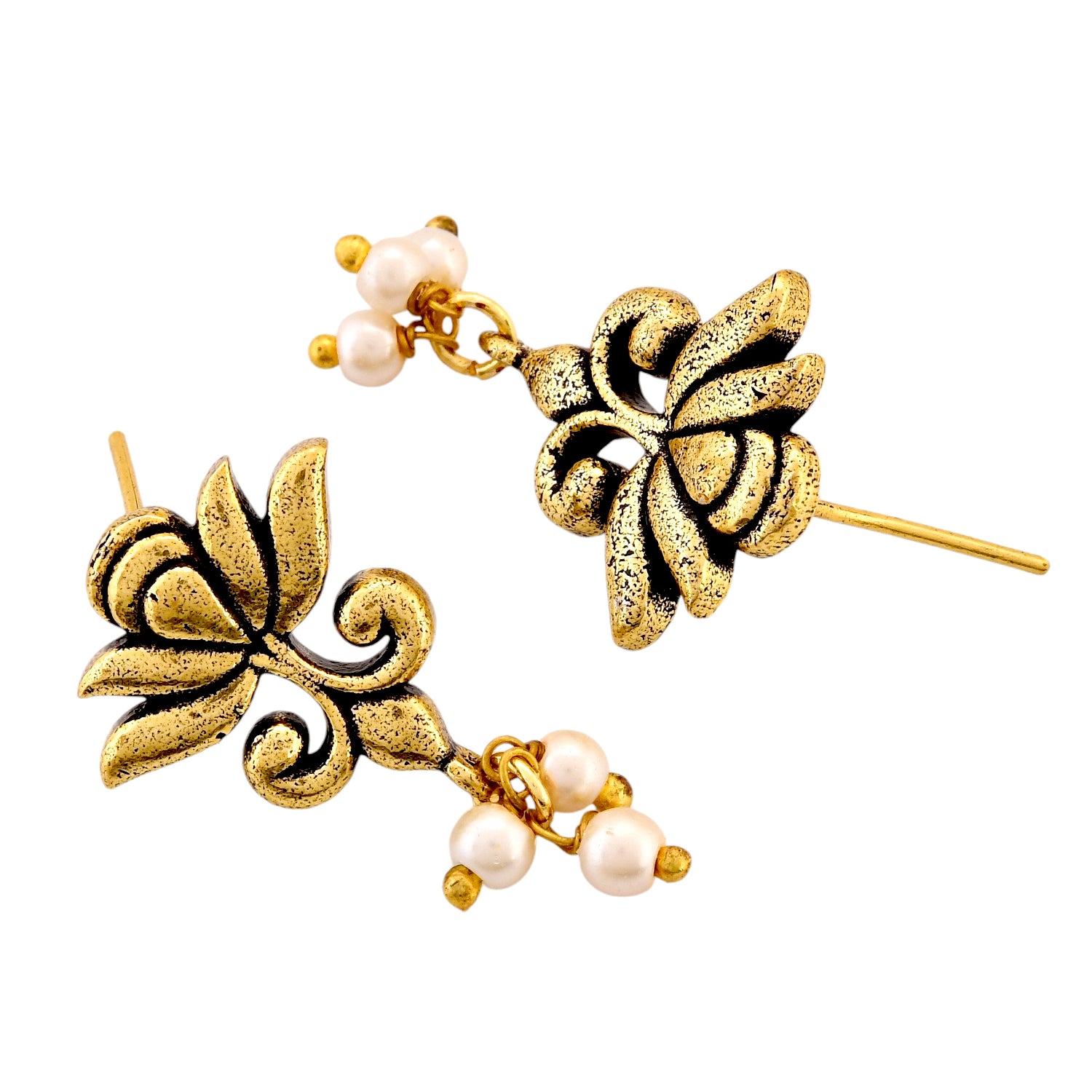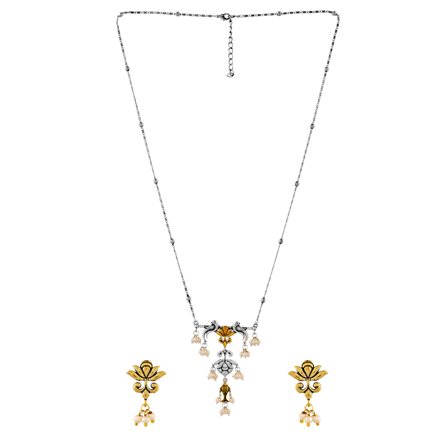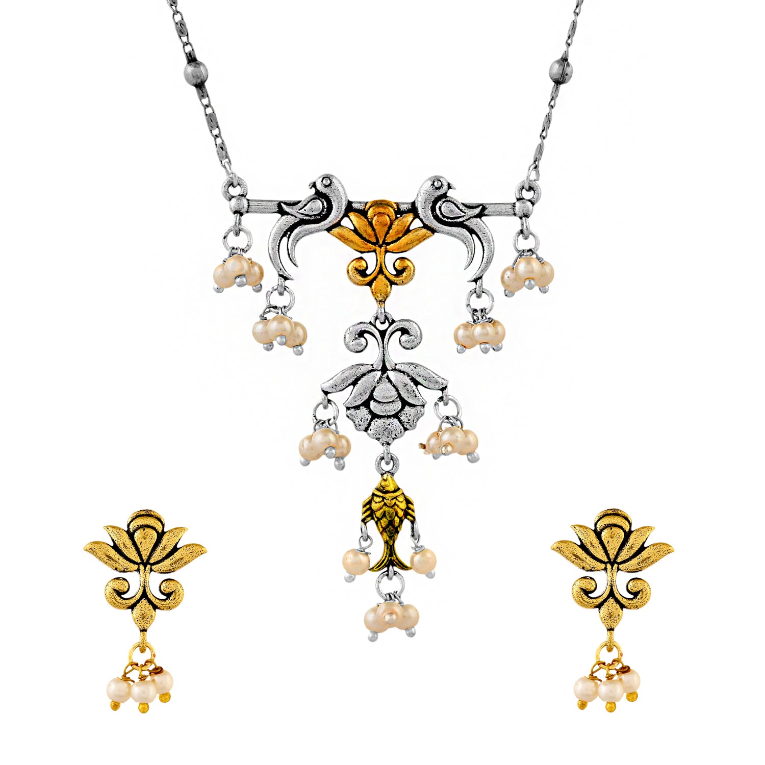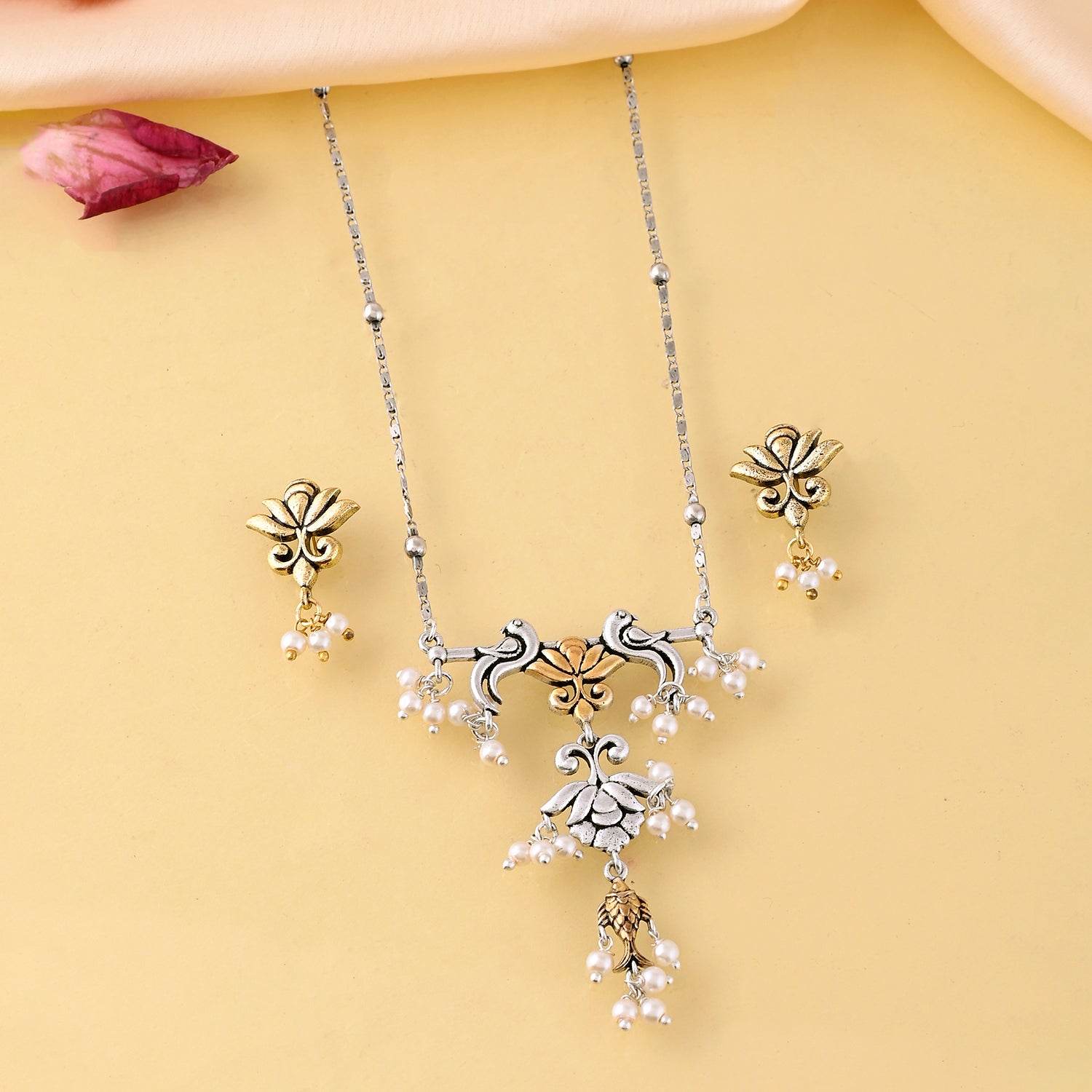 Embrace your roots and wear your heritage with pride with this exquisite Oxidised Necklace Set for Women. Crafted to perfection, this set features a stunning antique oxidized look that exudes timeless elegance. The necklace is adorned with sacred Indian motifs, including a charming parrot at the center, flanked by intricate Ficus leaves and delicate flowers in silver and gold mixed plating. The matching earrings echo the design, creating a harmonious set that’s perfect for pooja, everyday wear, or festivals. This Oxidised Necklace Set for Women is not just an accessory; it’s a statement of cultural pride and personal identity. It’s an ideal Gift for Women who cherish their heritage—be it your Sister, Wife, Girlfriend, Mother, or Friend—and makes a thoughtful present for occasions like Rakshabandhan (Rakhi), Diwali or as an Everyday Office wear piece.