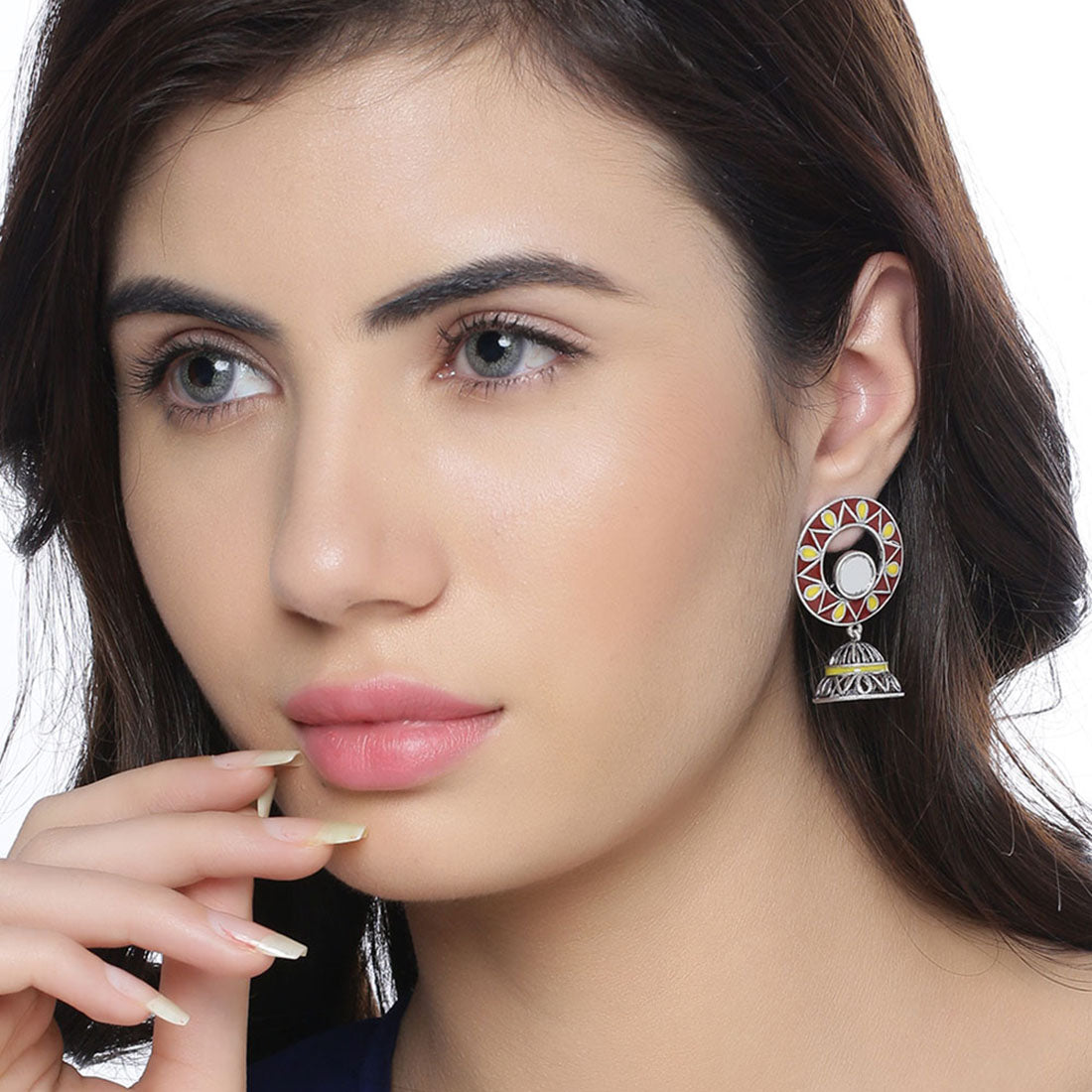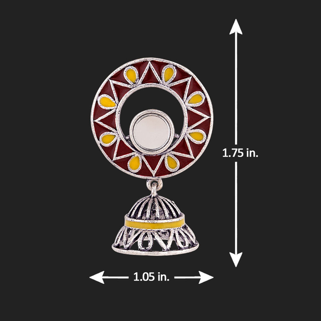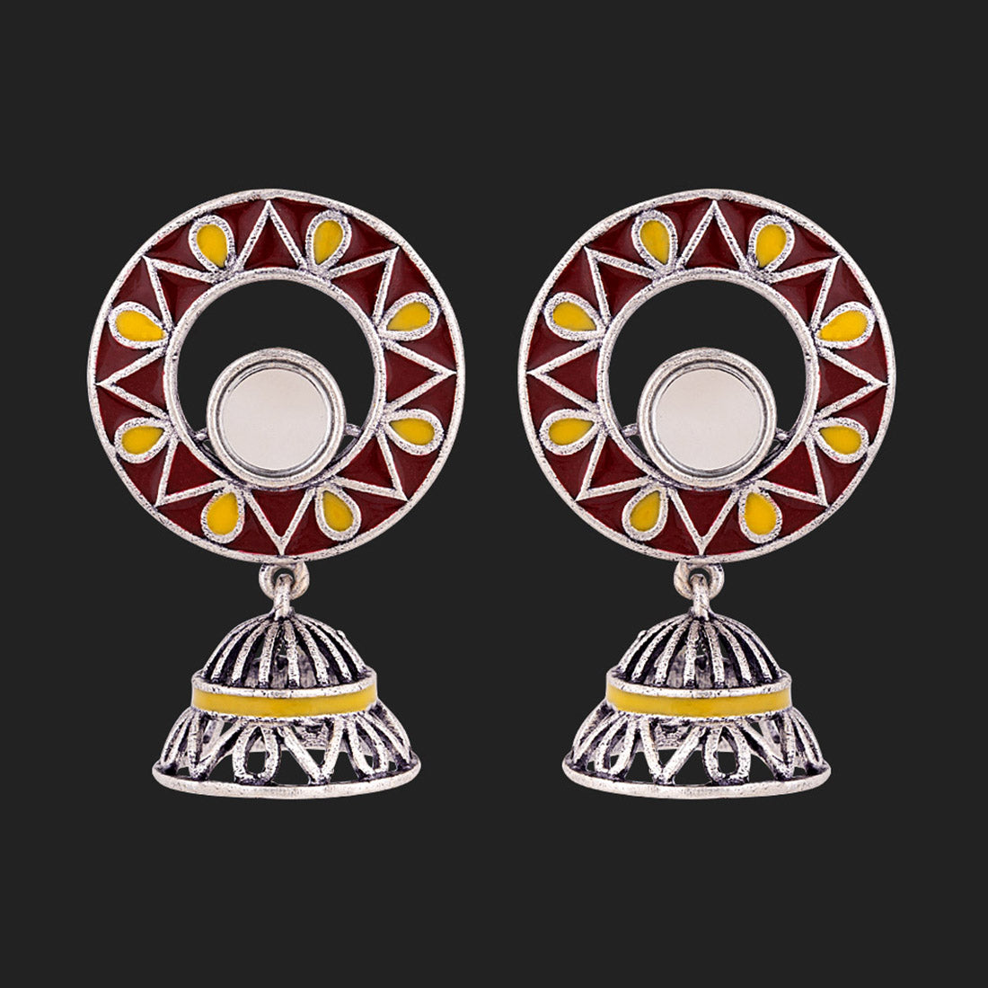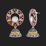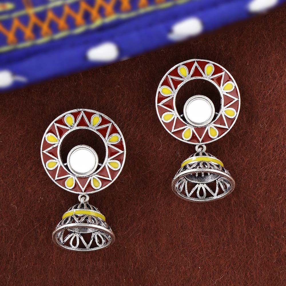 The artistic and graceful Rabaari embroidery has inspired these jhumka drop earrings, which have been crafted from brass. Enameled and mirror details embellished, the oxidized silver plated earrings are versatile and can be paired with just about everything.