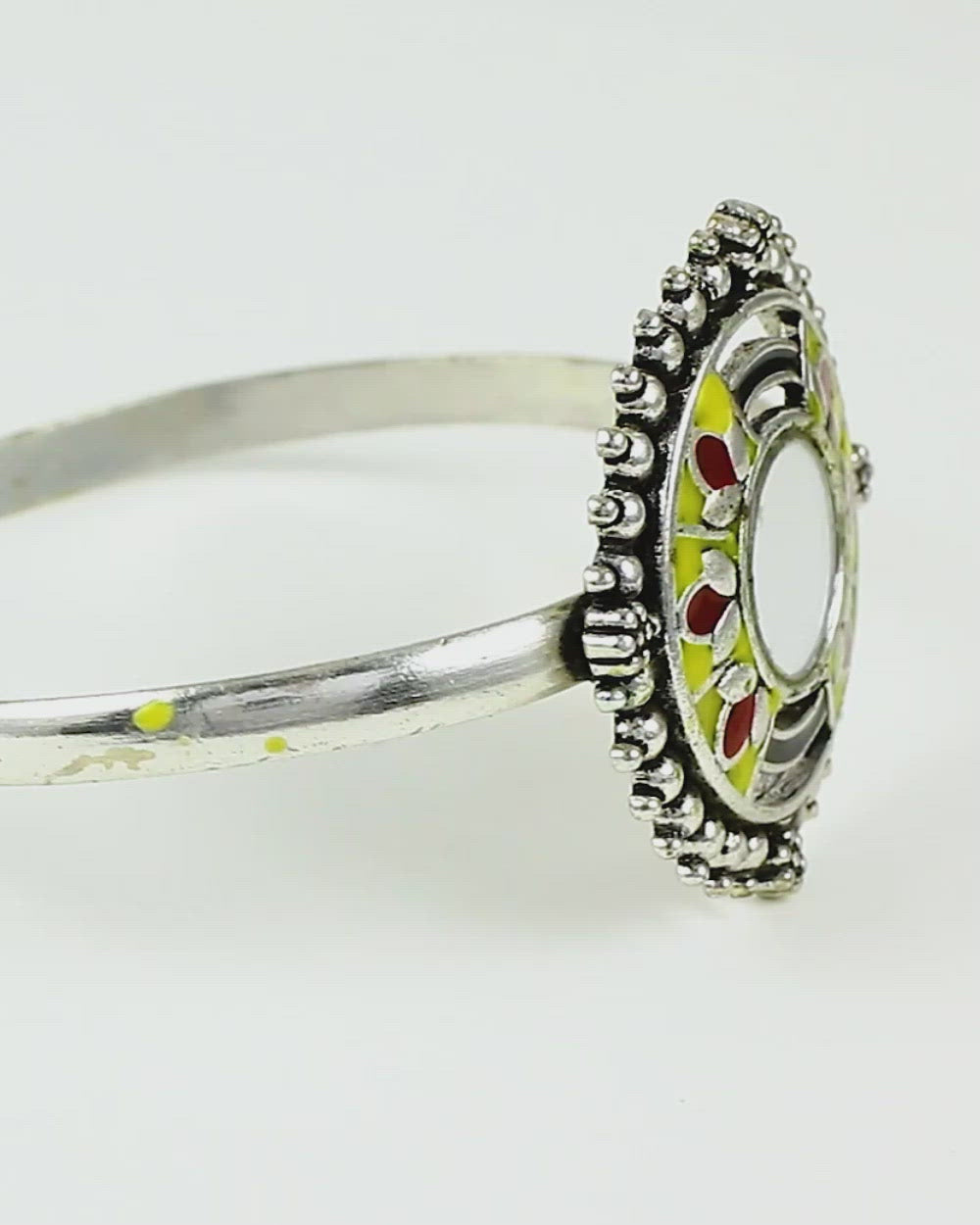 Ethnic style bracelet inspired by the artistic and mystical Rabaari embroidery. Made from brass and oxidized silver plated, the mirrored bracelet can be paired with Indian and Indo-Western looks of all kinds.