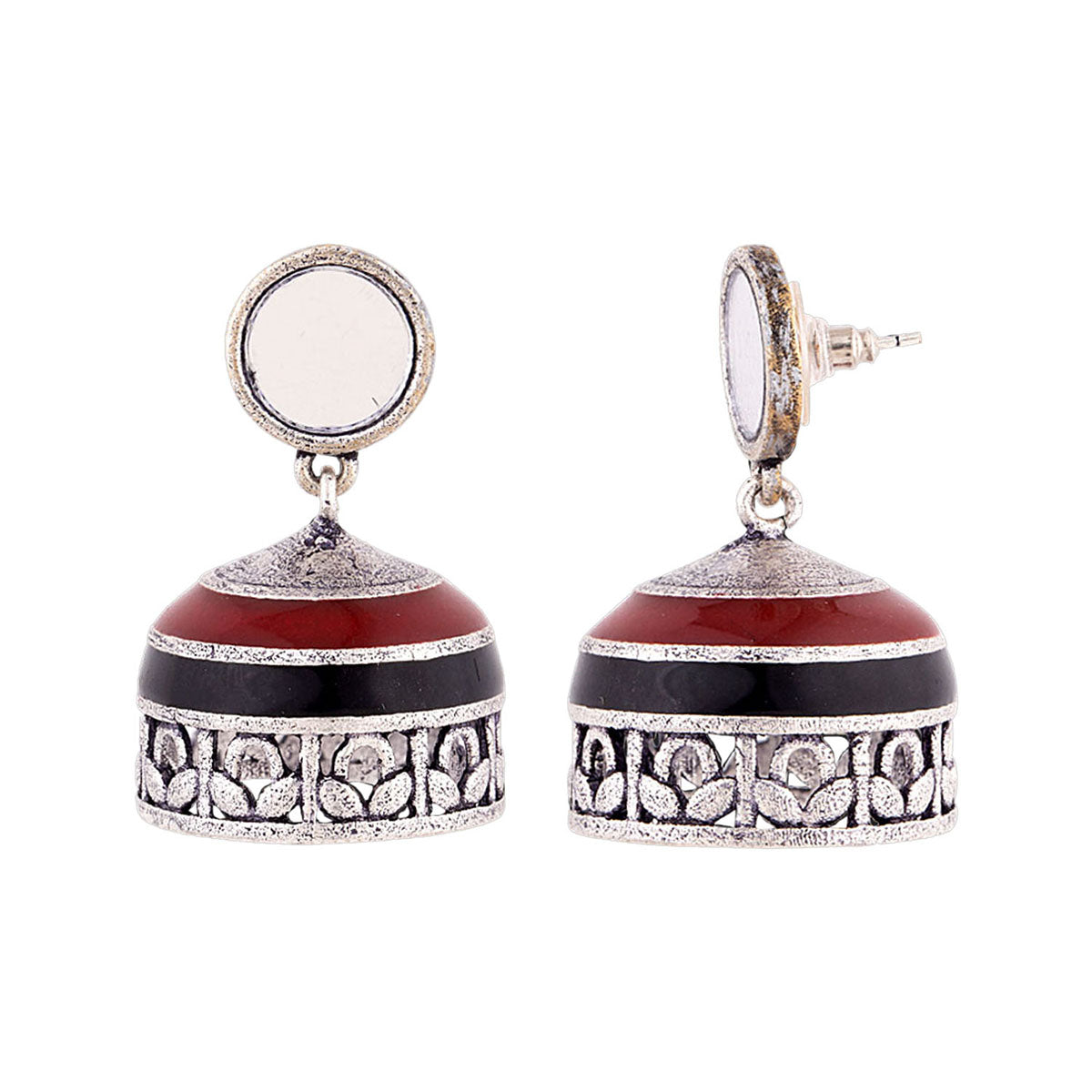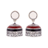 Round jhumka drop earrings, inspired by the classic Rabaari embroidery. Made from brass and oxidized silver plated, the pair has been embellished with mirror details and enameled. The earrings will look splendid when paired with a cotton saree.