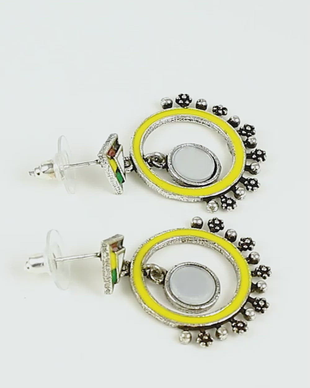 Drop earrings with triangles and circles motifs, inspired by the art of Rabaari embroidery. Made from brass and oxidized silver plated, the pair has been enameled and embellished with mirror details. Wear with a trendy cotton saree.