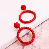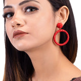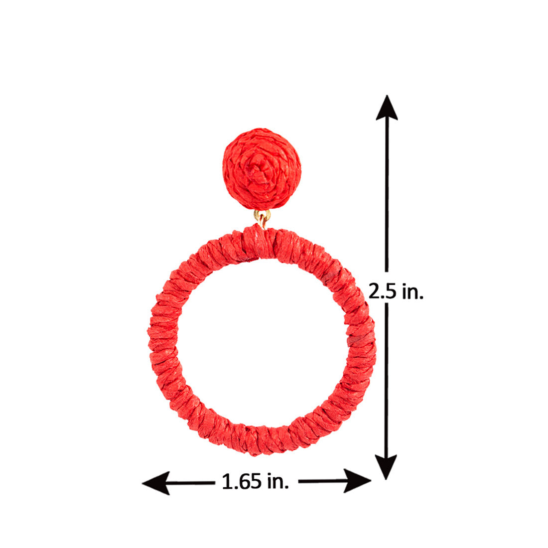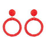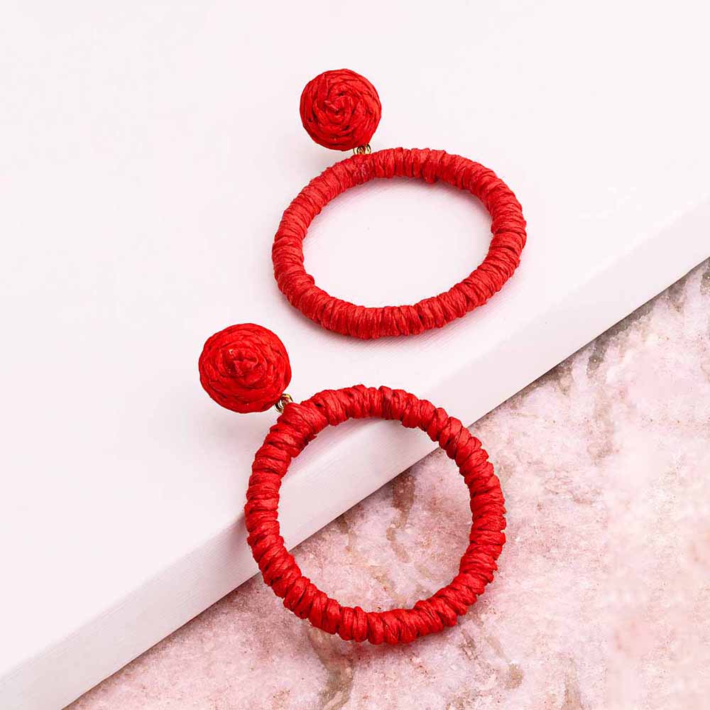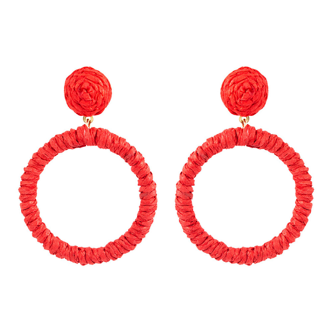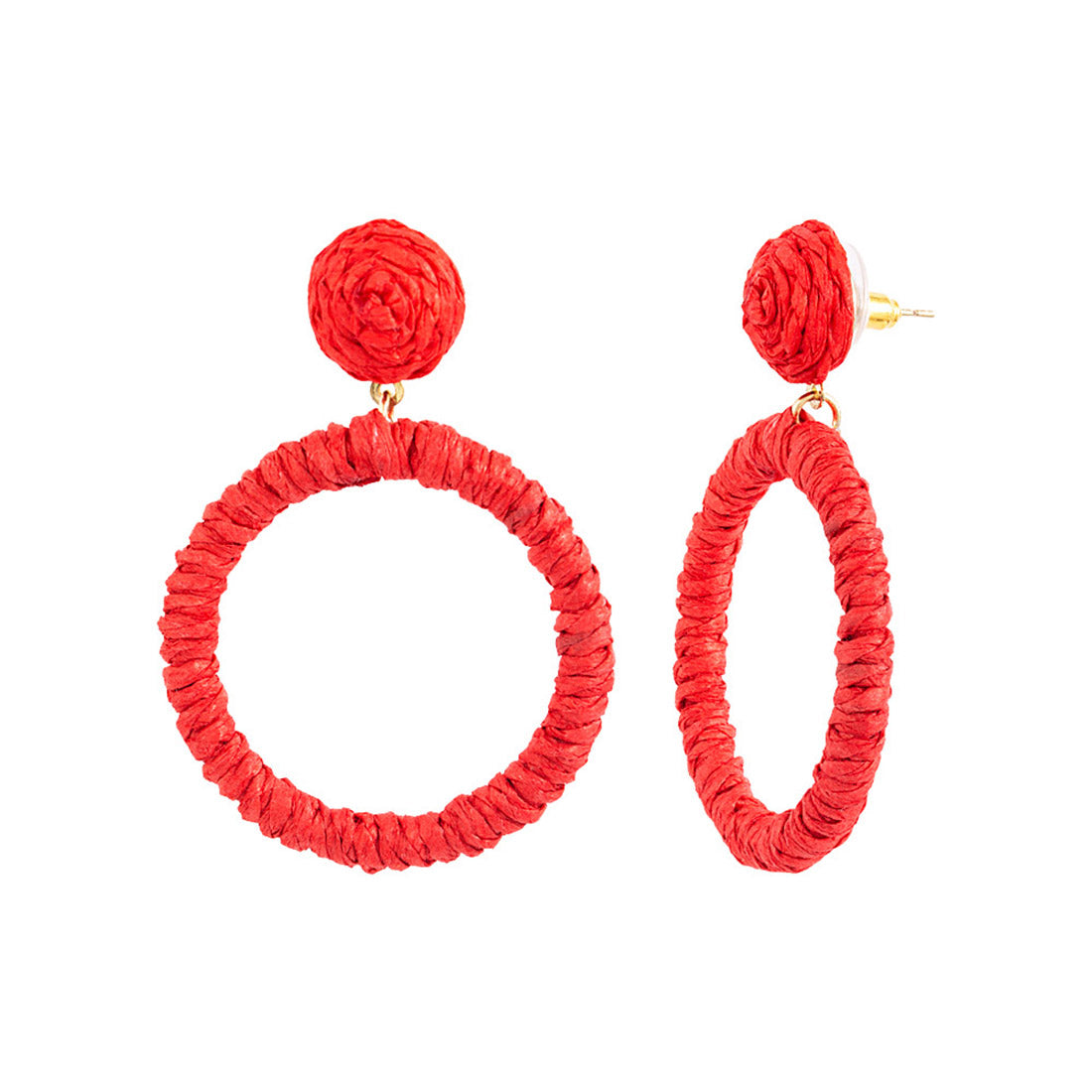 Red thread round earrings with yellow gold plating. Pair with a summer dress.