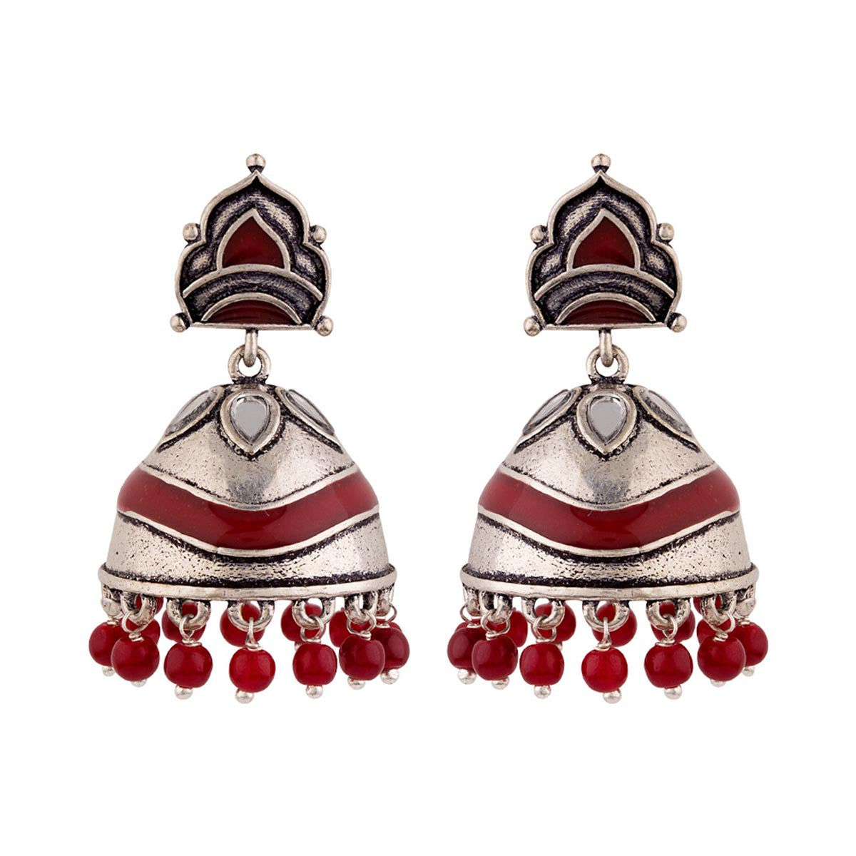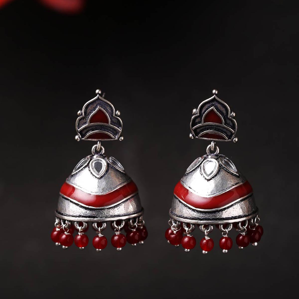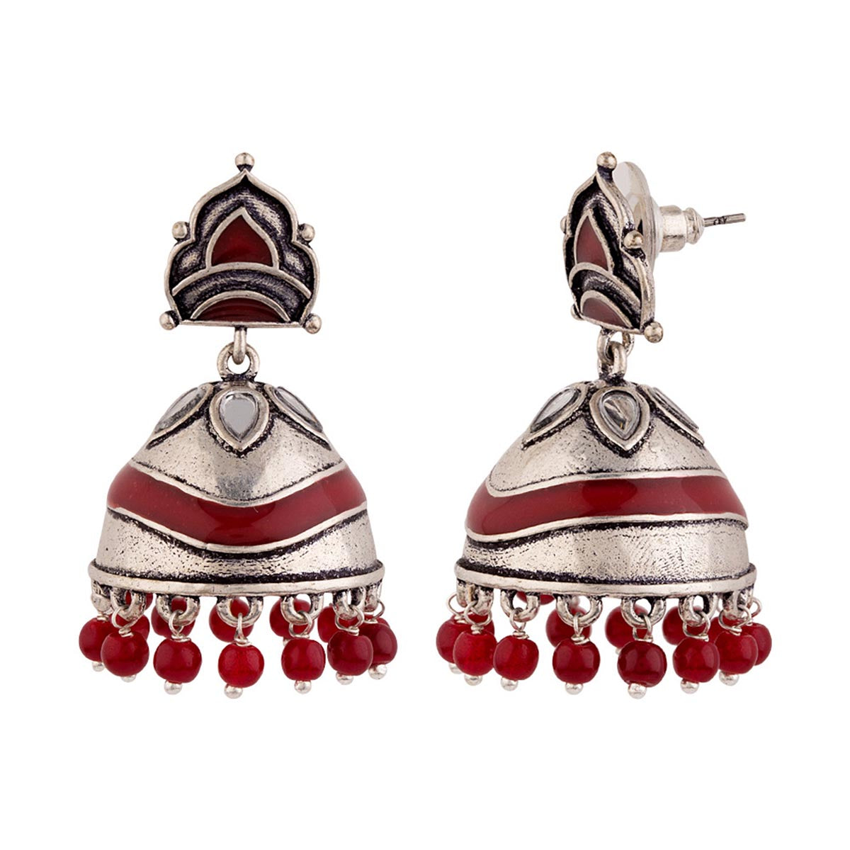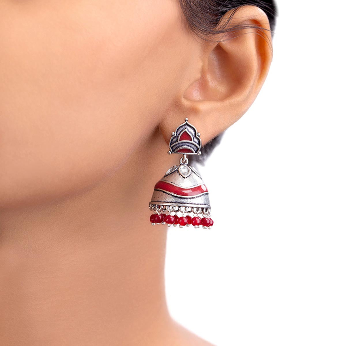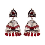 Jhumka earrings embellished with enamel and beads, made from brass and oxidized silver plated. Pair with ethnic attire.