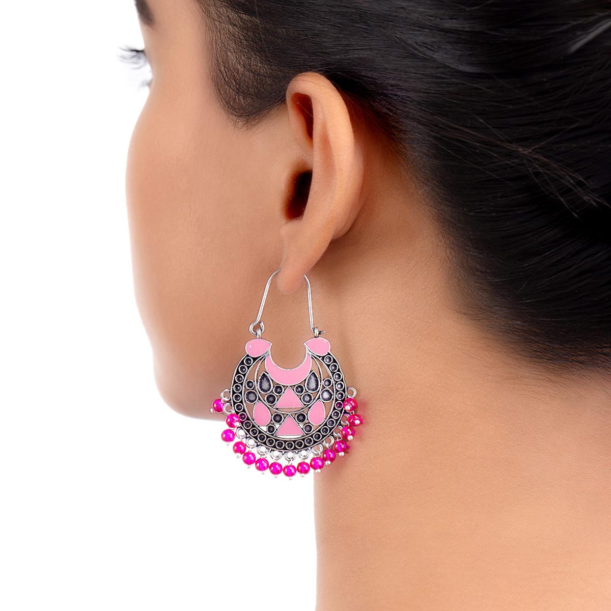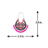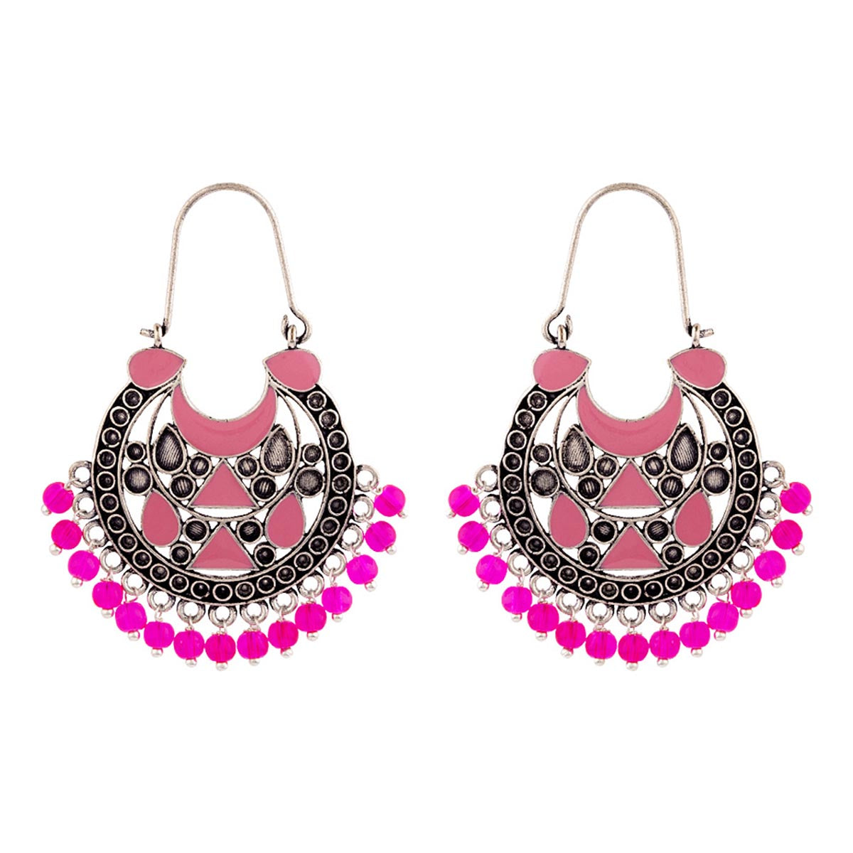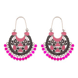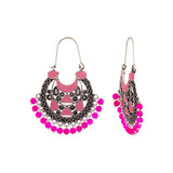 Ethnic style hoop earrings with oxidized silver plating. Fashioned out of brass. Pair with a casual kurta.