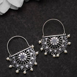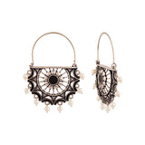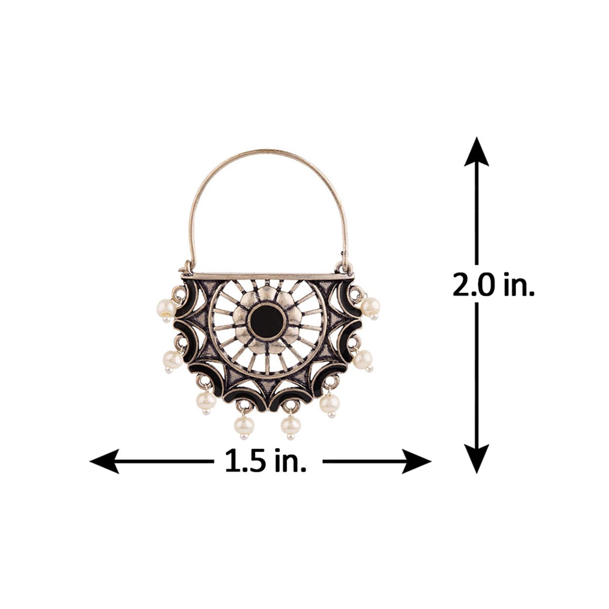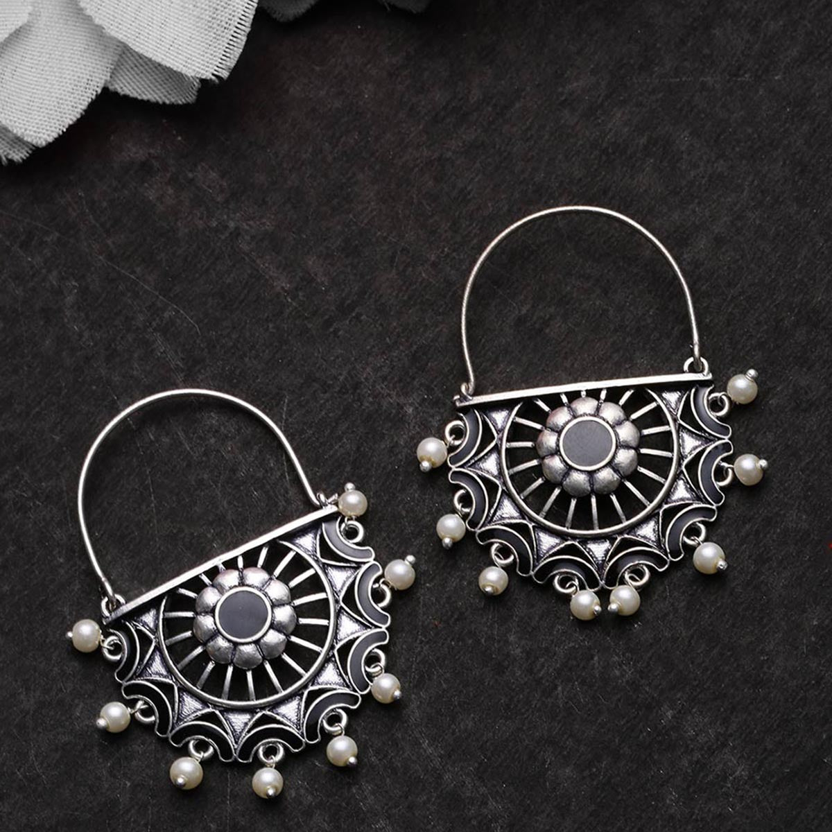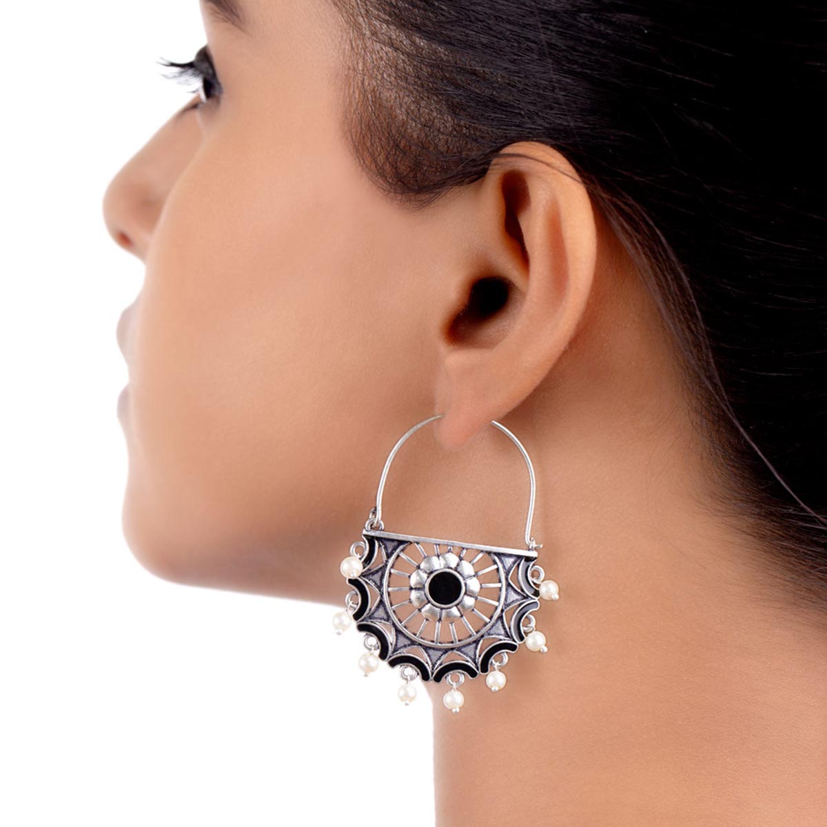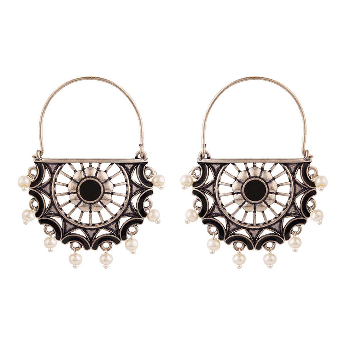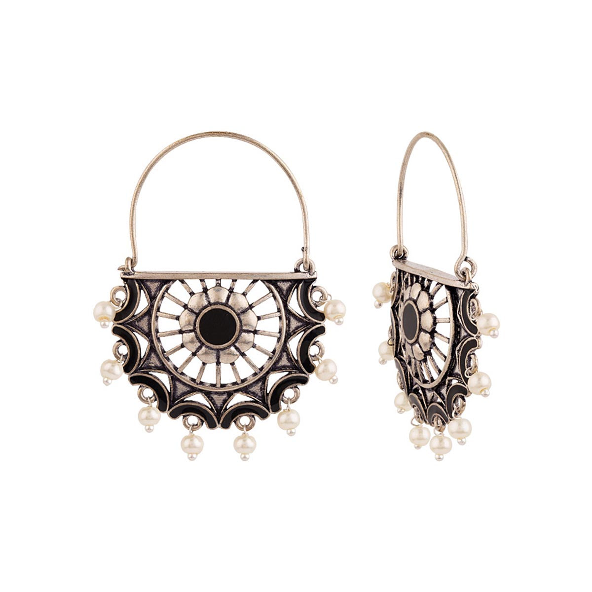 Faux pearls adorned brass earrings. Wear the oxidized silver plated pair with ethnic attire.
