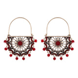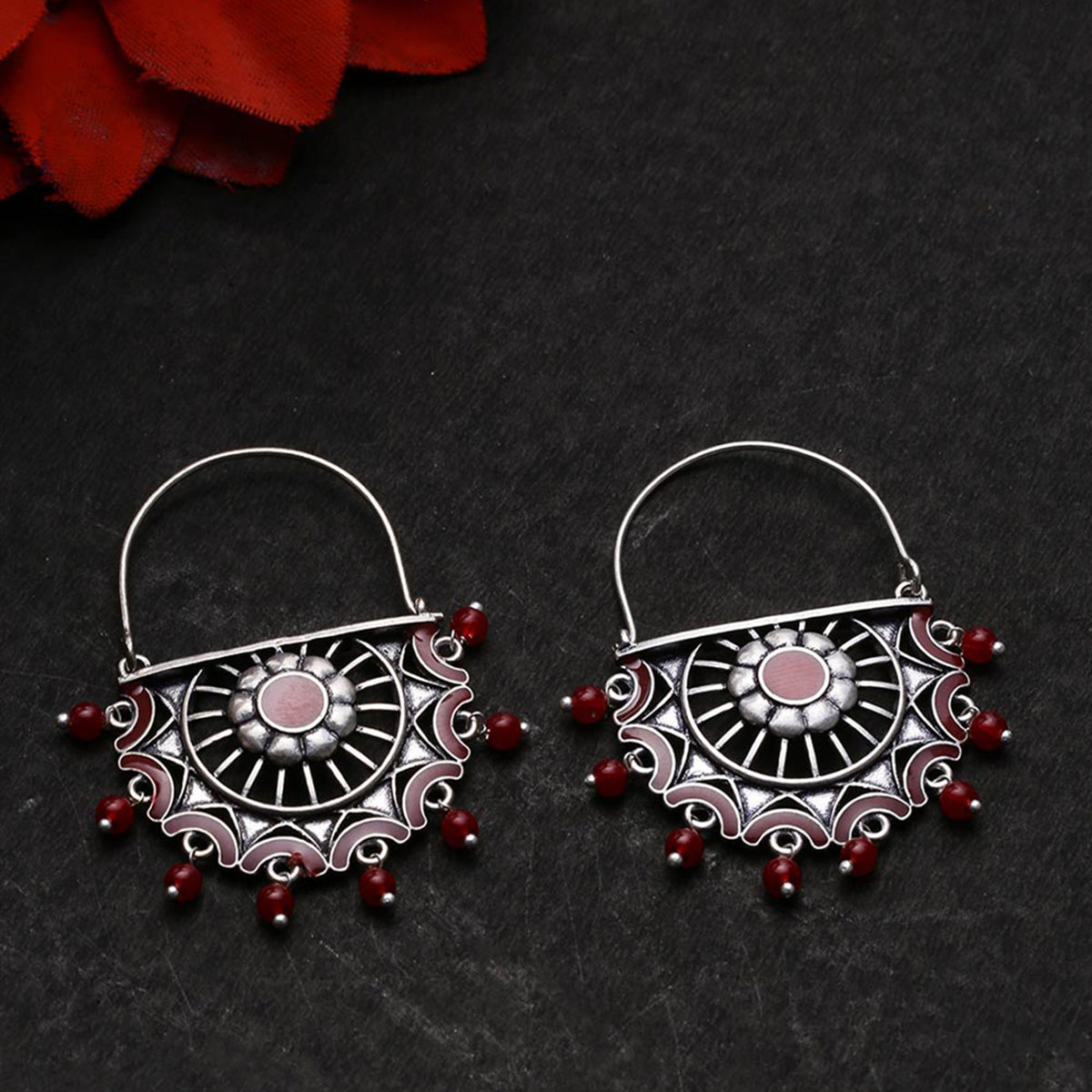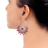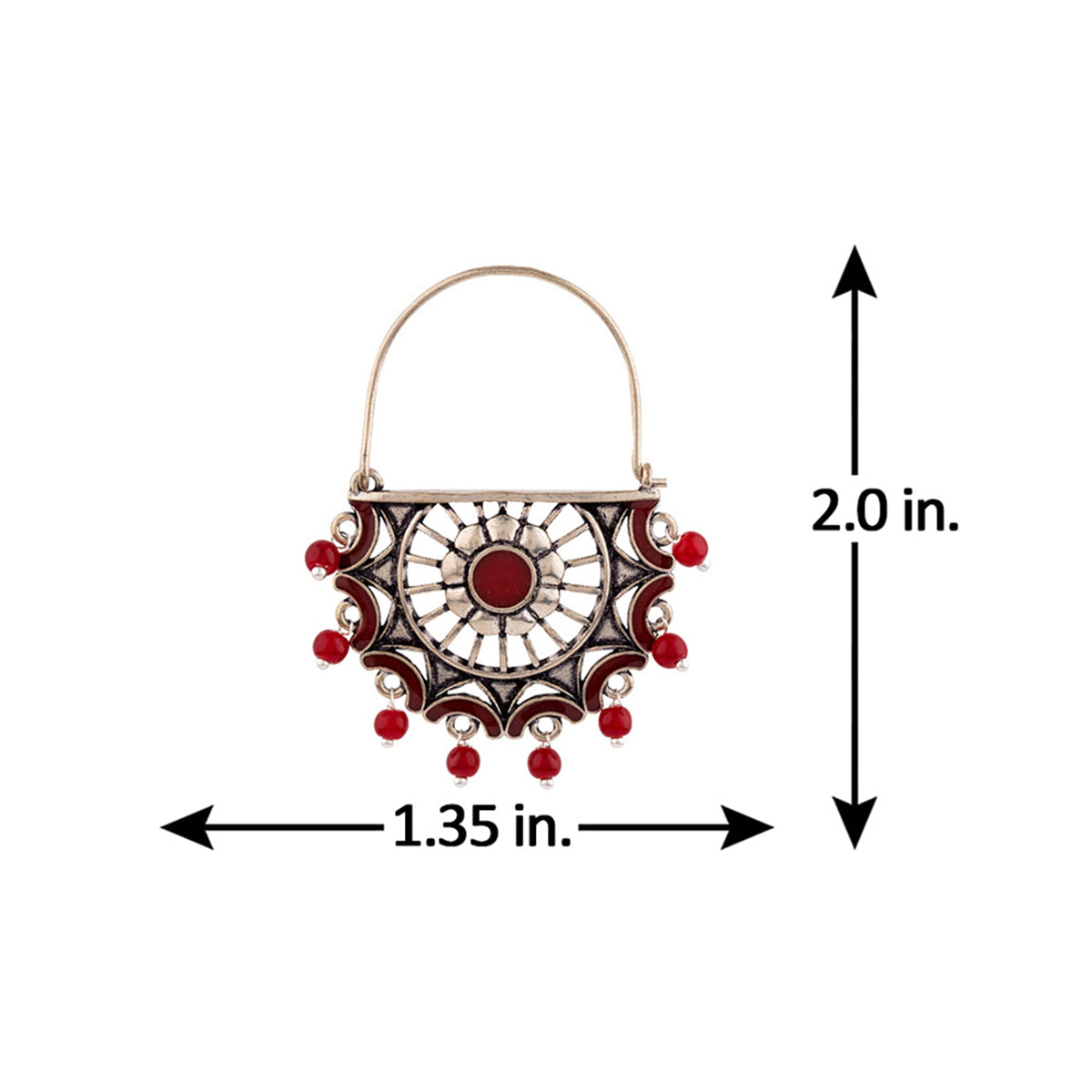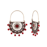 Filigree design brass earrings with red beads. Oxidized silver plated. Pair with a casual saree.