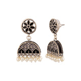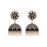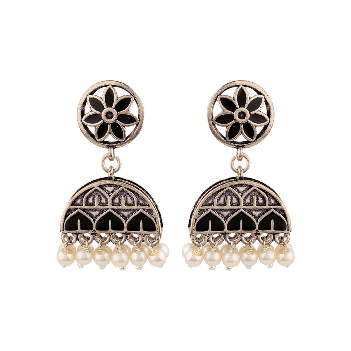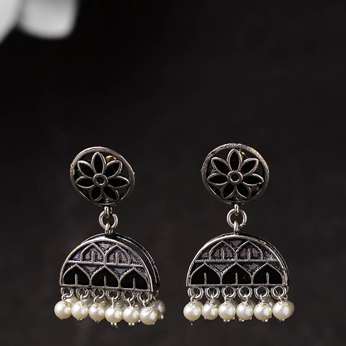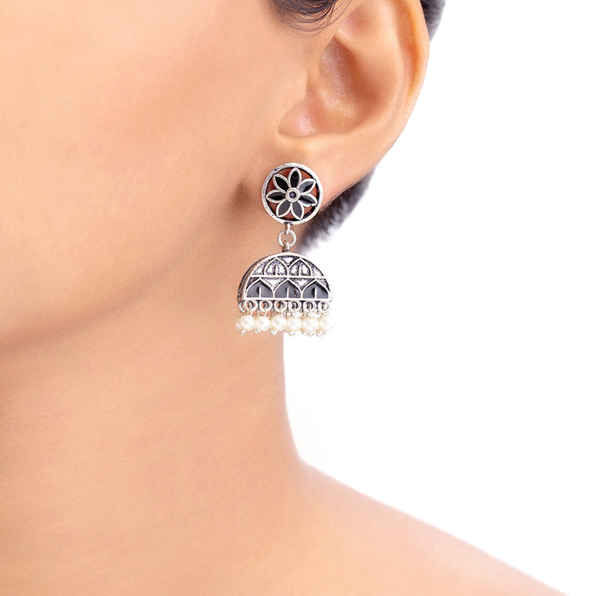 Floral motifs adorned earrings made from brass. Oxidized silver plated and adorned with faux pearls. Pair with ethnic looks.