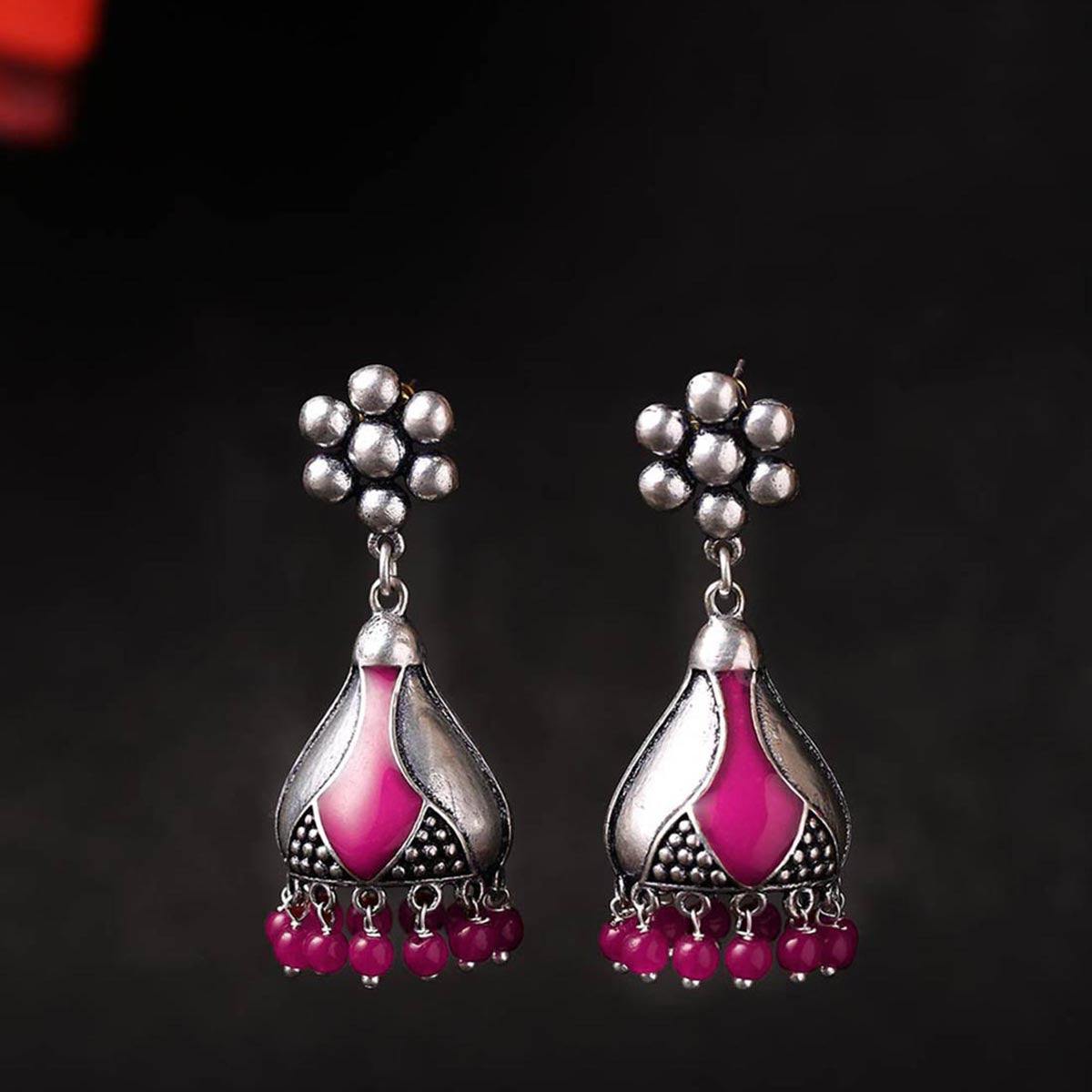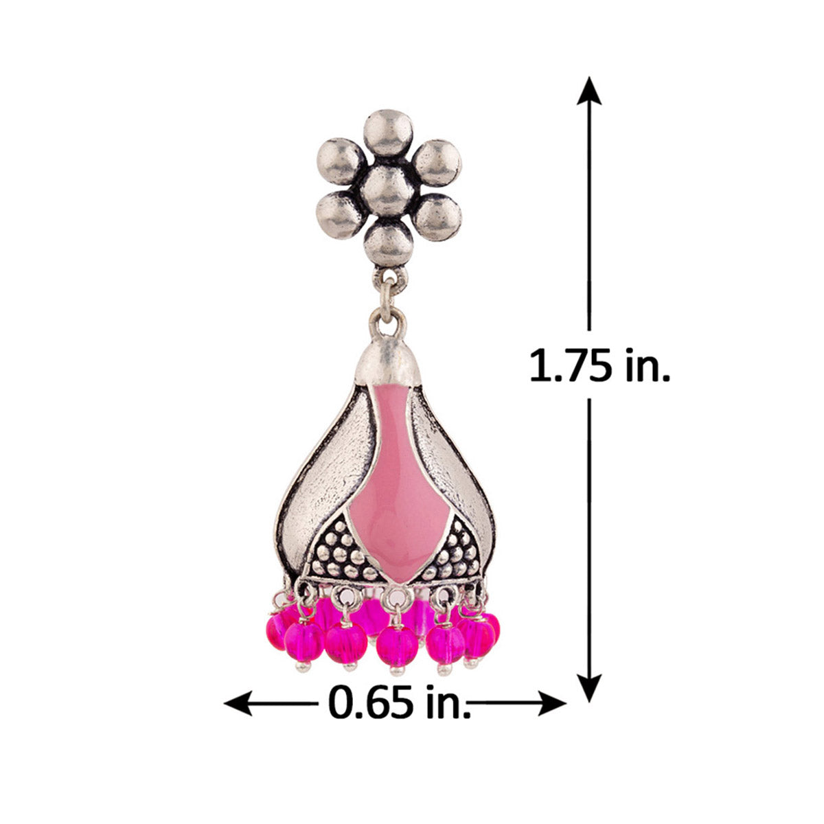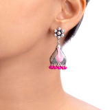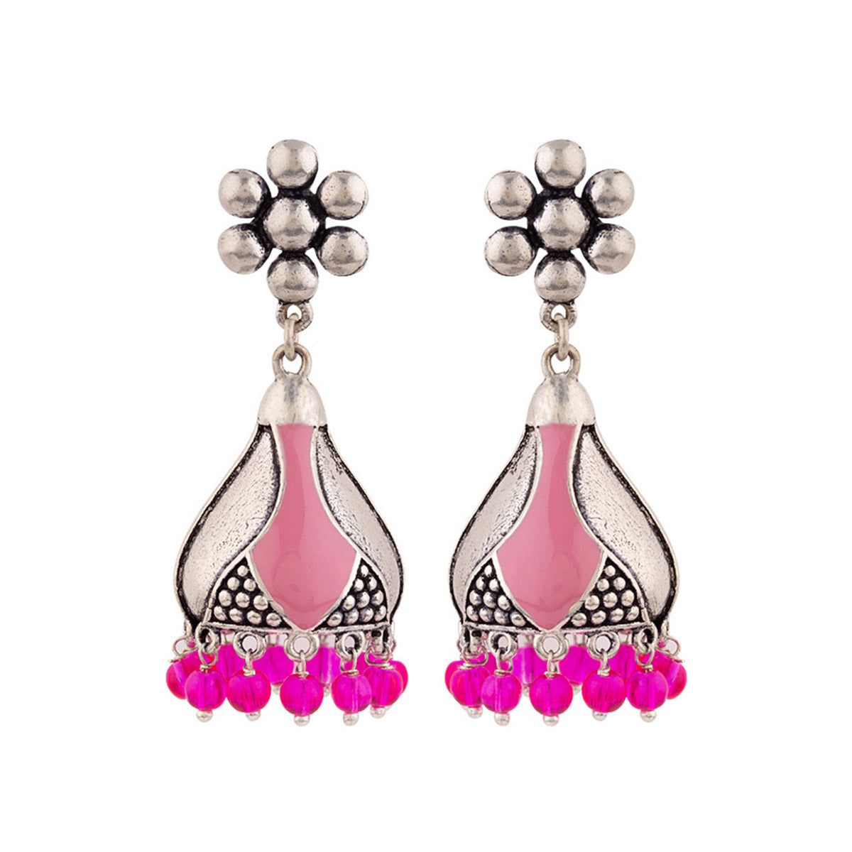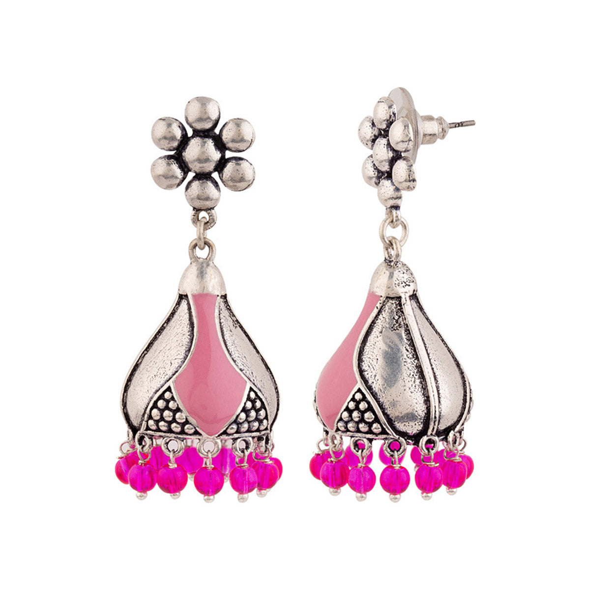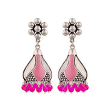 Floral motifs adorned jhumka earrings crafted from brass and embellished with pink beads. Oxidized silver plated, lightweight and comfortable.