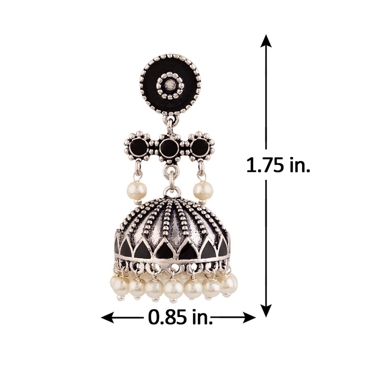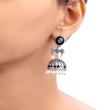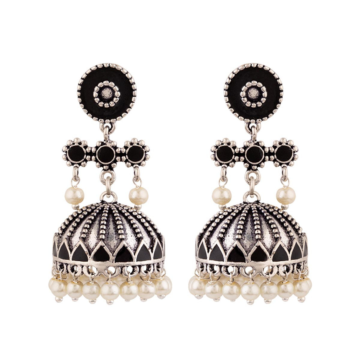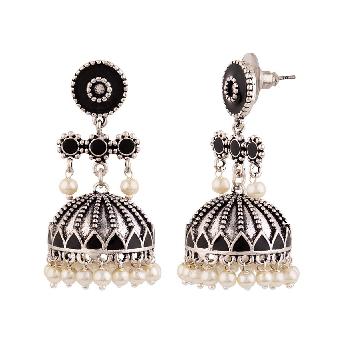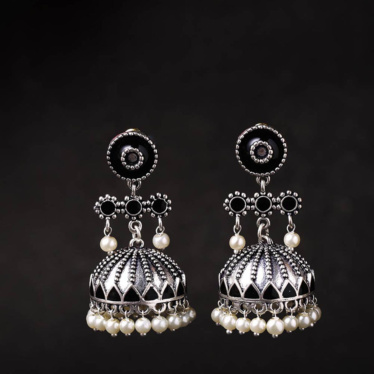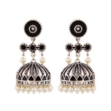 Brass floral motifs and faux pearls adorned earrings, with oxidized silver plating. Pair with a casual kurta.