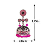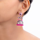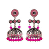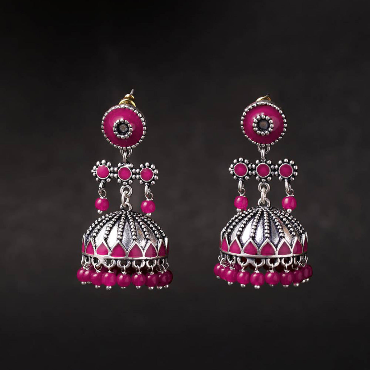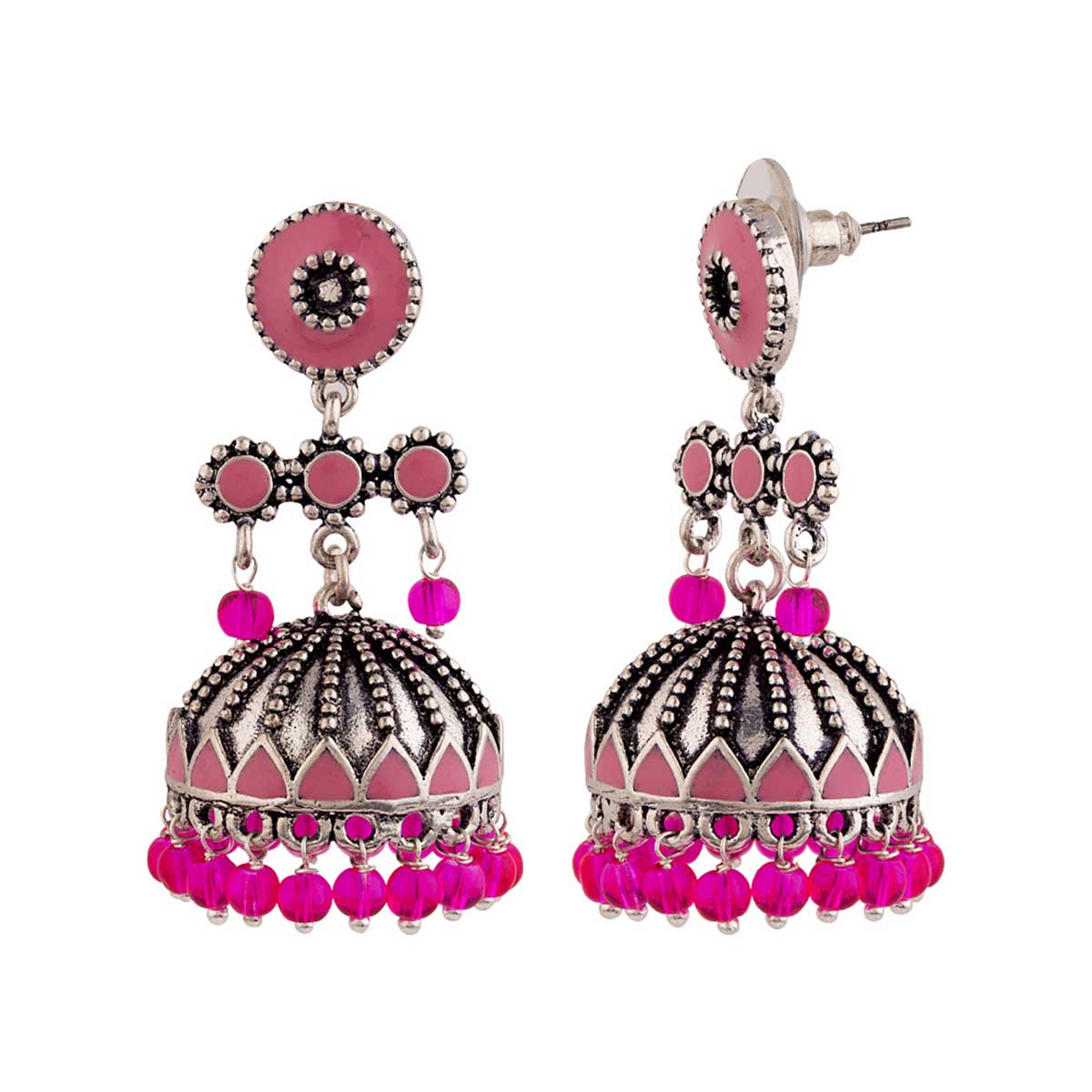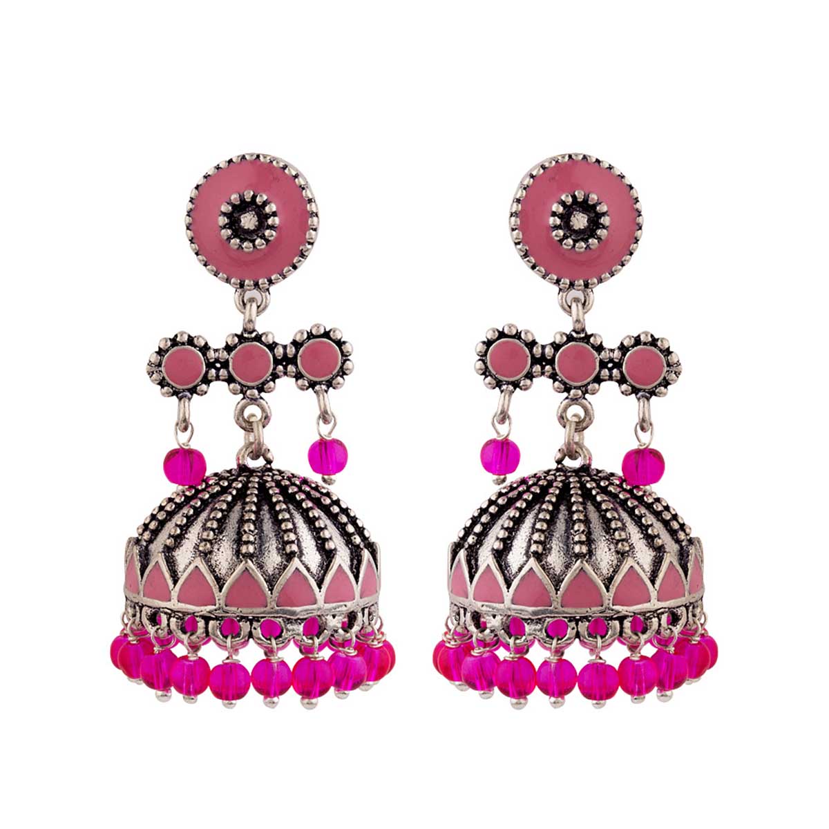 Pink beads embellished jhumka earrings. Oxidized silver plated and made from brass. Good for casual wear.