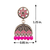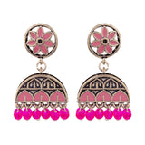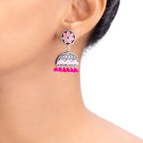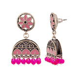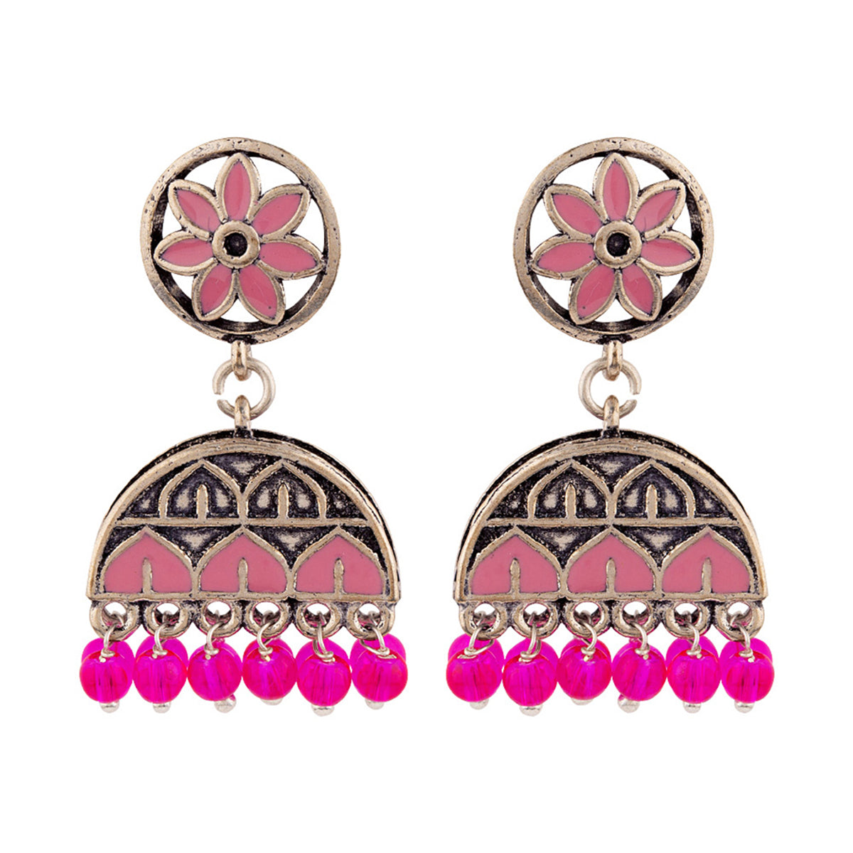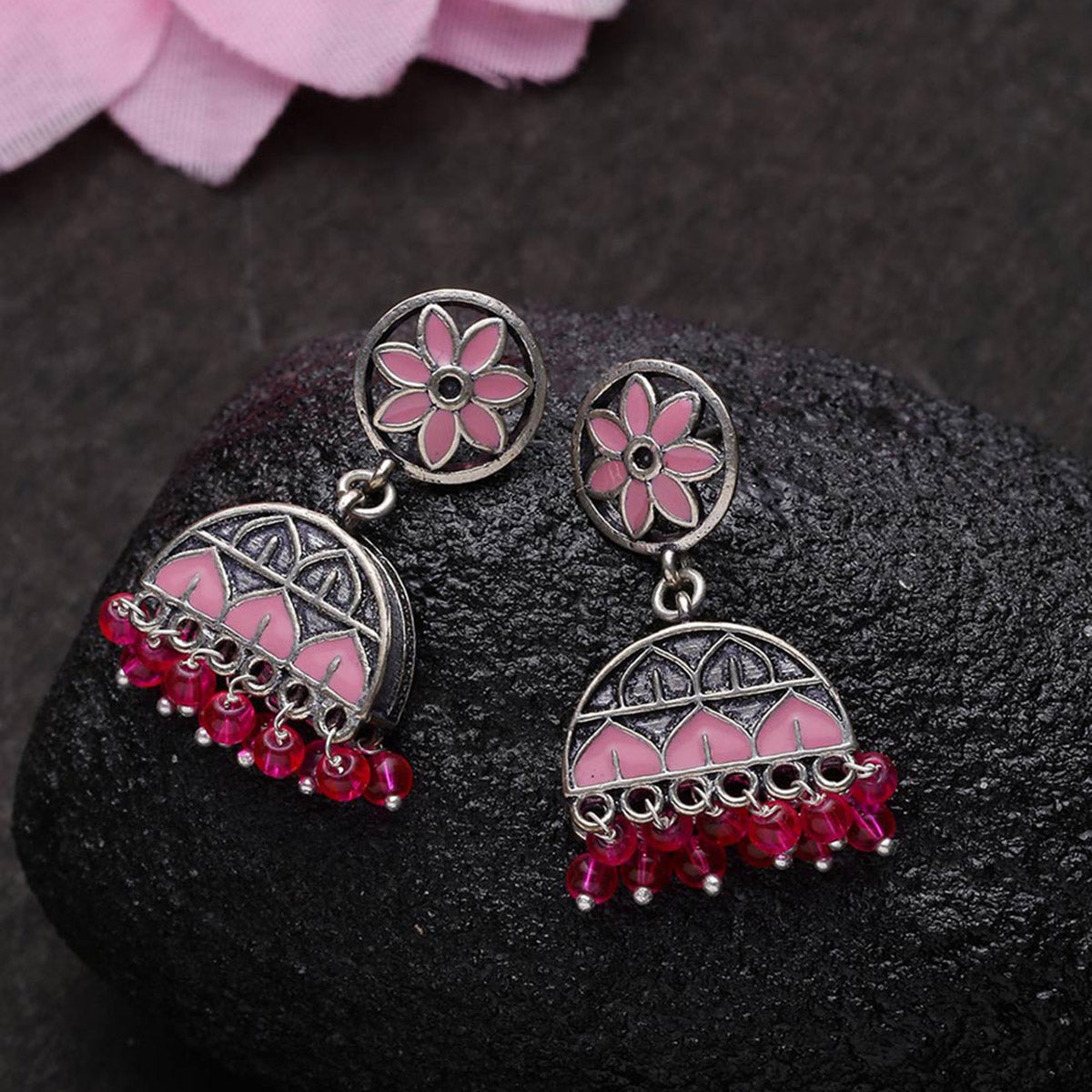 Pink embellishments adorned earrings made from brass. Wear the oxidized silver plated pair with casual ethnic outfits.