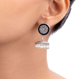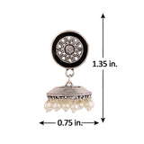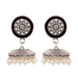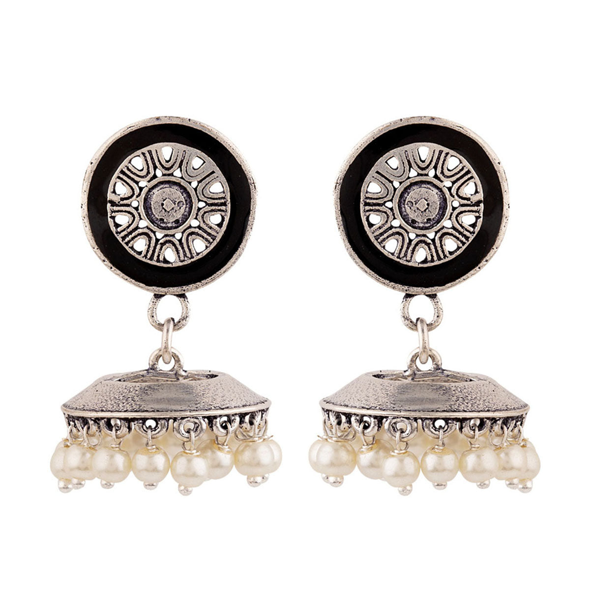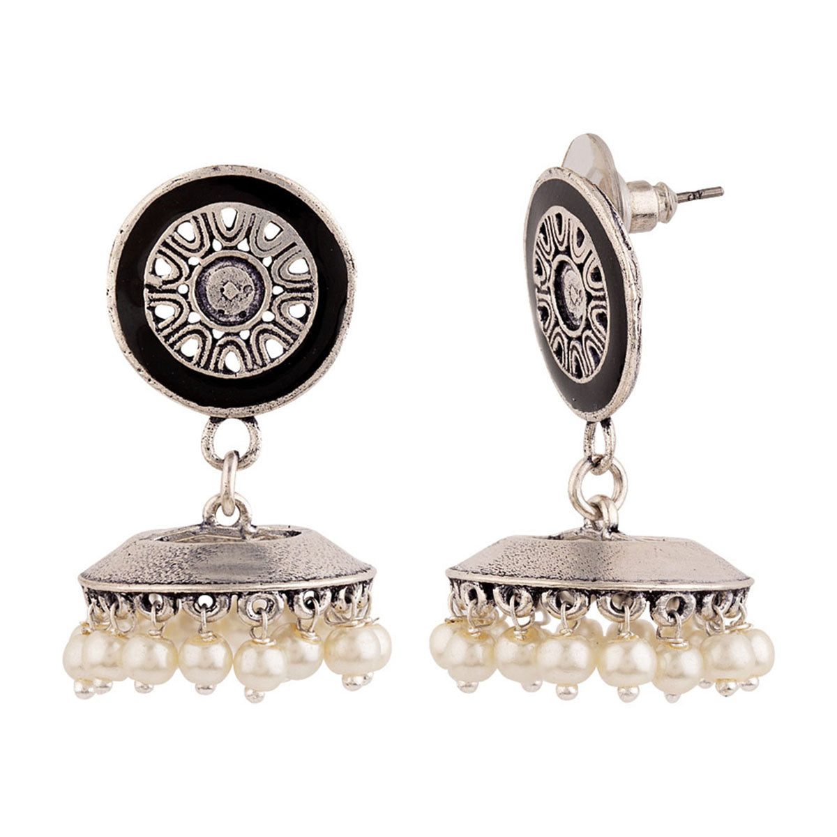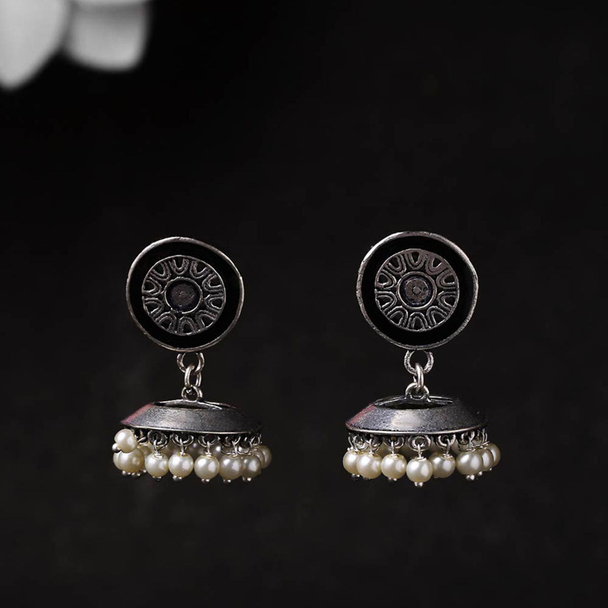Tiny jhumka earrings with faux pearls and enamel details. Brass has been used in the making of this oxidized silver plated pair. Good for casual wear.