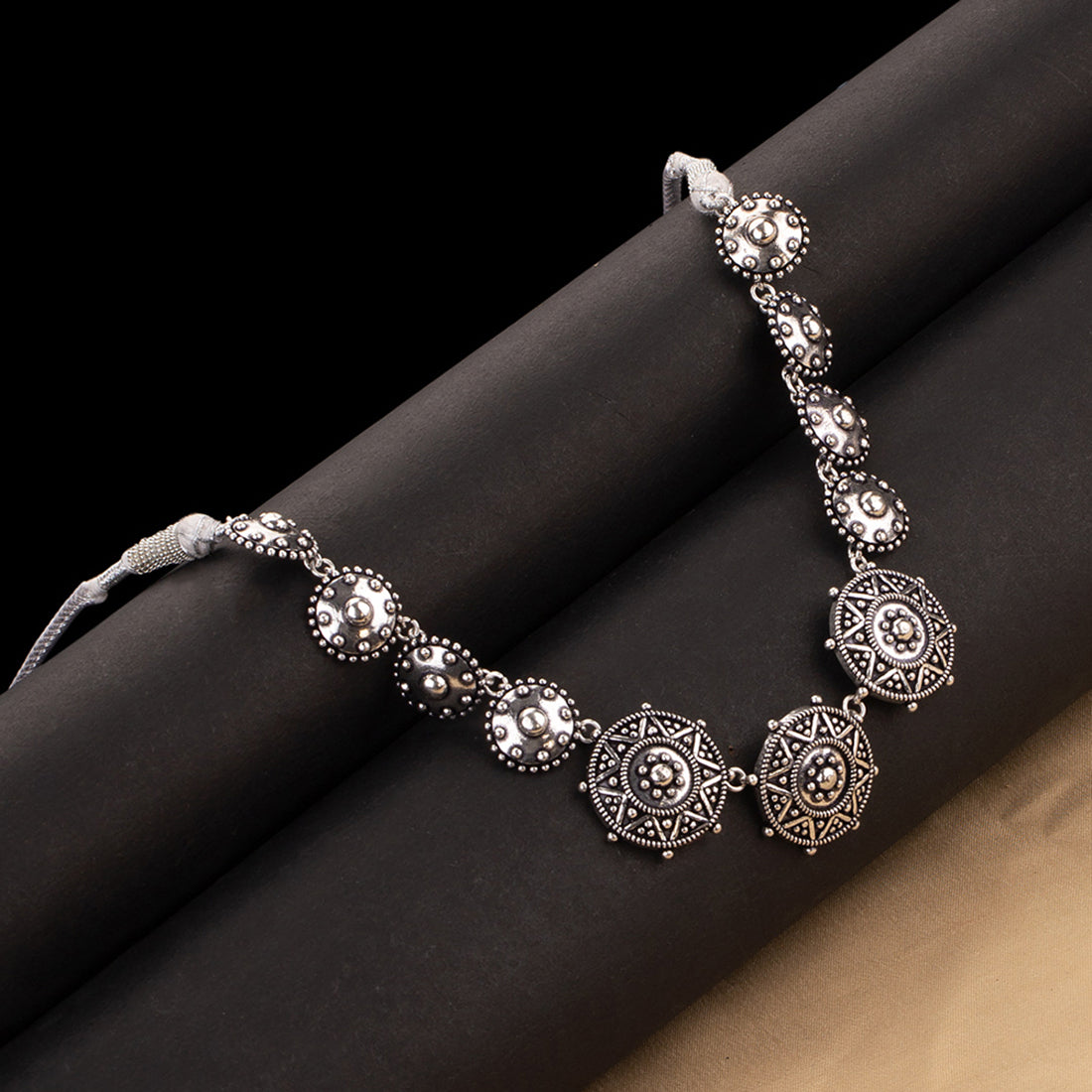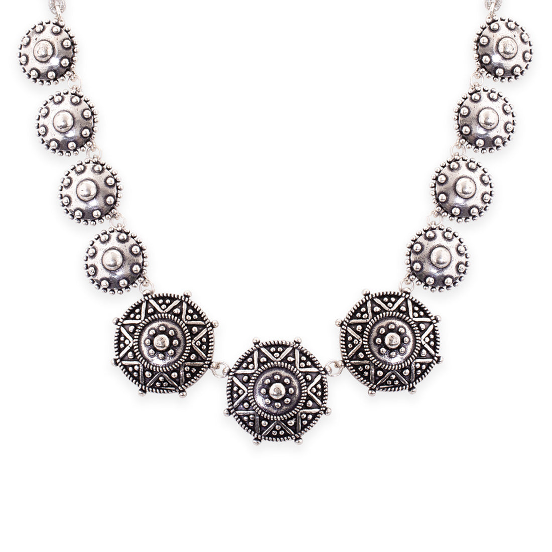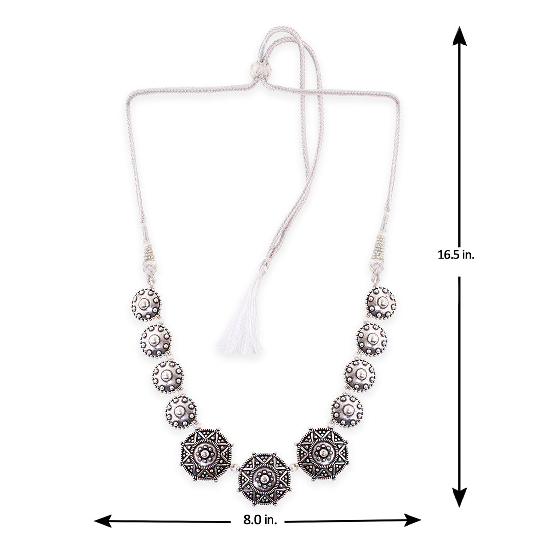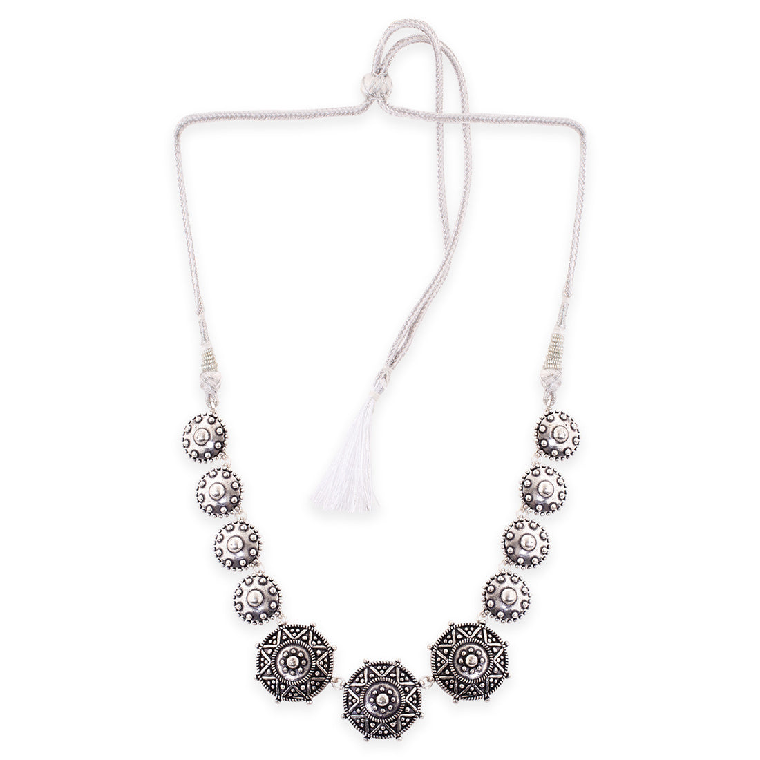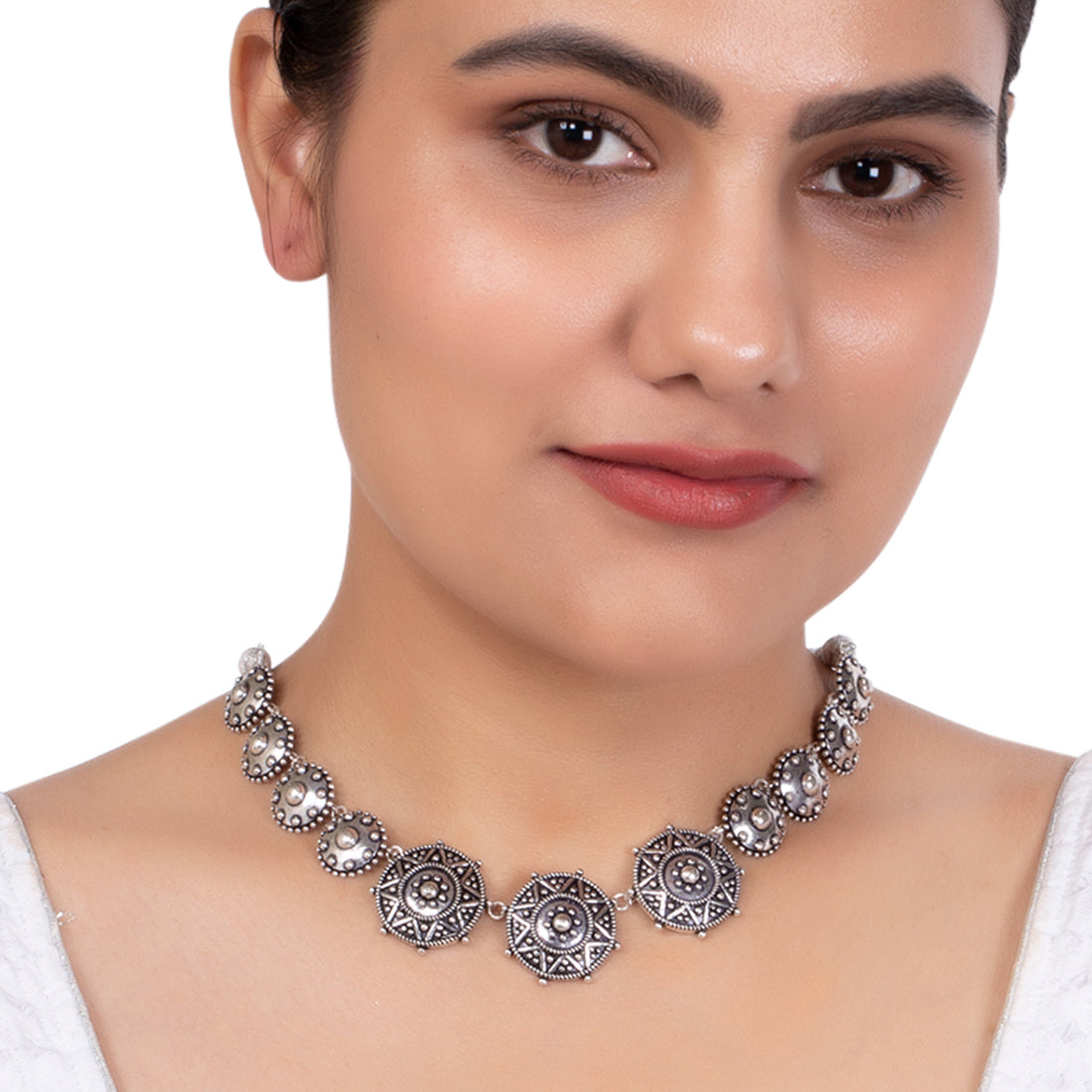 Add charm and charisma to your beautiful personality with this stunning choker necklace. It has been crafted with brass and has been plated with oxidized silver with a round motif. Wear it with any of your formal or casual outfits...