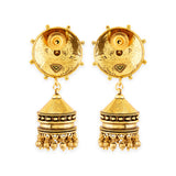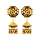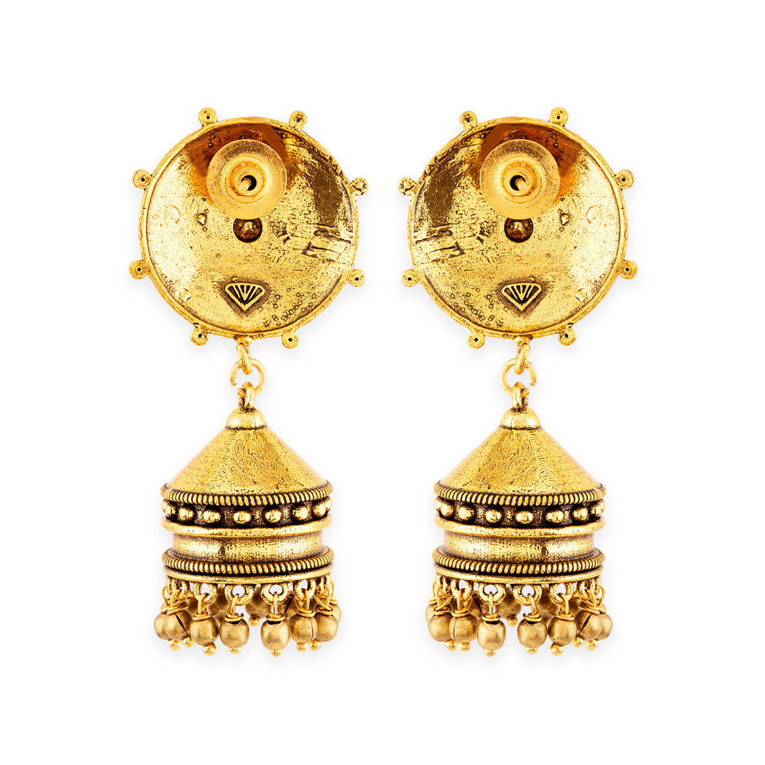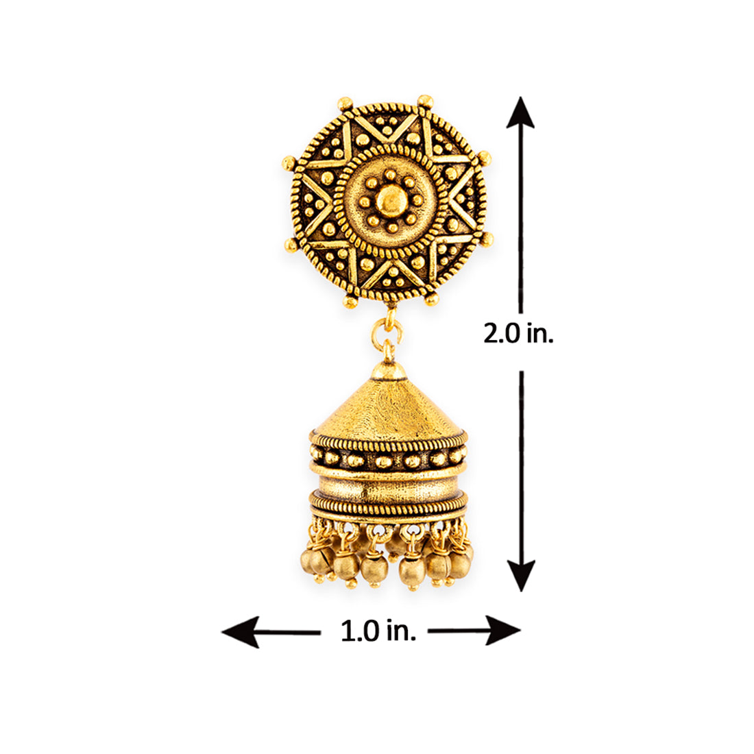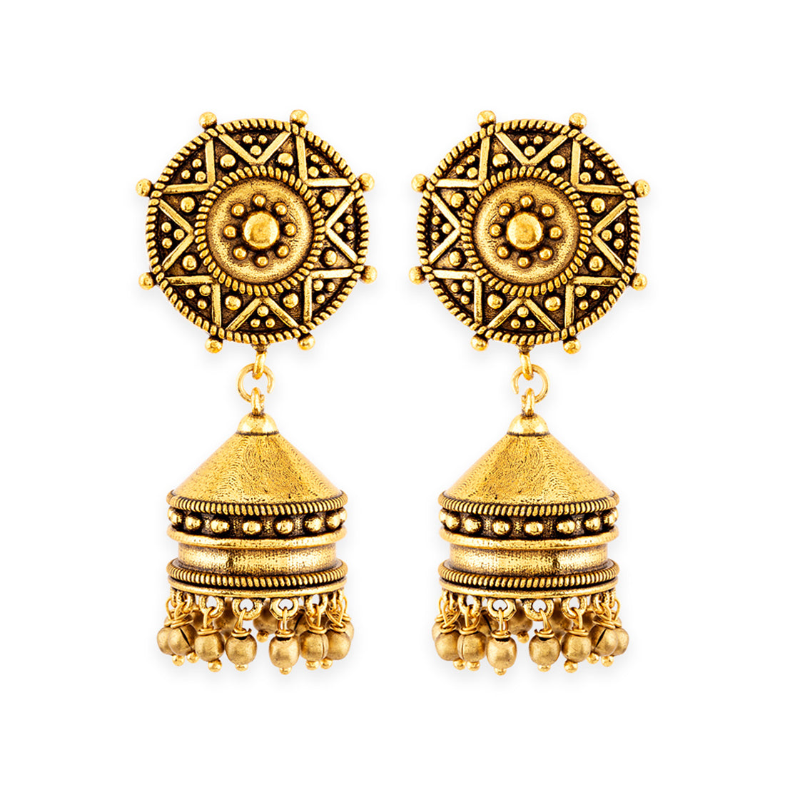 With precise and detailed work this pair of brass earrings are classy and elegant at the same time. Featuring an excellent oxidized gold finish that gives out an exquisite sense of style. It gets well with any Indian wear such as saree Kurti.