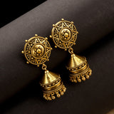 These brass earrings are a classy option for a traditional look. With an excellent oxidized silver finish and tomb motif this pair gives out an exquisite sense of style. You can pair it with any Indian wear such as saree...