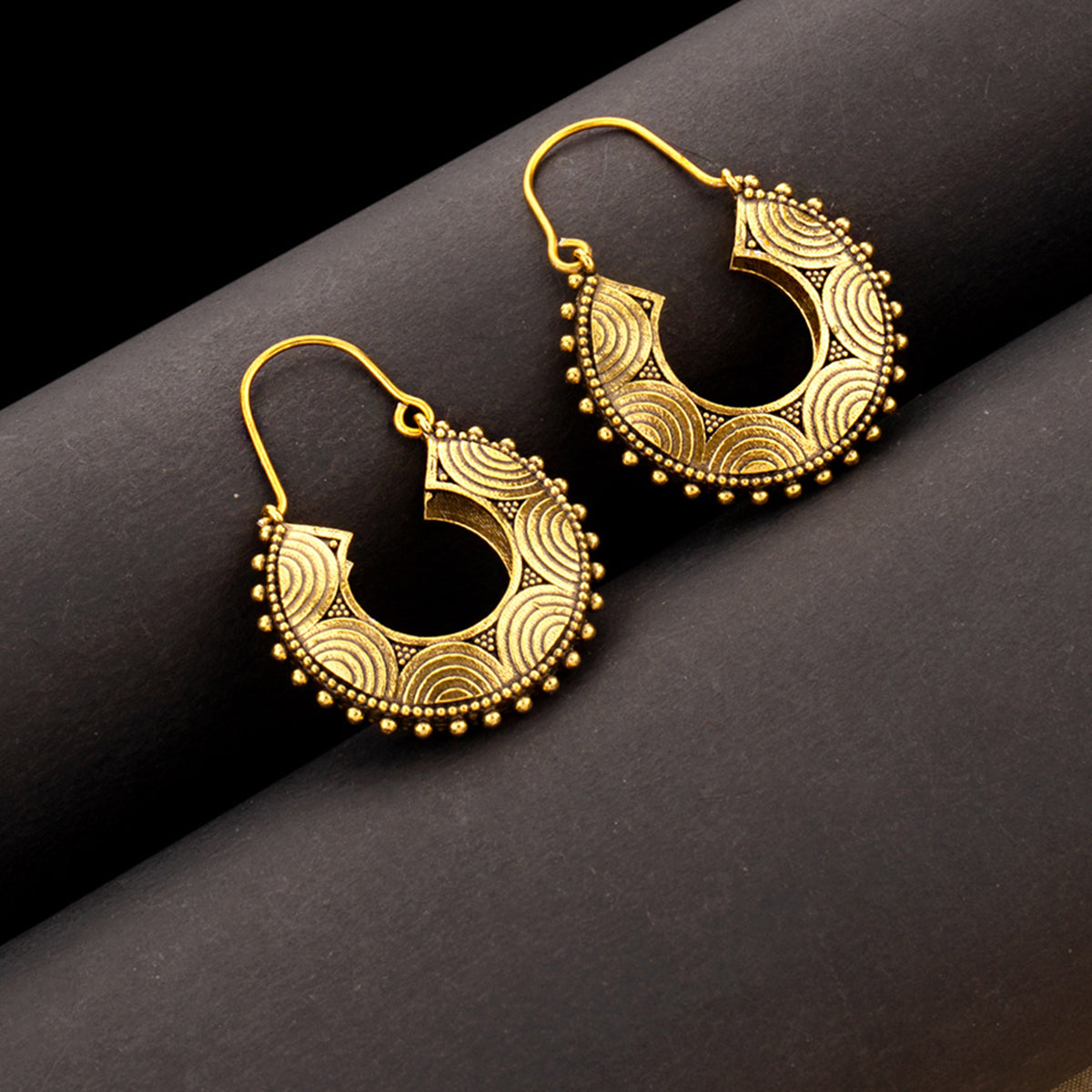 Add luster to your ethnic look by donning these trendy earrings. This brass pair has given an oxidized gold finish that gives out an exquisite sense of style. Accessorize your simple kurta with a pair of these earrings.Weight (Gms): 10.08Size...