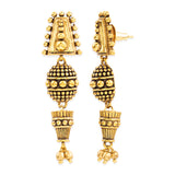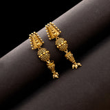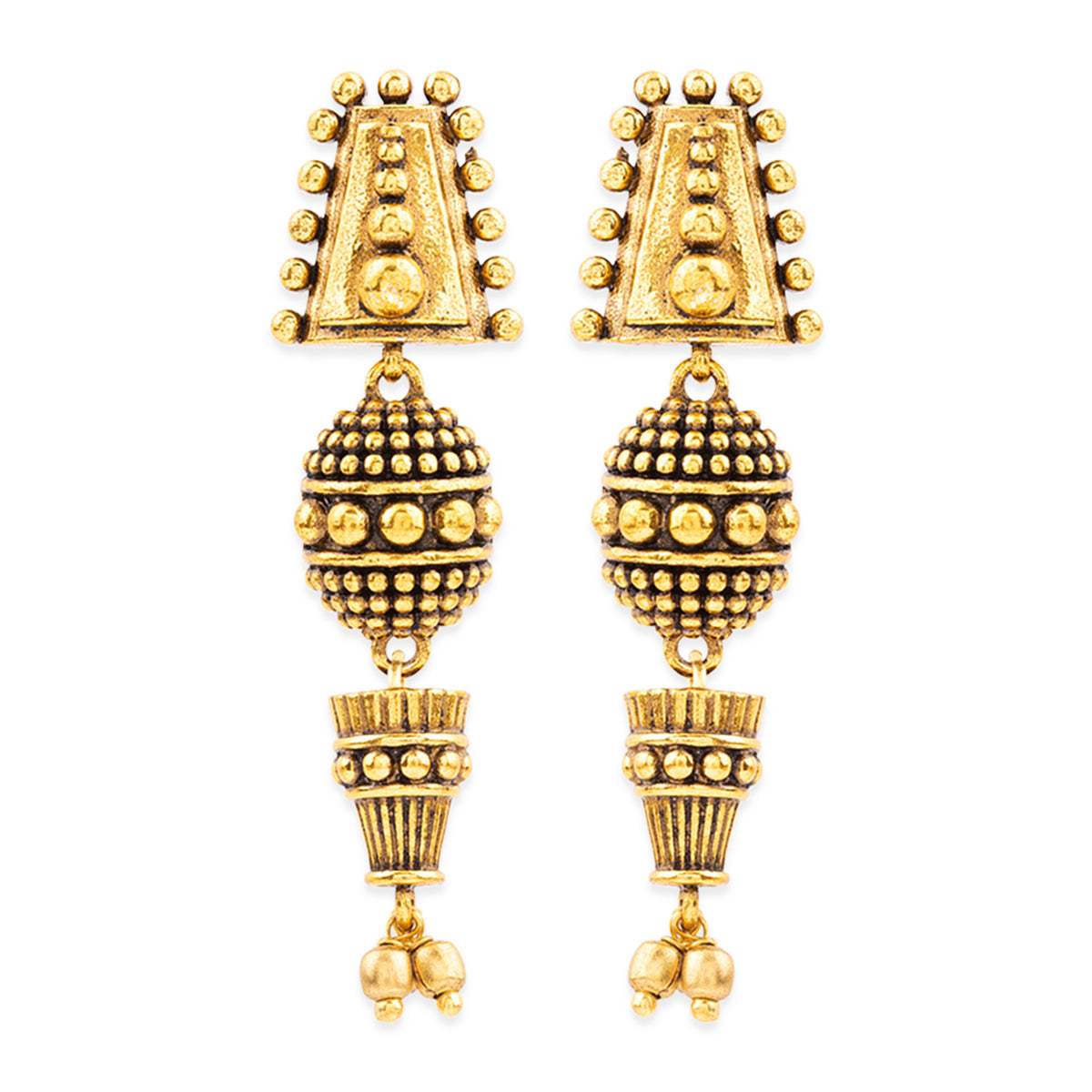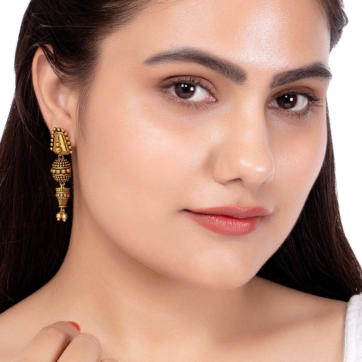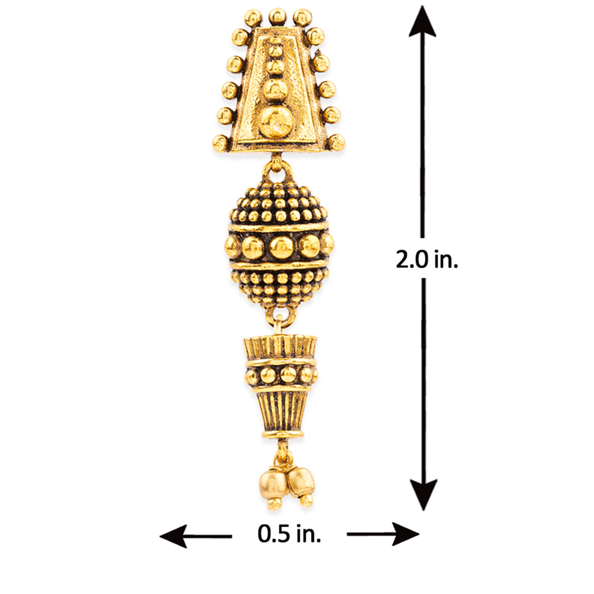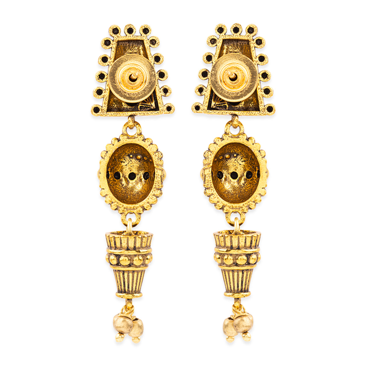 Add luster to your ethnic look by donning these trendy earrings. This brass pair has given an oxidized gold finish that gives out an exquisite sense of style. Accessorize your simple kurta with a pair of these earrings.Weight (Gms): 10.08Size...