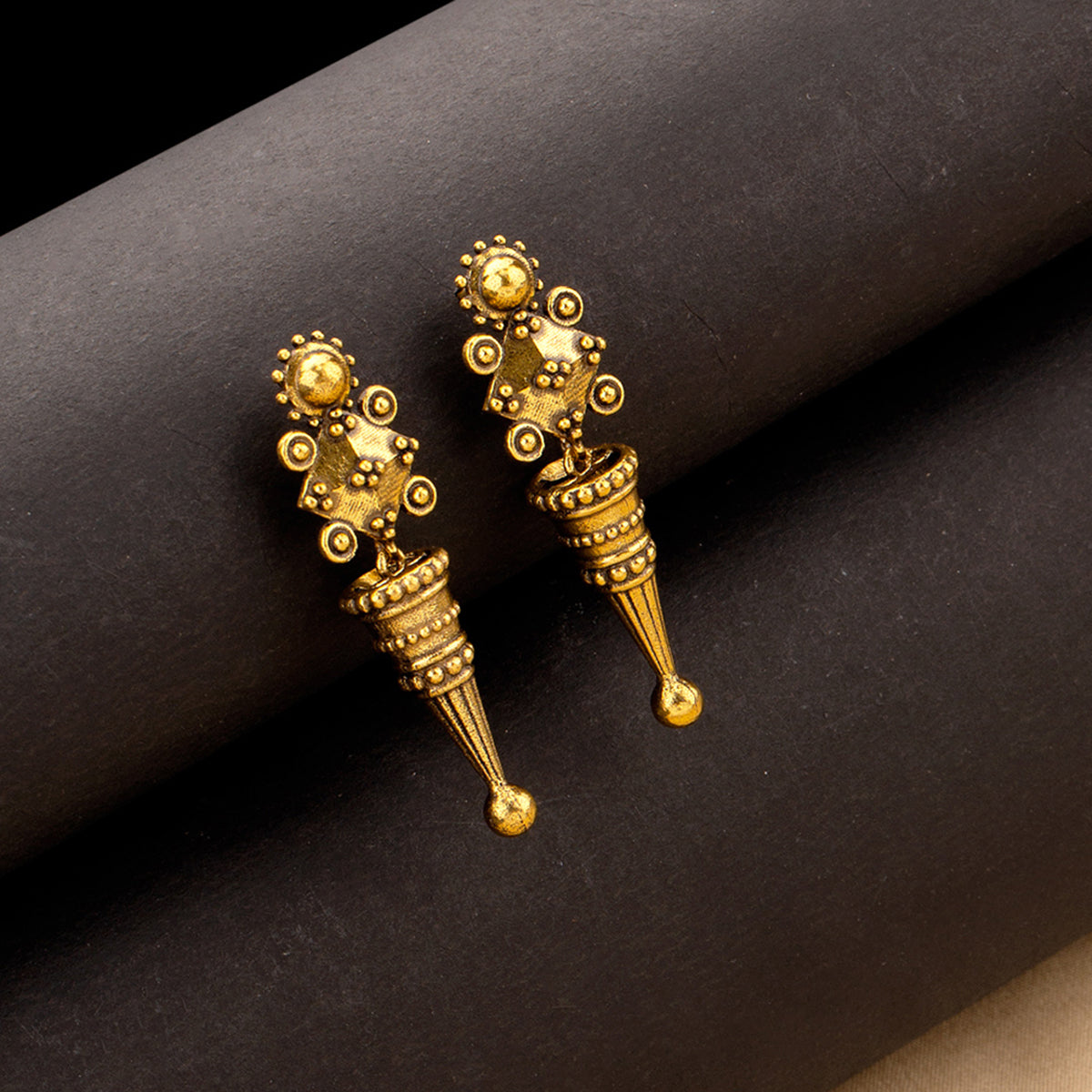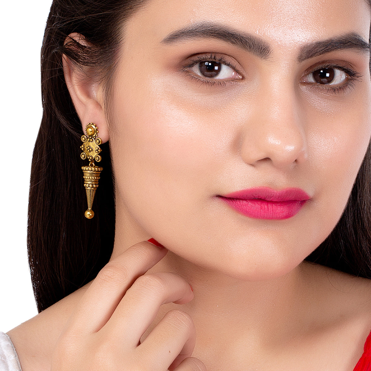 Add luster to your ethnic look by donning these trendy earrings. This brass pair has given an oxidized gold finish that gives out an exquisite sense of style. Accessorize your simple kurta with a pair of these earrings.Weight (Gms): 10.08Size...
