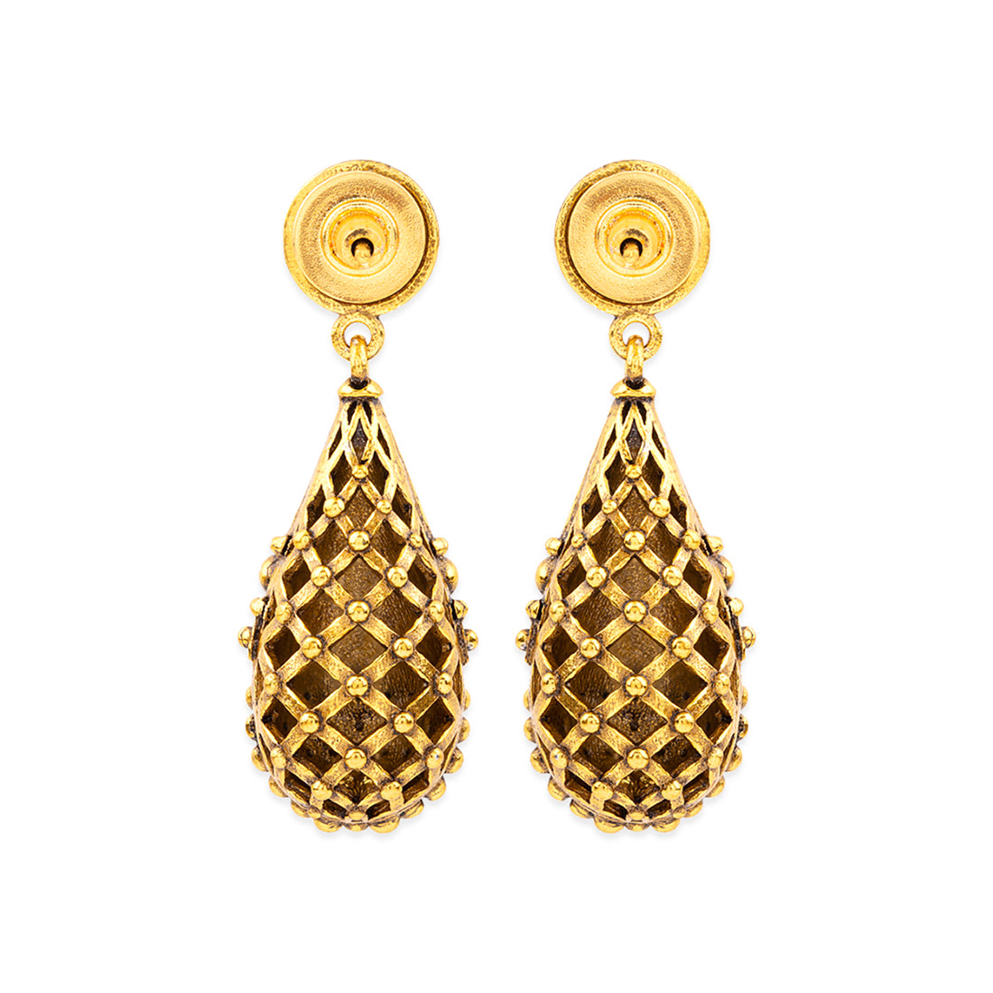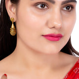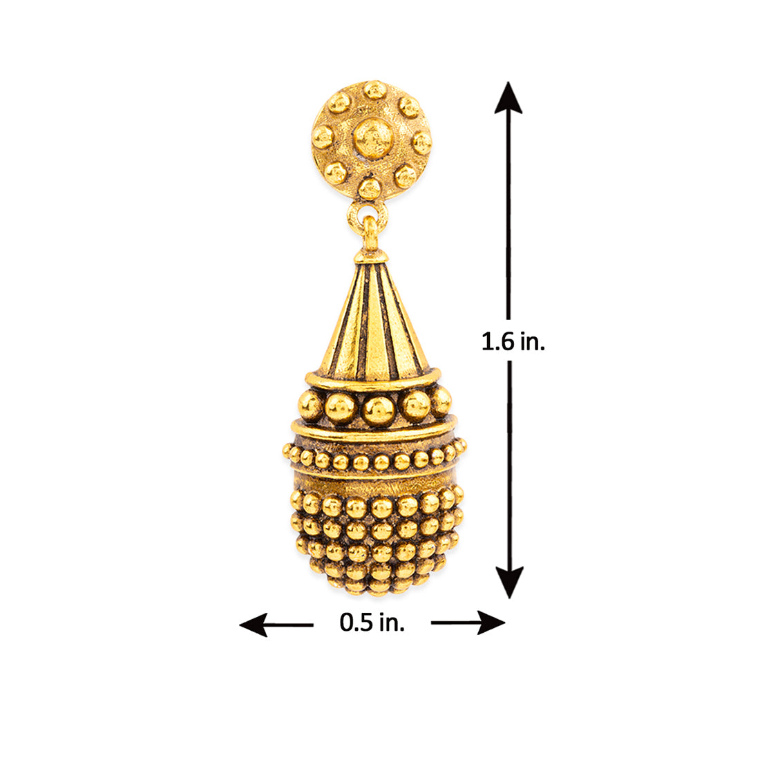 Add luster to your ethnic look by donning these trendy earrings. This brass pair has given an oxidized gold finish that gives out an exquisite sense of style. Accessorize your simple kurta with a pair of these earrings.Weight (Gms): 10.08Size...