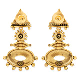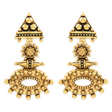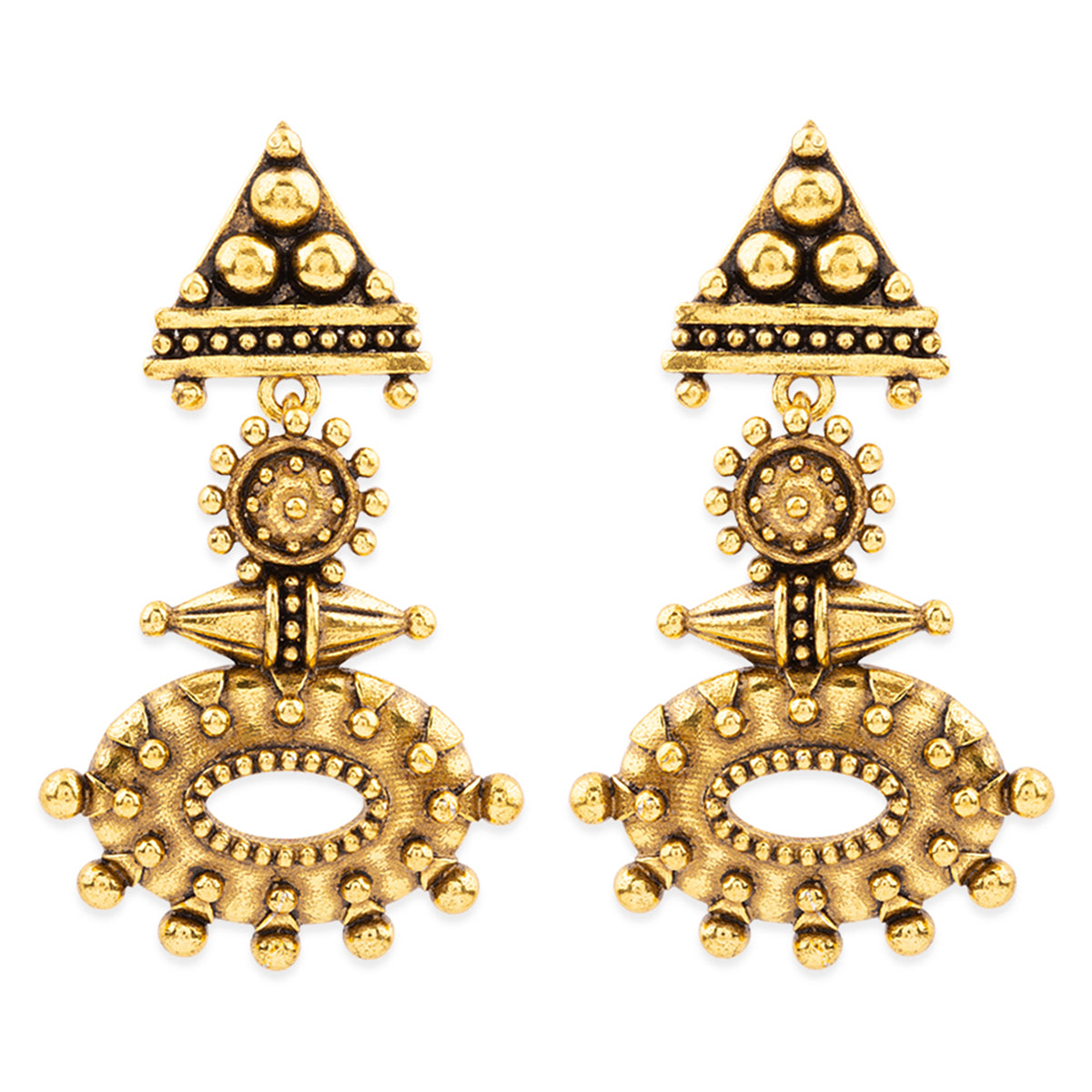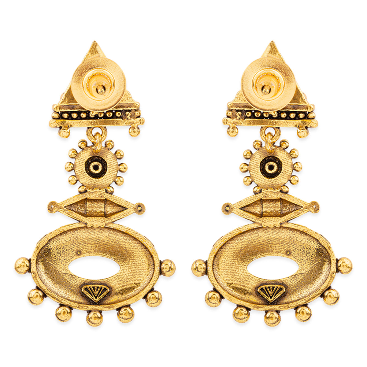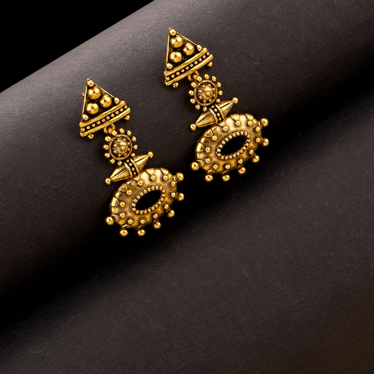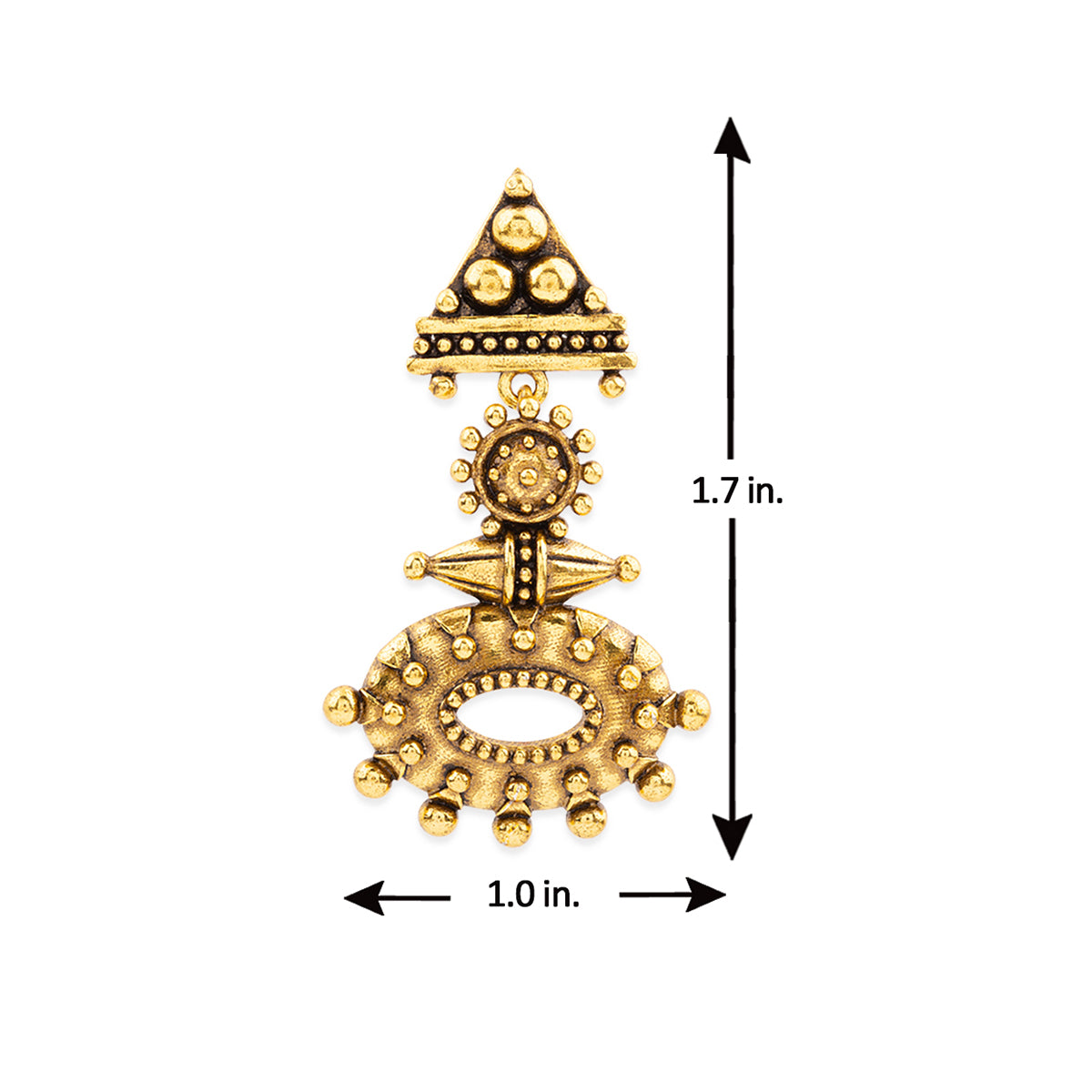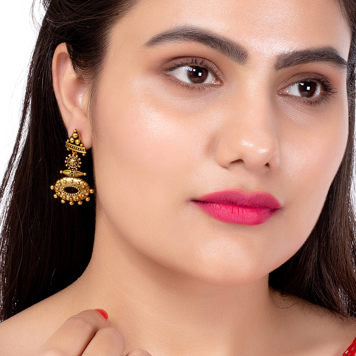Add luster to your ethnic look by donning these trendy earrings. This brass pair has given an oxidized gold finish that gives out an exquisite sense of style. Accessorize your simple kurta with a pair of these earrings.