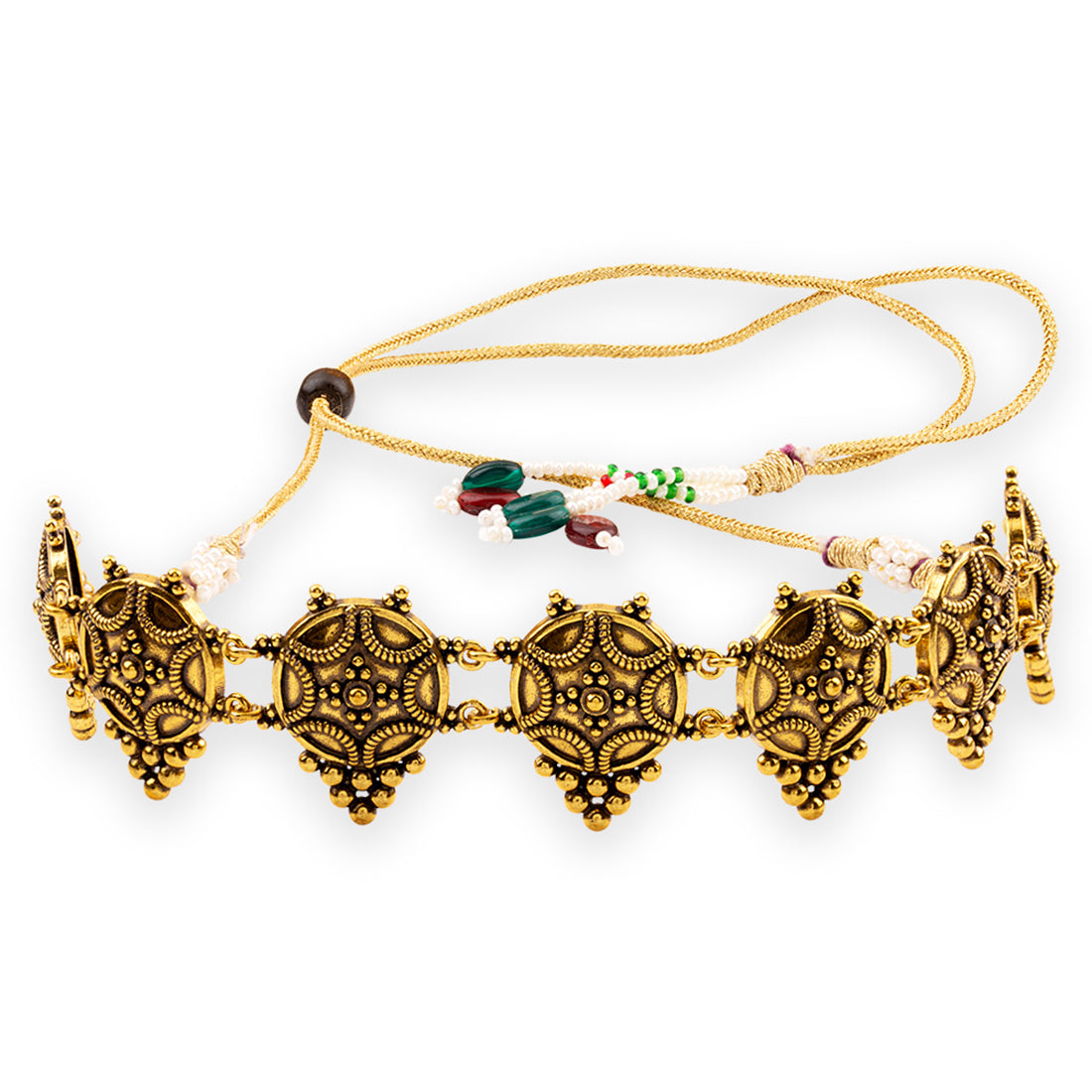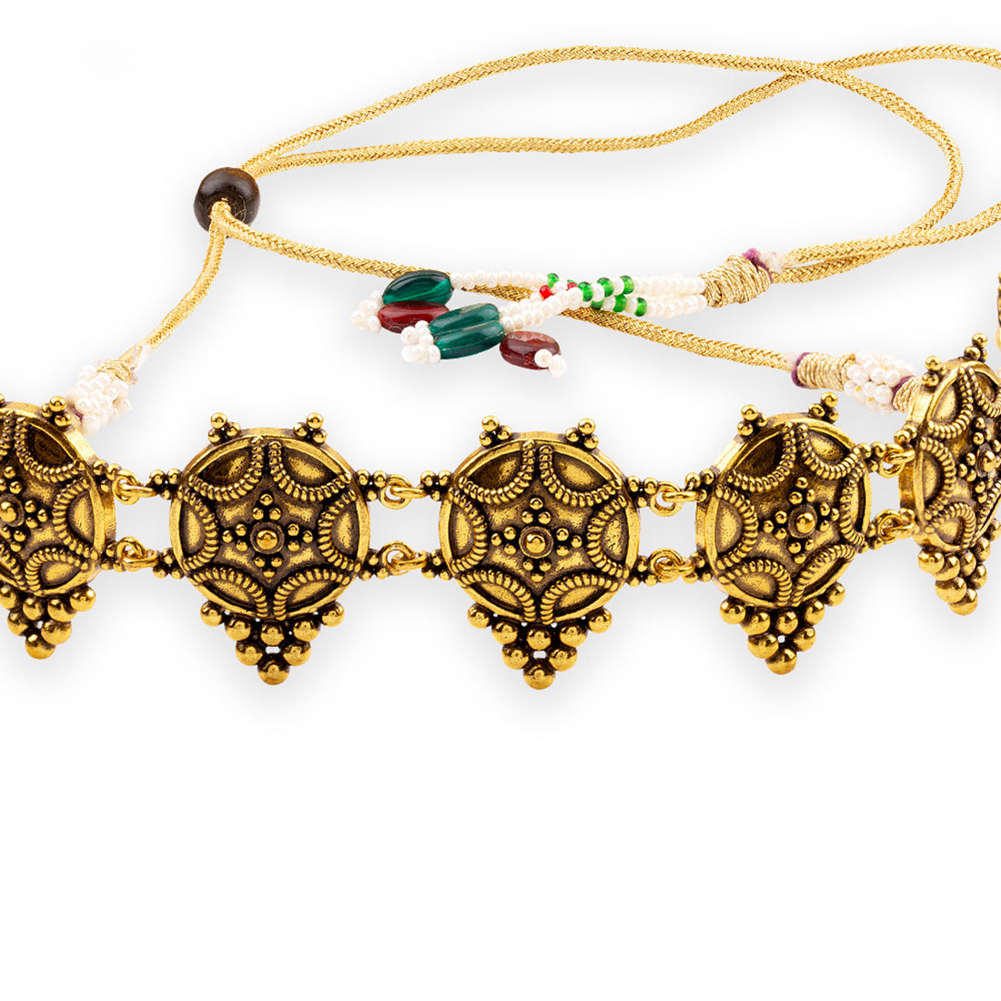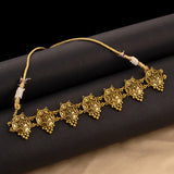 Give a lovely touch to your traditional look with this brass choker necklace. This necklace has an excellent oxidized gold finish and gives out an exquisite sense of style. Pair it with a saree or lehenga.