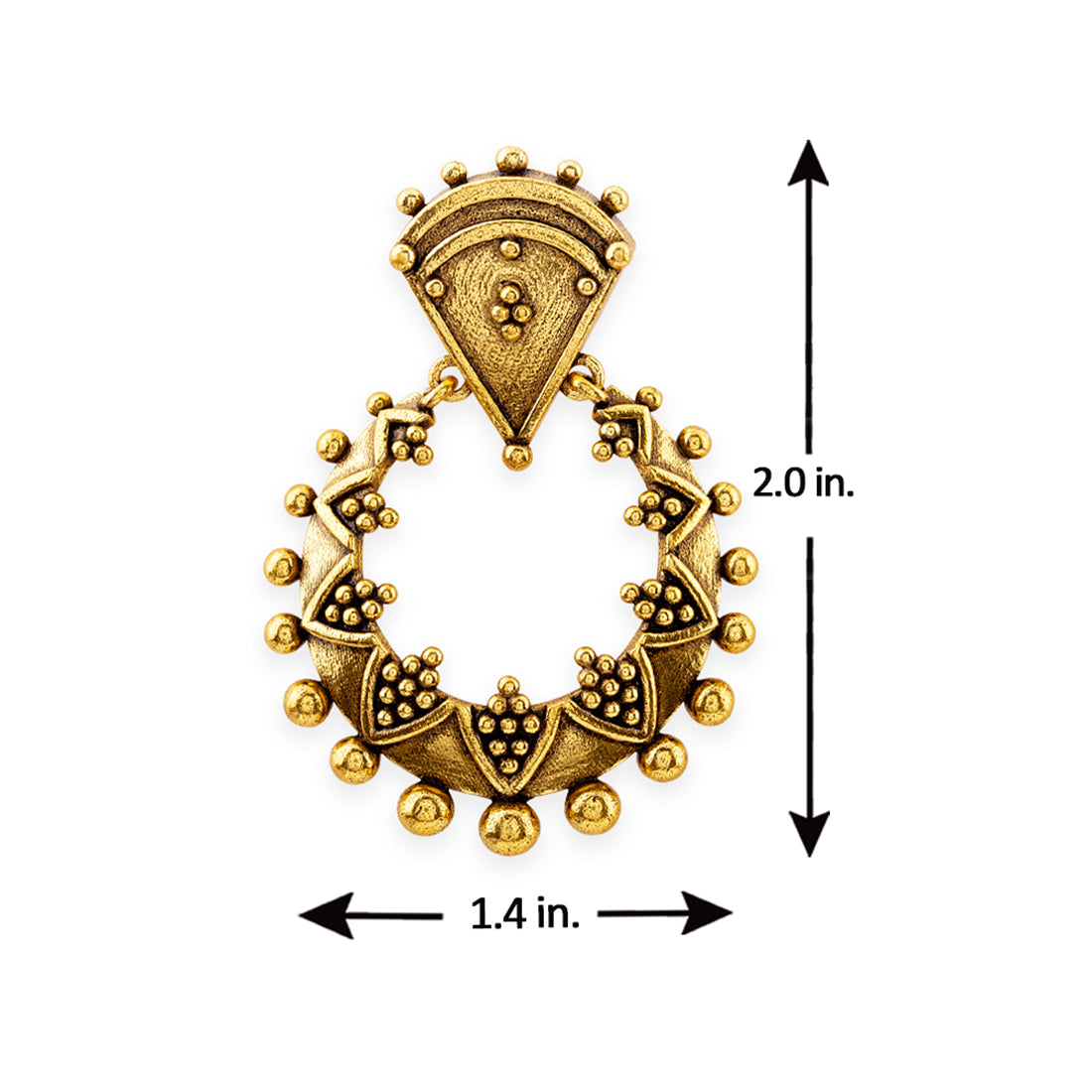 Add luster to your ethnic look by donning these trendy earrings. This brass pair has given an oxidized gold finish that gives out an exquisite sense of style. Accessorize your simple kurta with a pair of these earrings.Weight (Gms): 10.08Size...