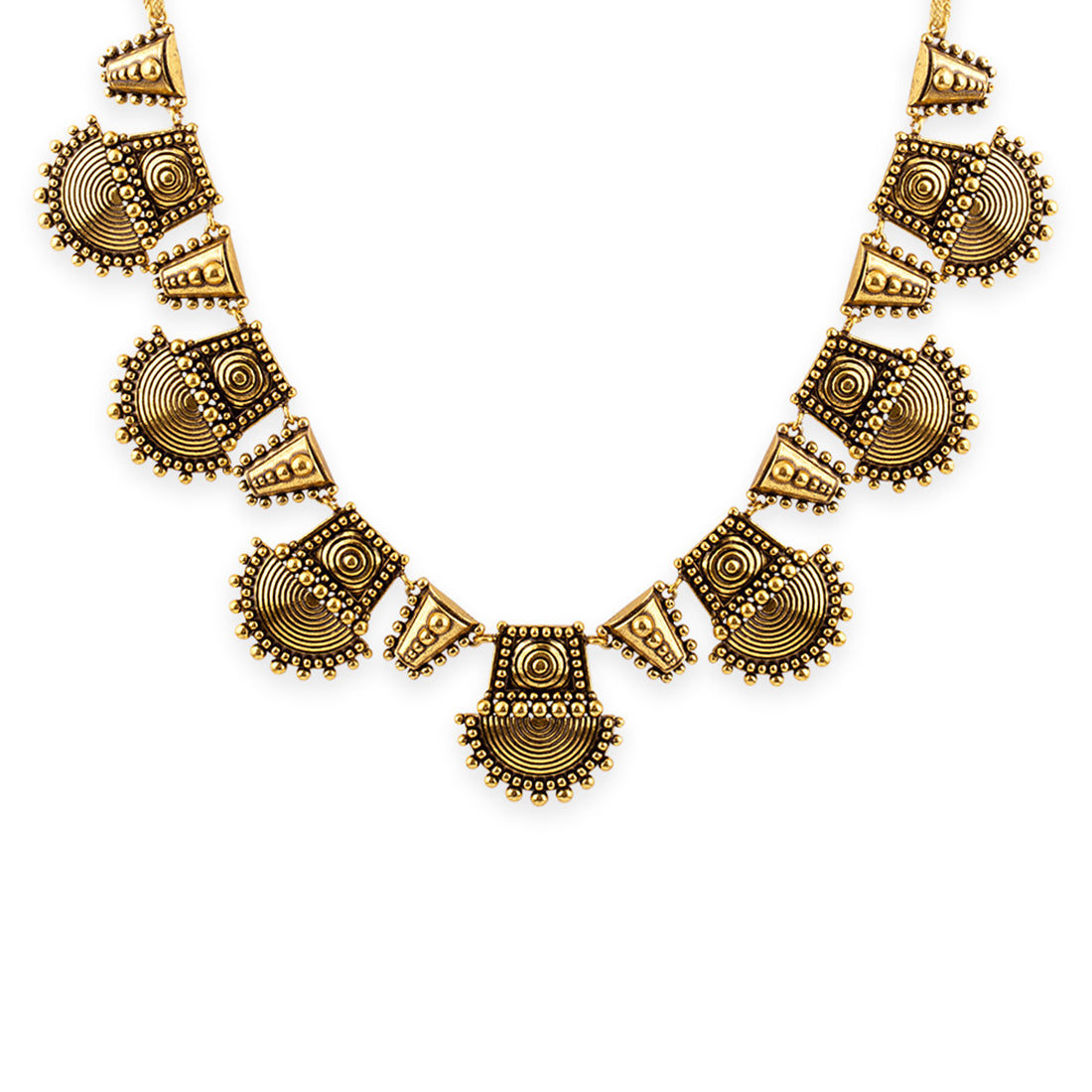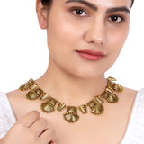 This brass necklace gives you a perfect antique style. It has an excellent oxidized gold finish and gives out an exquisite sense of style. You can accessorize a beautiful saree with this necklace.