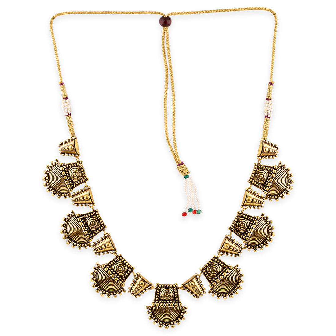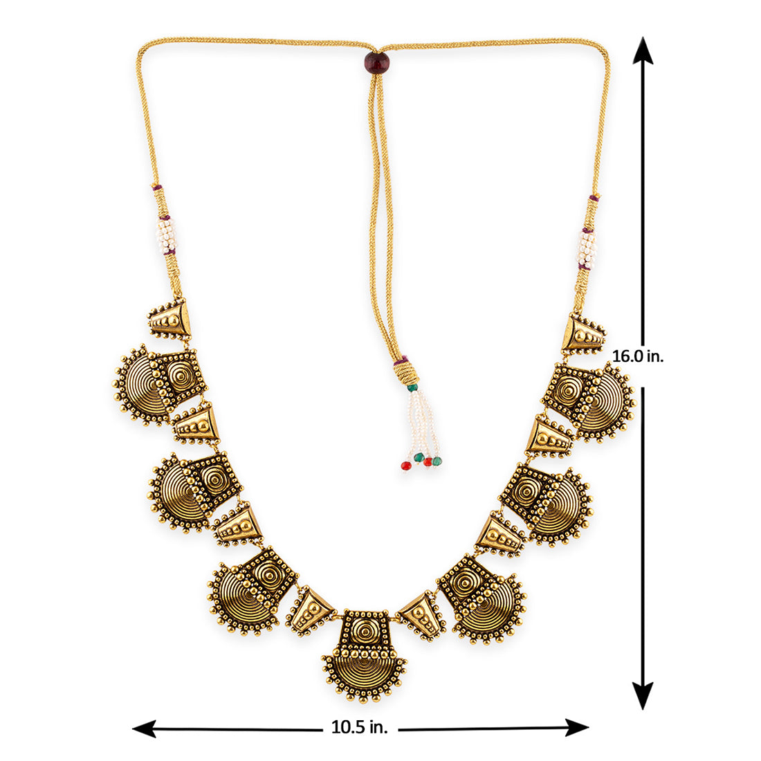 Adorn your beautiful personality with this exquisitely designed oxidized gold necklace in brass Pair it up with any casual, semi formal, or formal attire for that traditional yet contemporary look.Weight (Gms): 52Size (LxW)(Inch): 15.5*8Material: BrassPlating: Oxidized GoldColor: GoldSales Package: 1...
