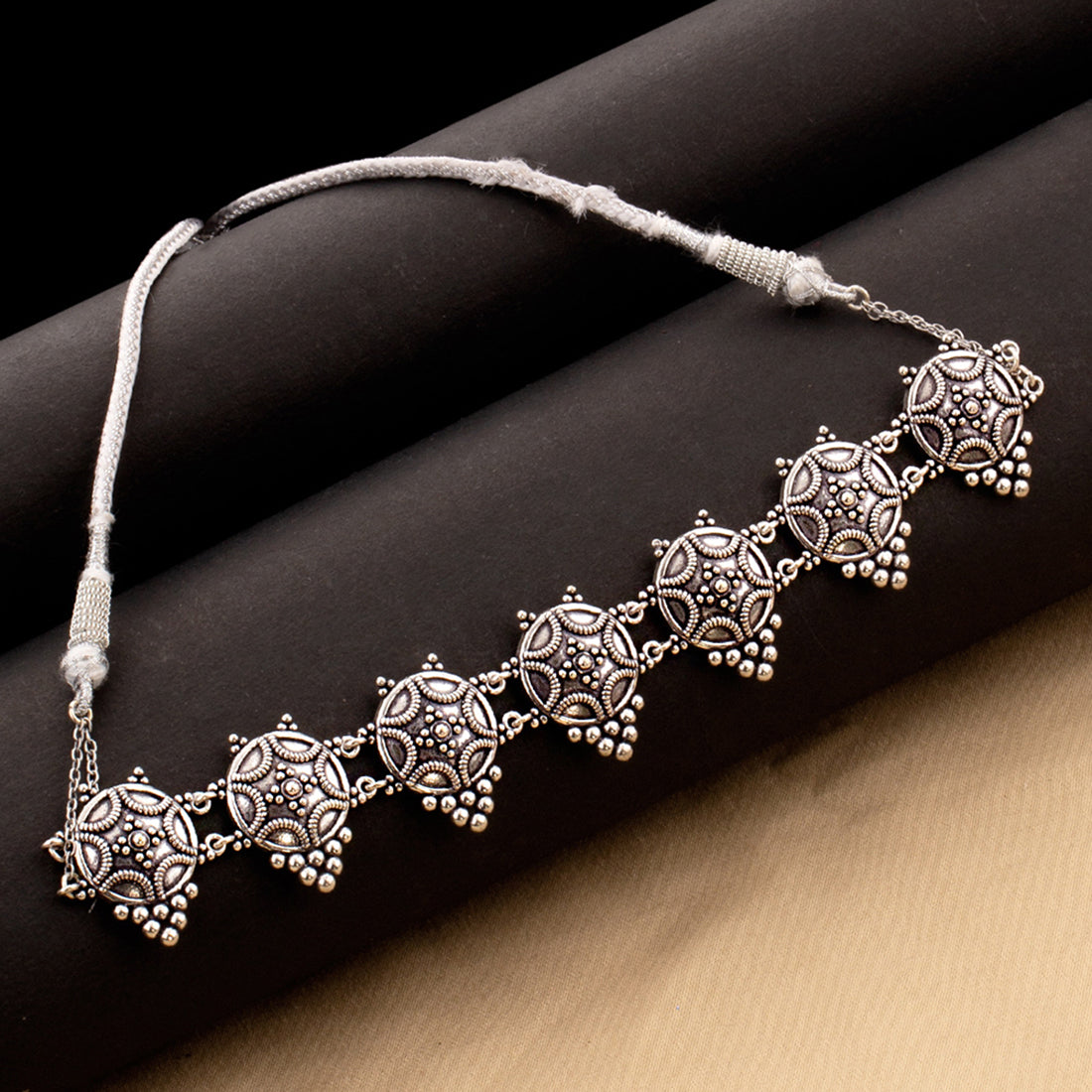 Add charm and charisma to your beautiful personality with this stunning choker necklace. It has been crafted with brass and has been plated with oxidized silver with a round motif. Wear it with any of your formal or casual outfits...