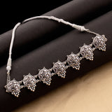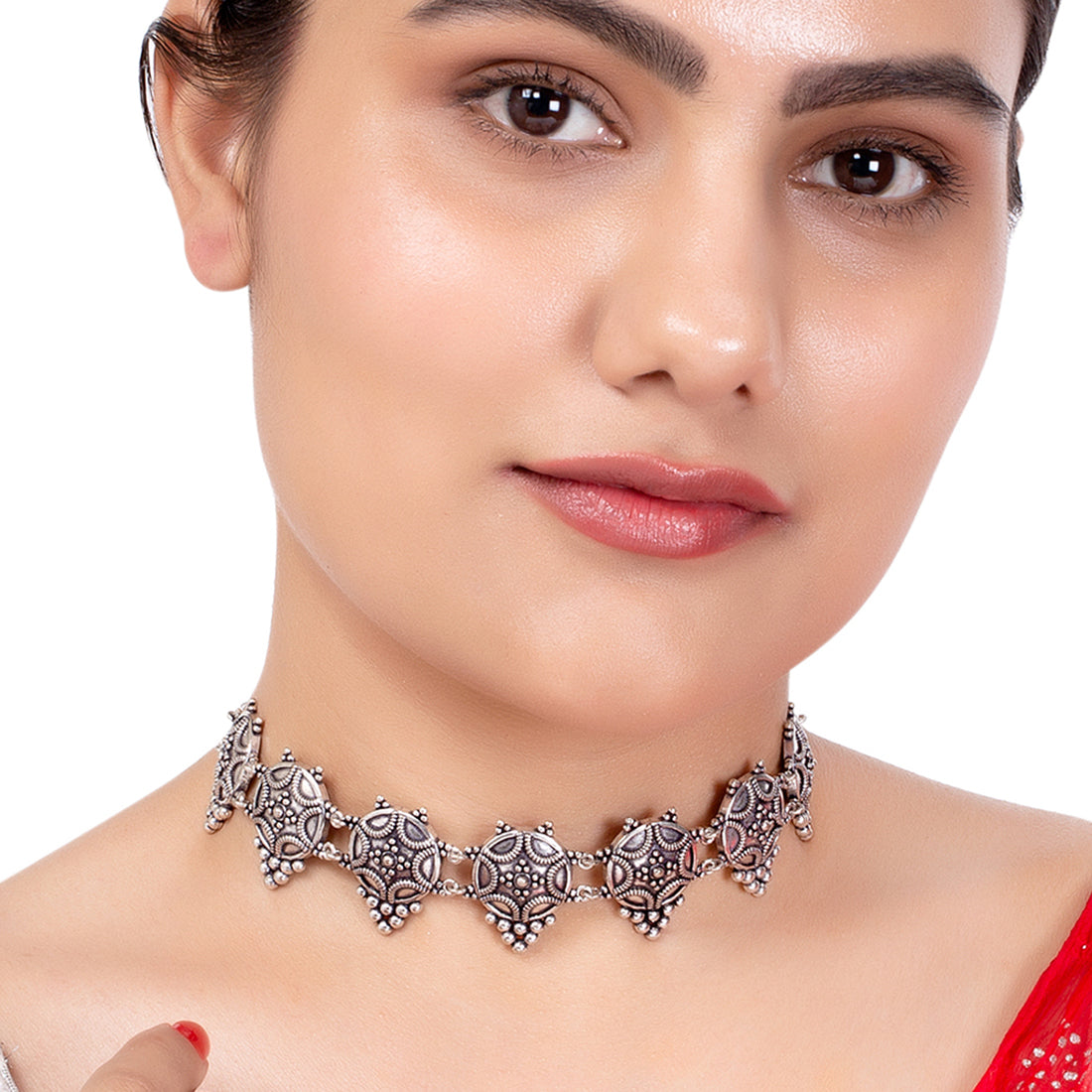 Adorn your neck beautifully with this choker necklace. This necklace has been crafted with brass and has given an excellent finishing of oxidized silver. You can be worn with medium necklines and shirts.Weight (Gms): 35Size (LxW)(Inch): 15.5*10Material: BrassPlating: Oxidized Silver...
