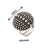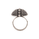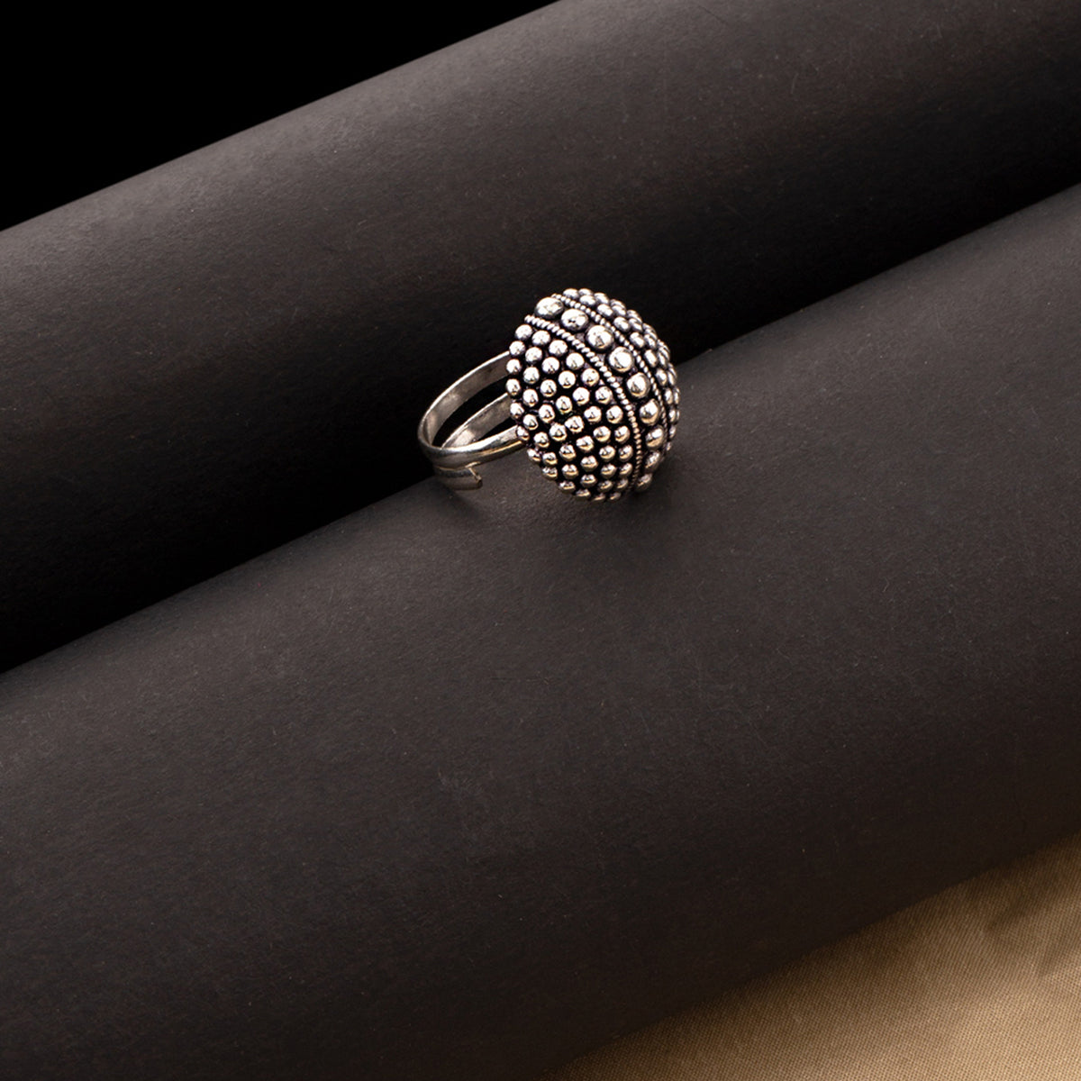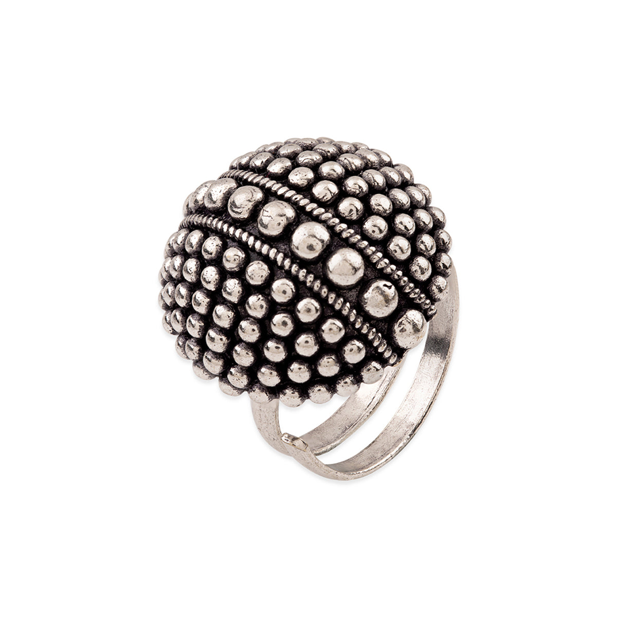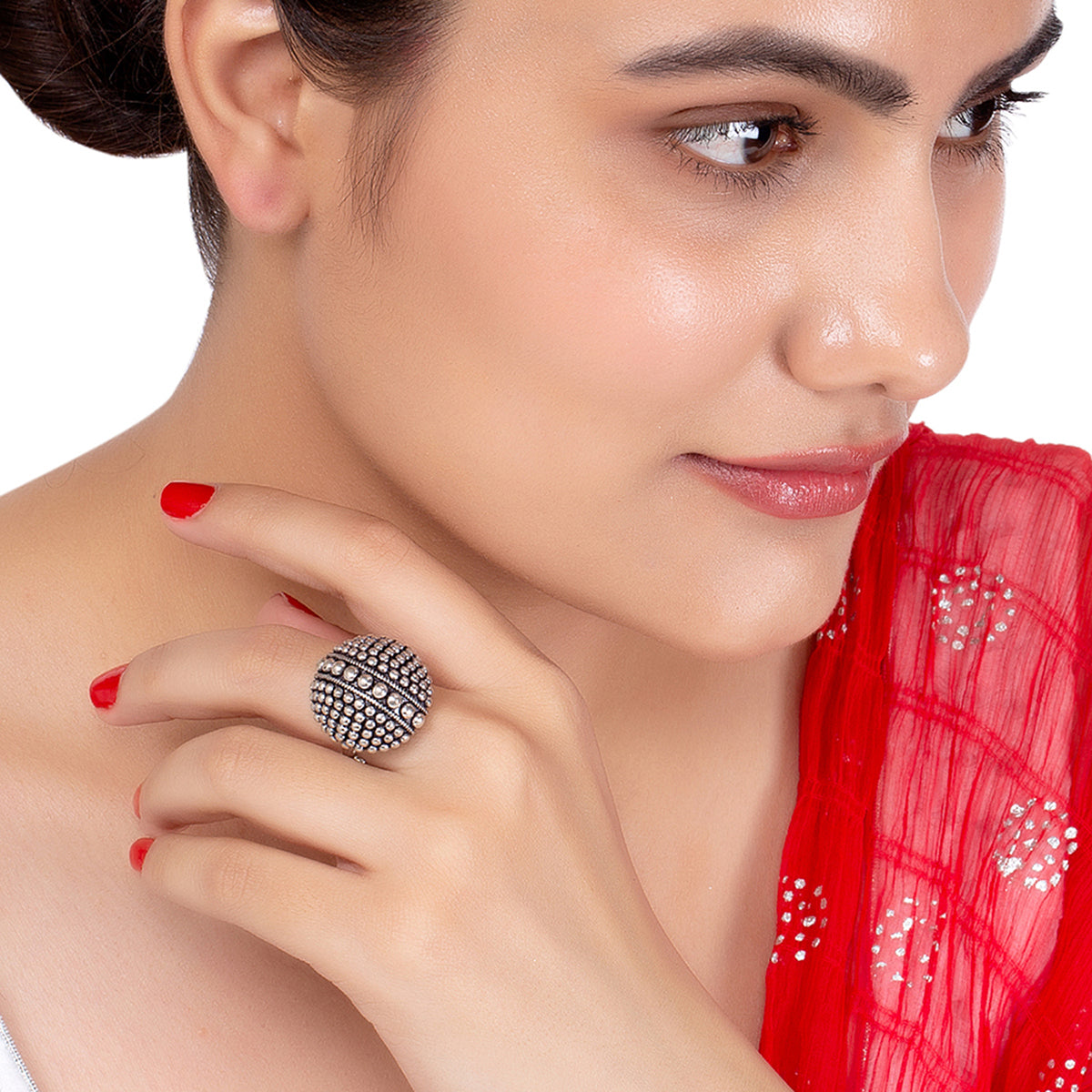 This wedding season, give an ancient touch to your ethnic look with a classy adjustable statement ring. Made up of brass with a rich silver oxidized plating. Wear it with a silk saree or Anarkali suit.