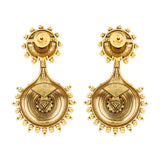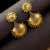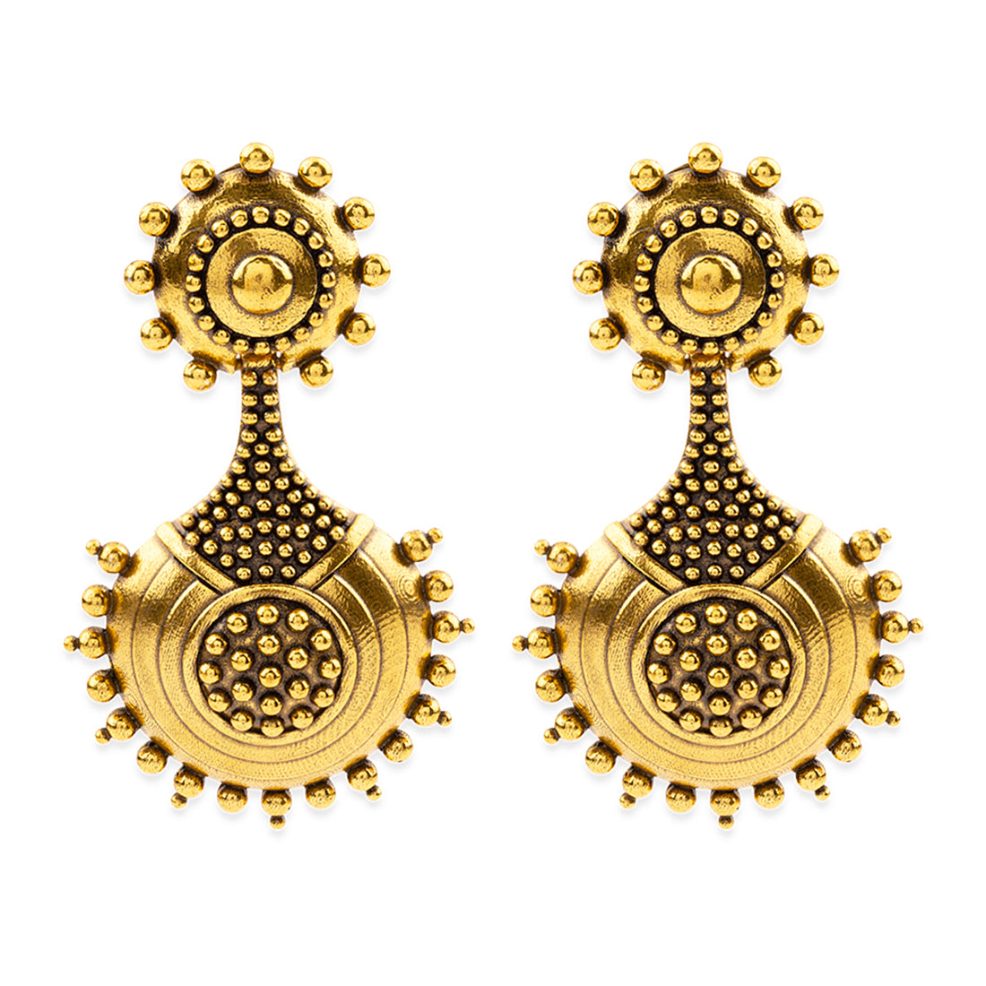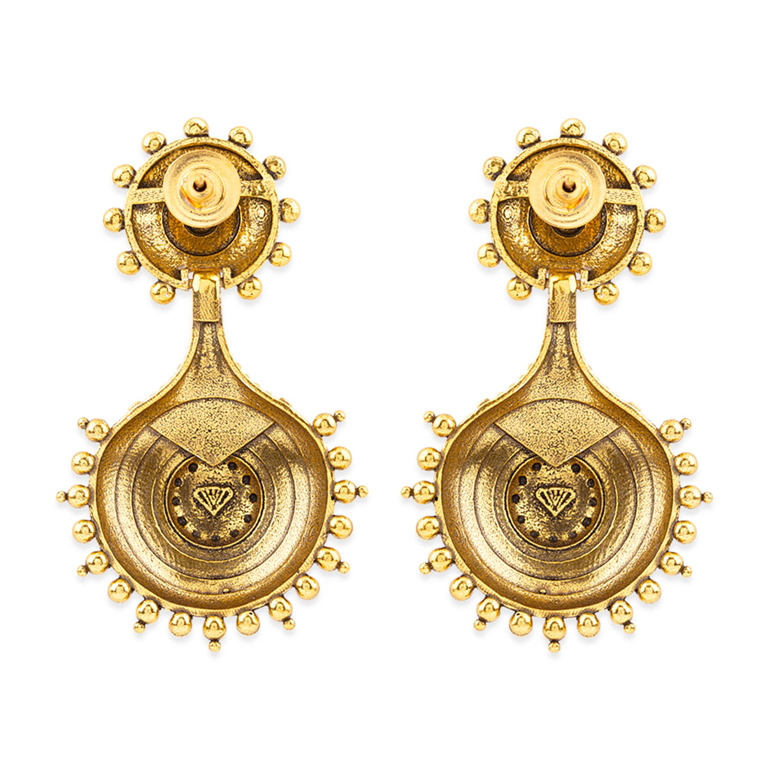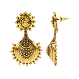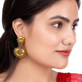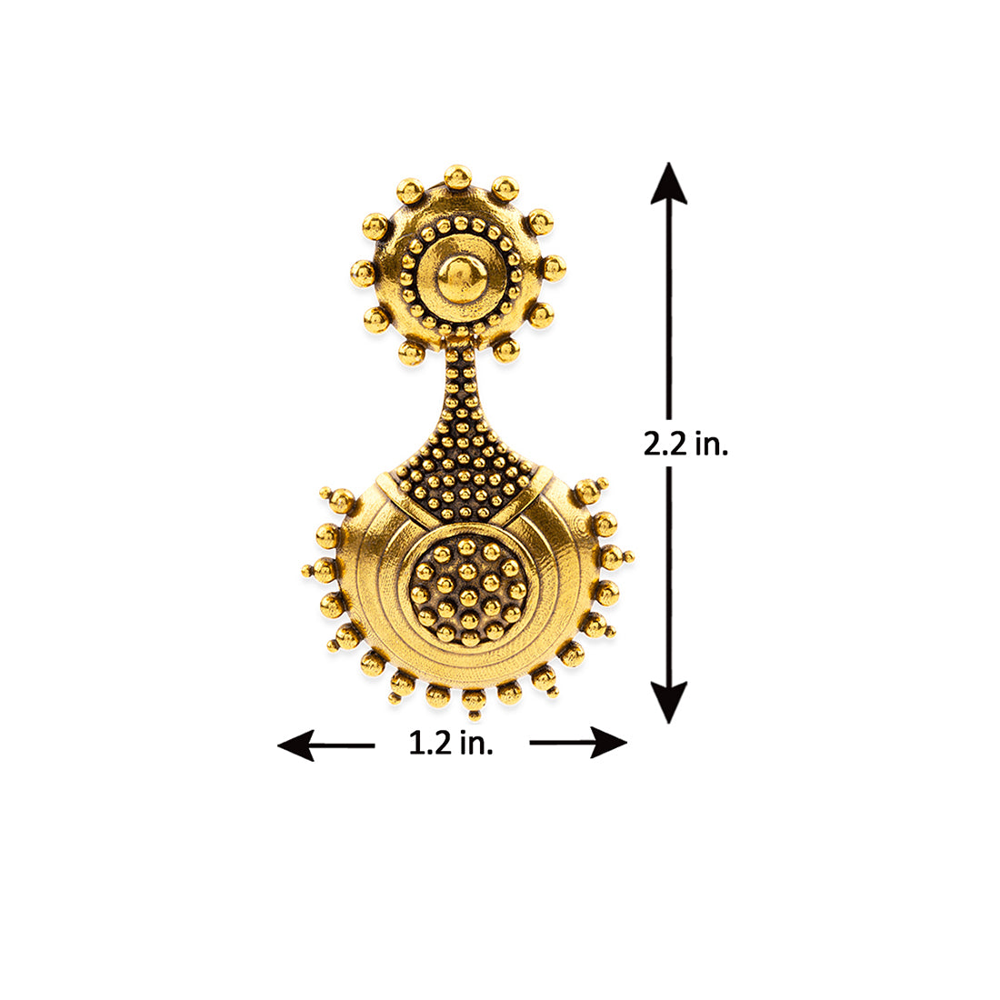 Add luster to your ethnic look by donning these trendy earrings. This brass pair has given an oxidized gold finish that gives out an exquisite sense of style. Accessorize your simple kurta with a pair of these earrings.Weight (Gms): 10.08Size...