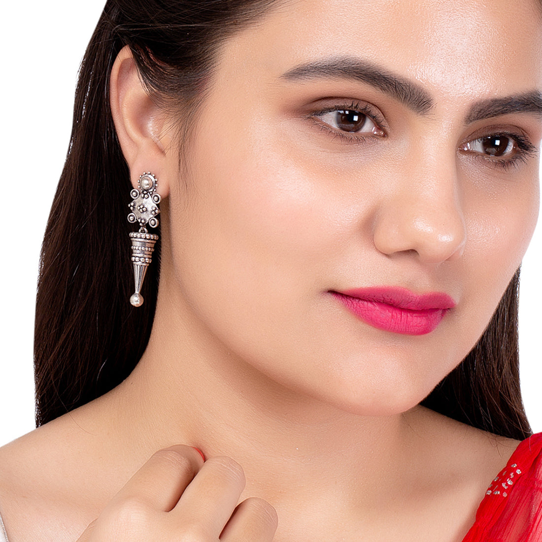 Add luster to your ethnic look by donning these trendy earrings. This brass pair has given a silver oxidized finish that gives out an exquisite sense of style. Accessorize your simple kurta with a pair of these earrings.Weight (Gms): 10.03Size...