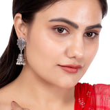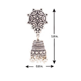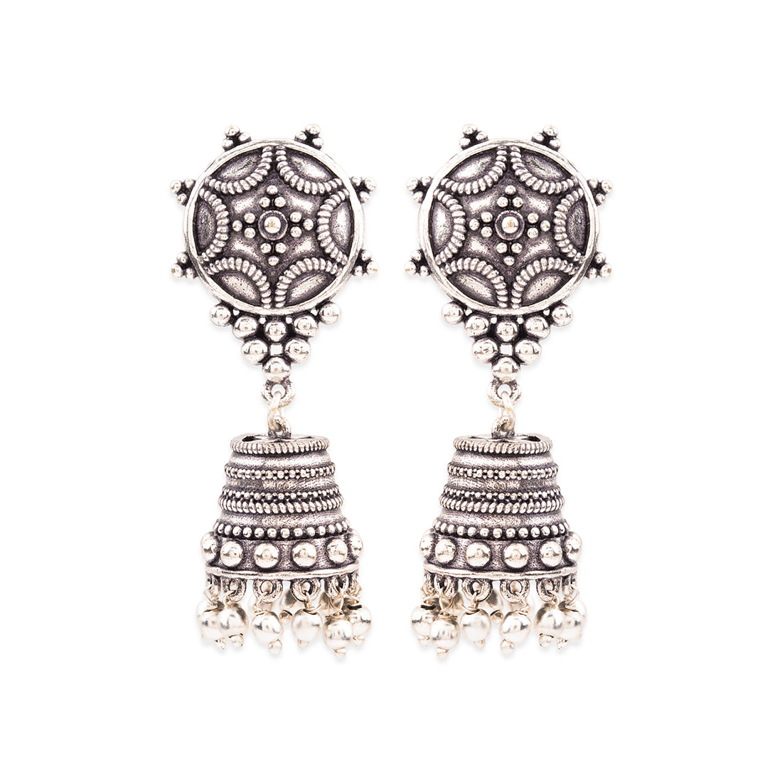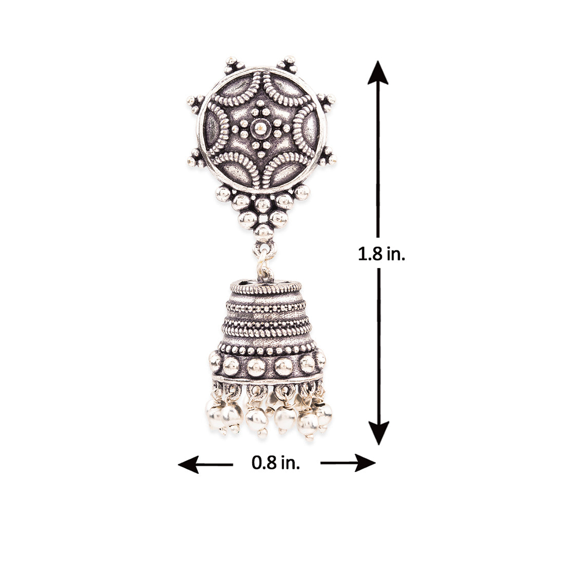 Add luster to your ethnic look by donning these trendy earrings. This brass pair has given a silver oxidized finish that gives out an exquisite sense of style. Accessorize your simple kurta with a pair of these earrings.Weight (Gms): 10.03Size...