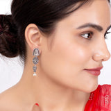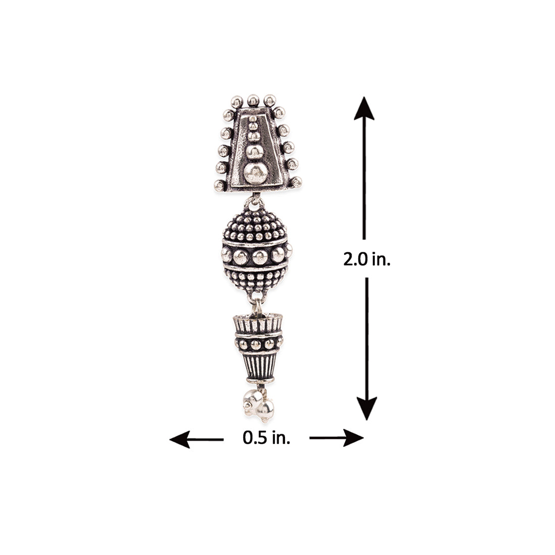 Add luster to your ethnic look by donning these trendy earrings. This brass pair has given a silver oxidized finish that gives out an exquisite sense of style. Accessorize your simple kurta with a pair of these earrings.Weight (Gms): 10.03Size...