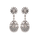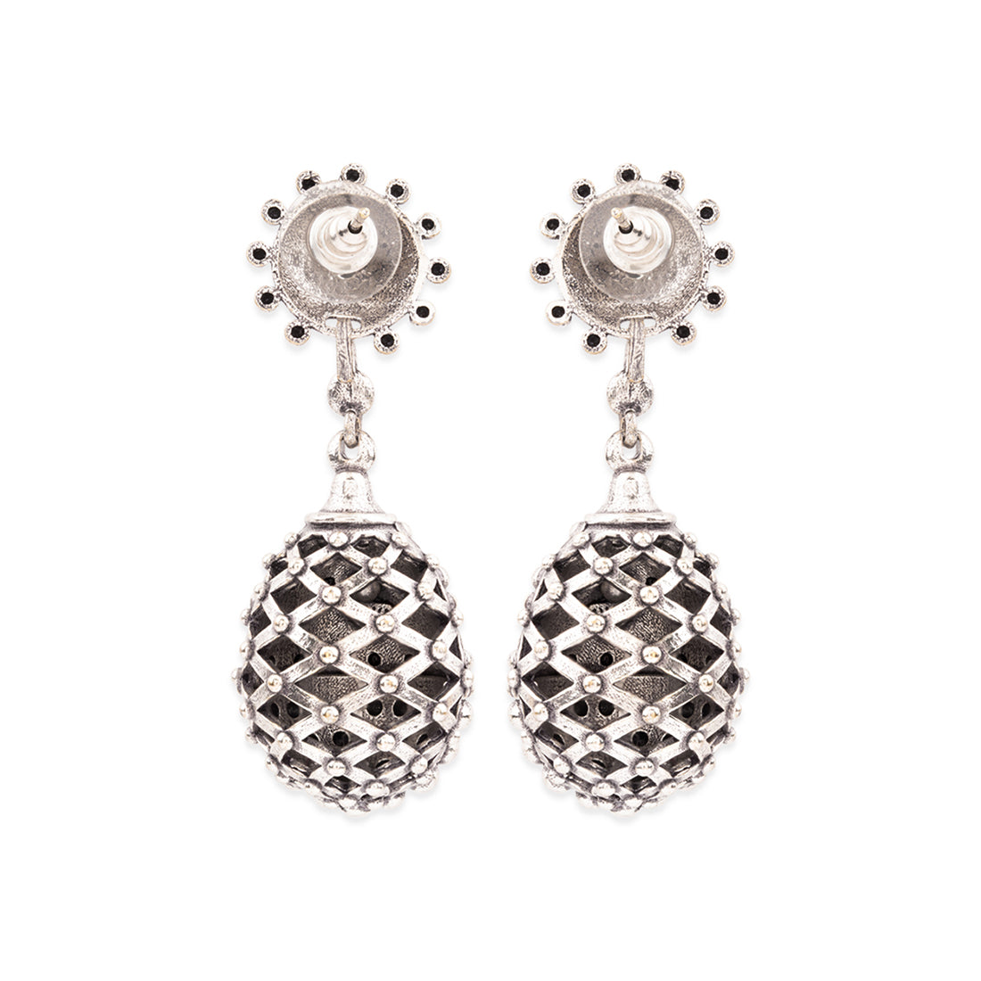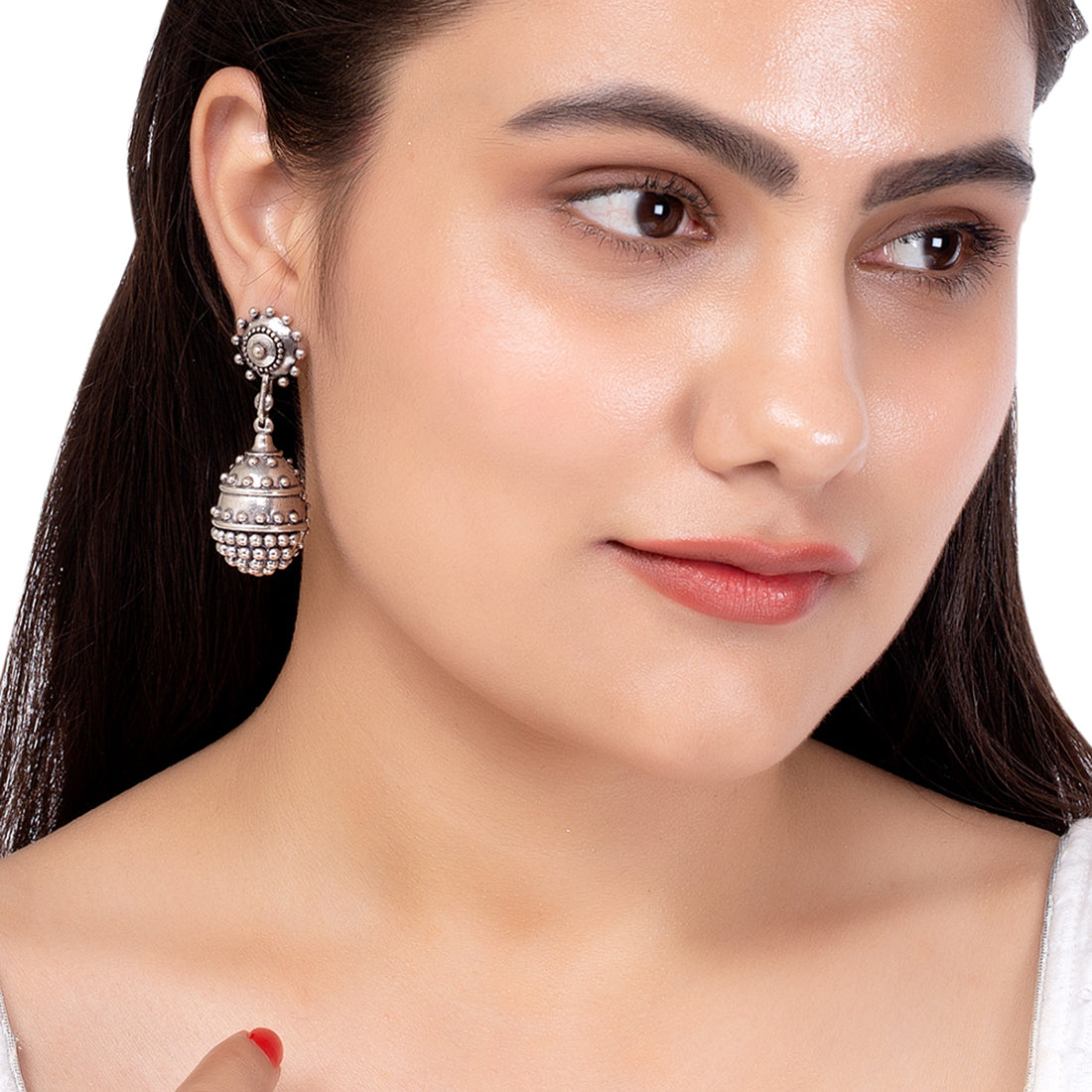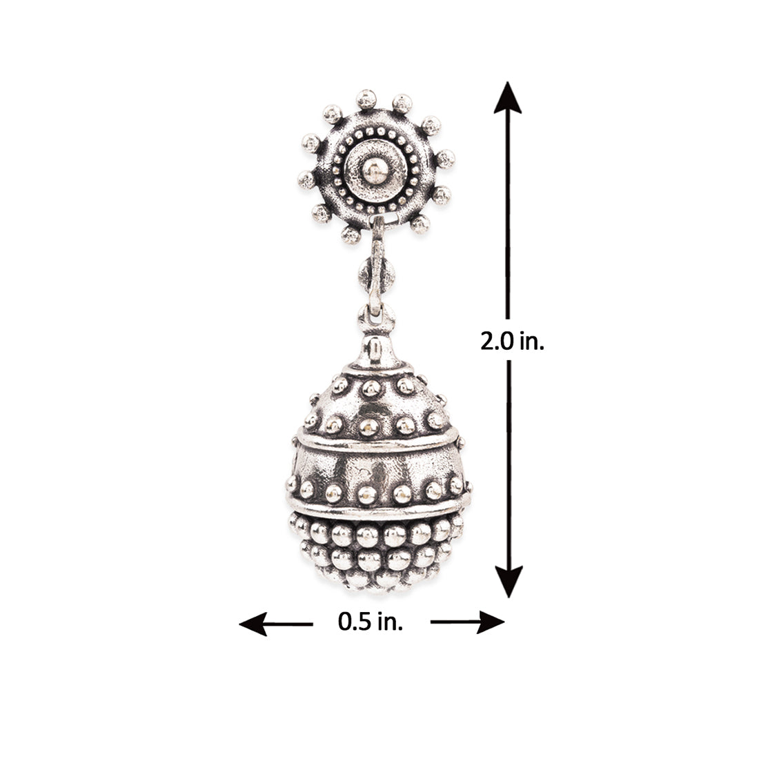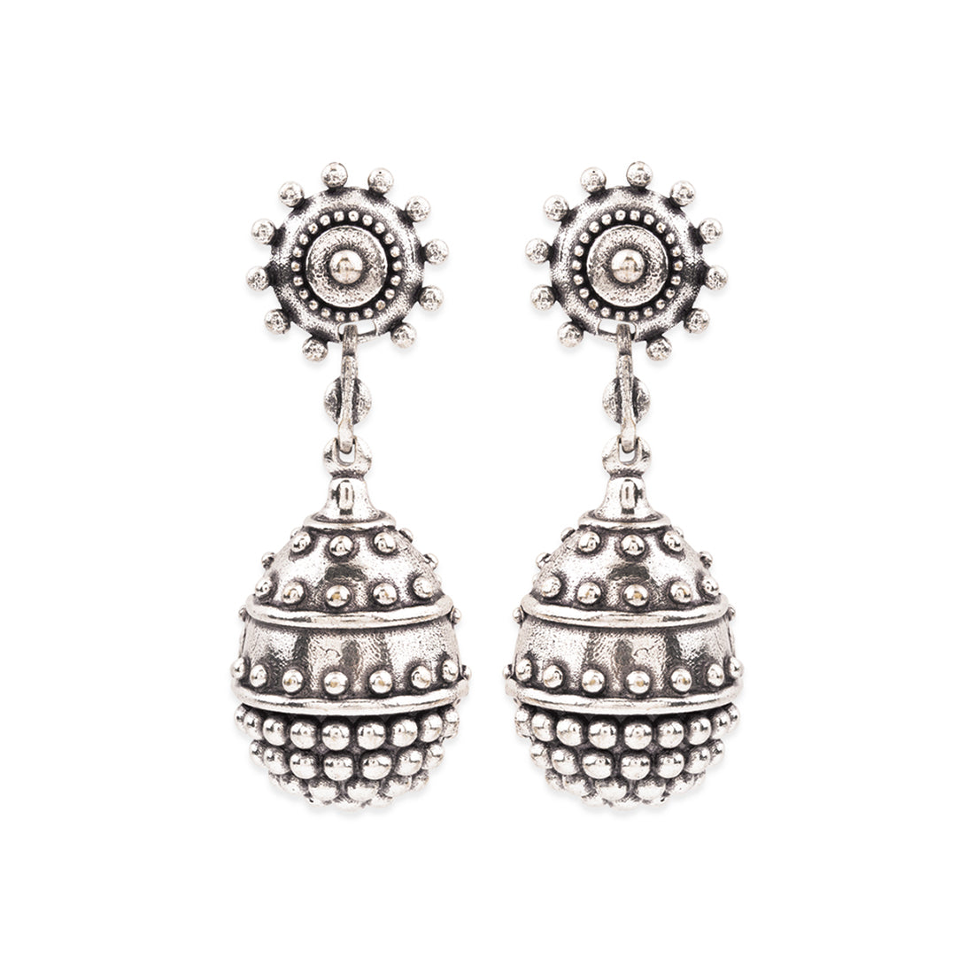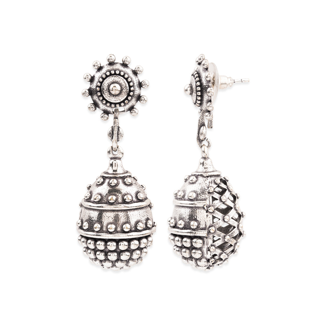 A pair of Rava Ball earrings make for the perfect adornment for this wedding season. Crafted with brass with a silver oxidized finish, this brass pair can go well with an Indian or Indo Western look