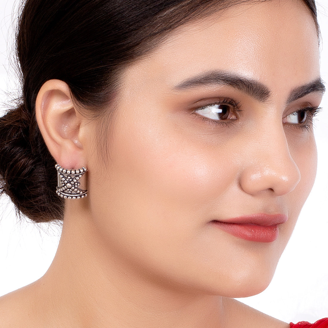 Grab your daily wear or work from home look with these brass stud earrings. This pair has given a shiny plating of silver oxidized. You can accessorize them with casual or formal wear.Weight (Gms): 5.68Size (LxW)(Inch): 0.55*0.6Material: BrassPlating: Oxidized Silver...
